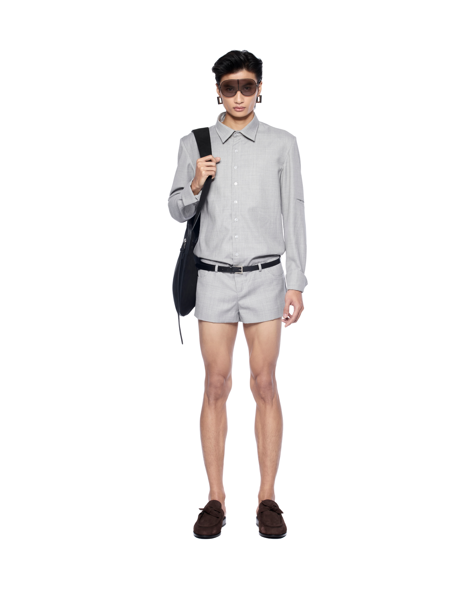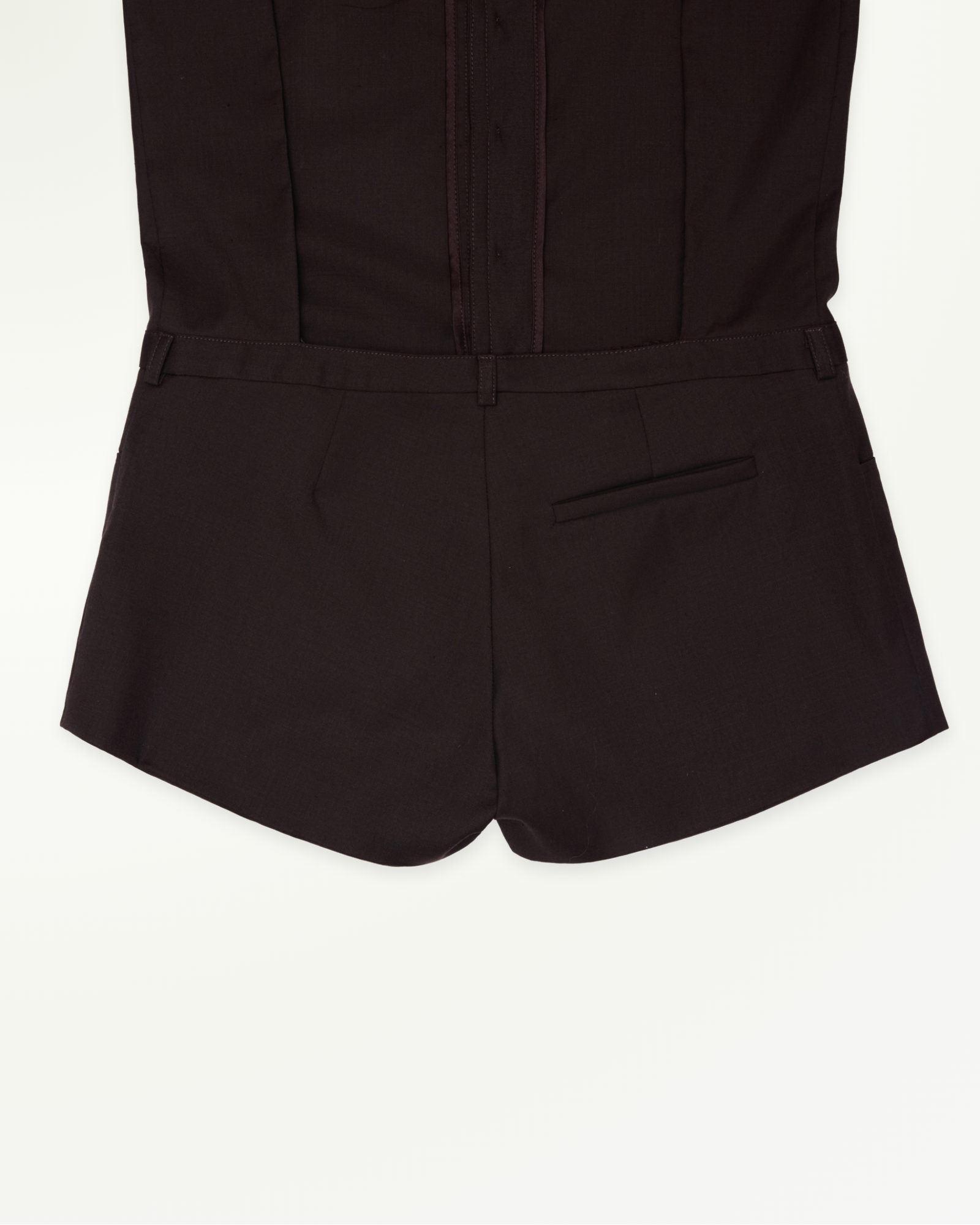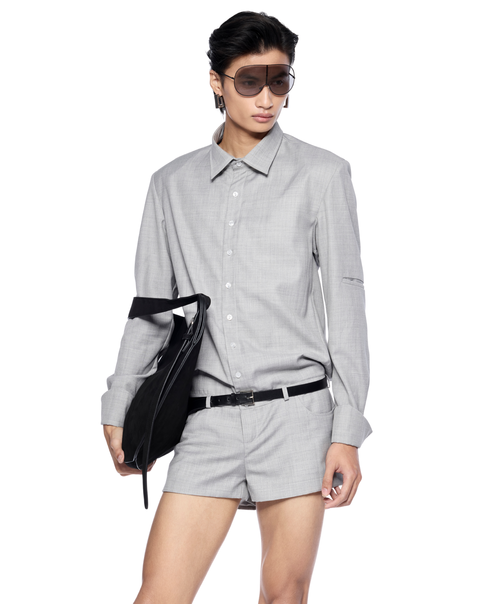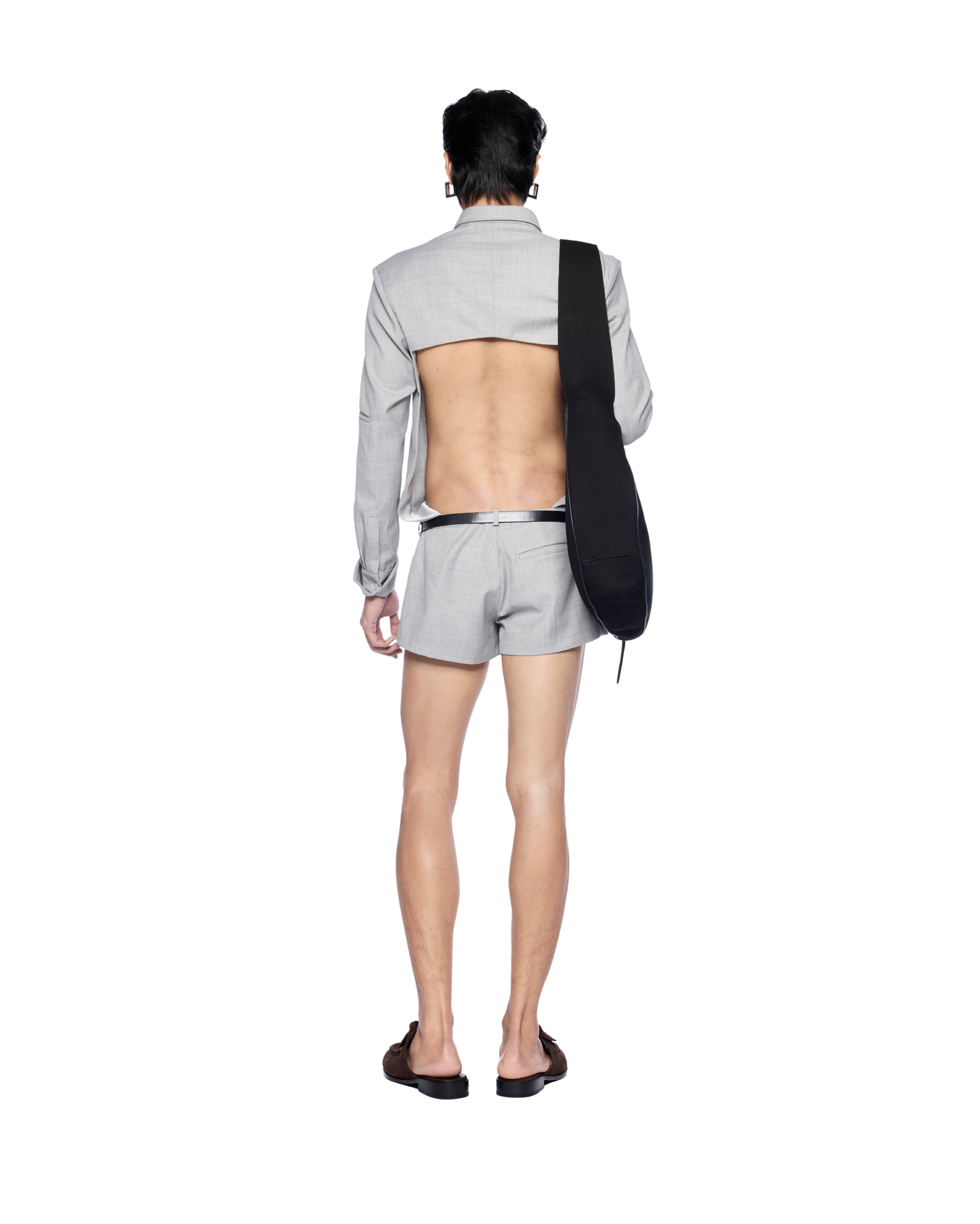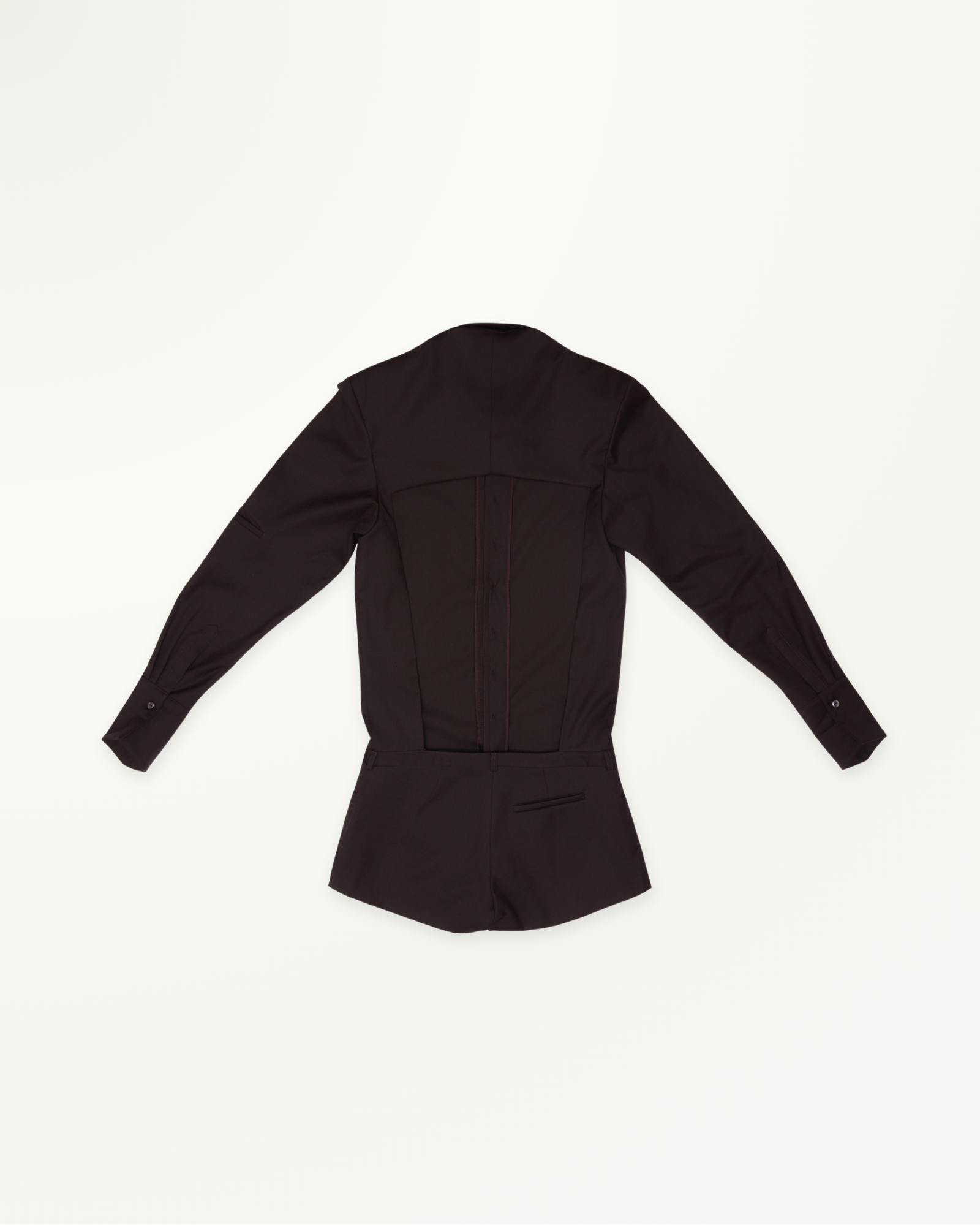 Shirt-style bodysuit reimagined with an open-back cut. It creates a sharp yet playful silhouette. Works well with a structured bag and statement belt