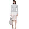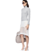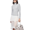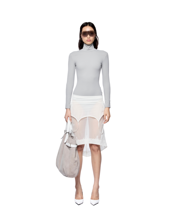 A sleek jersey turtleneck bodysuit with long sleeves and a back zip closure, hugging the body for a streamlined silhouette. Pair it with a sheer midi skirt, low-rise trousers, or a small handheld bag for a modern, chic look.