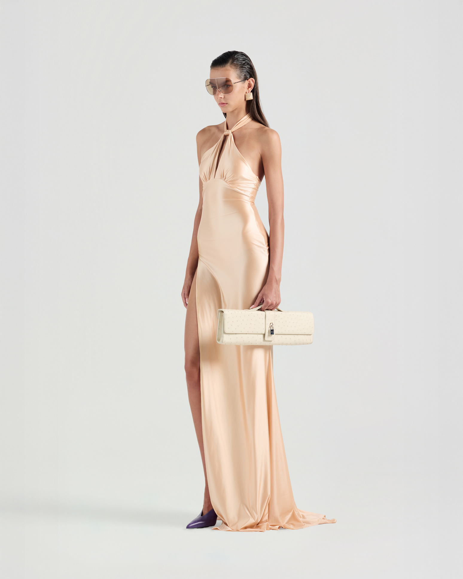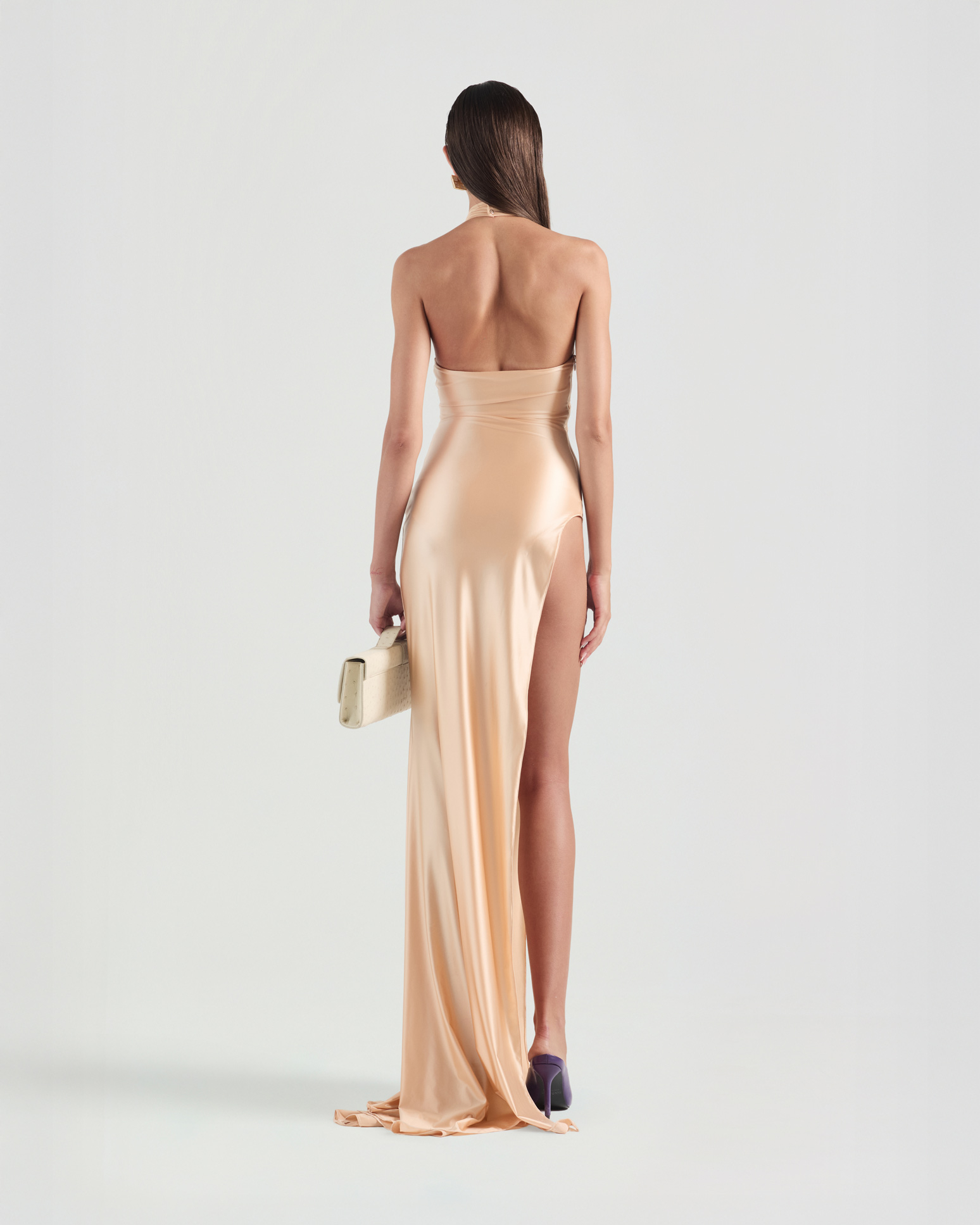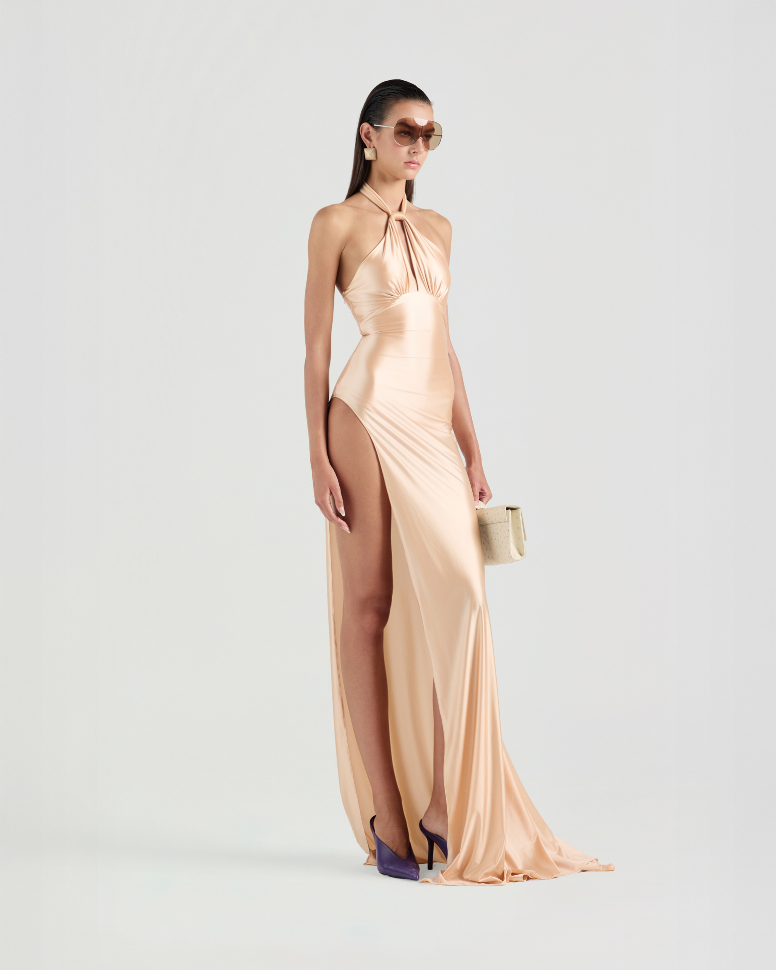 Designed with a halterneck silhouette, this long dress drapes fluidly along the body and features a thigh-high slit for striking movement. A deep keyhole cut with a twisted neckline creates a bold focal point. Finished with a built-in bodysuit.