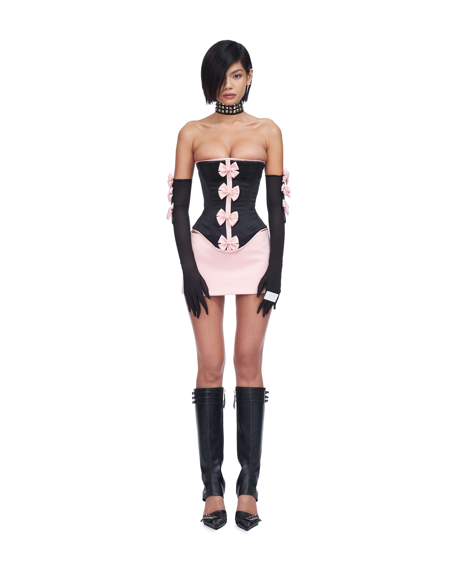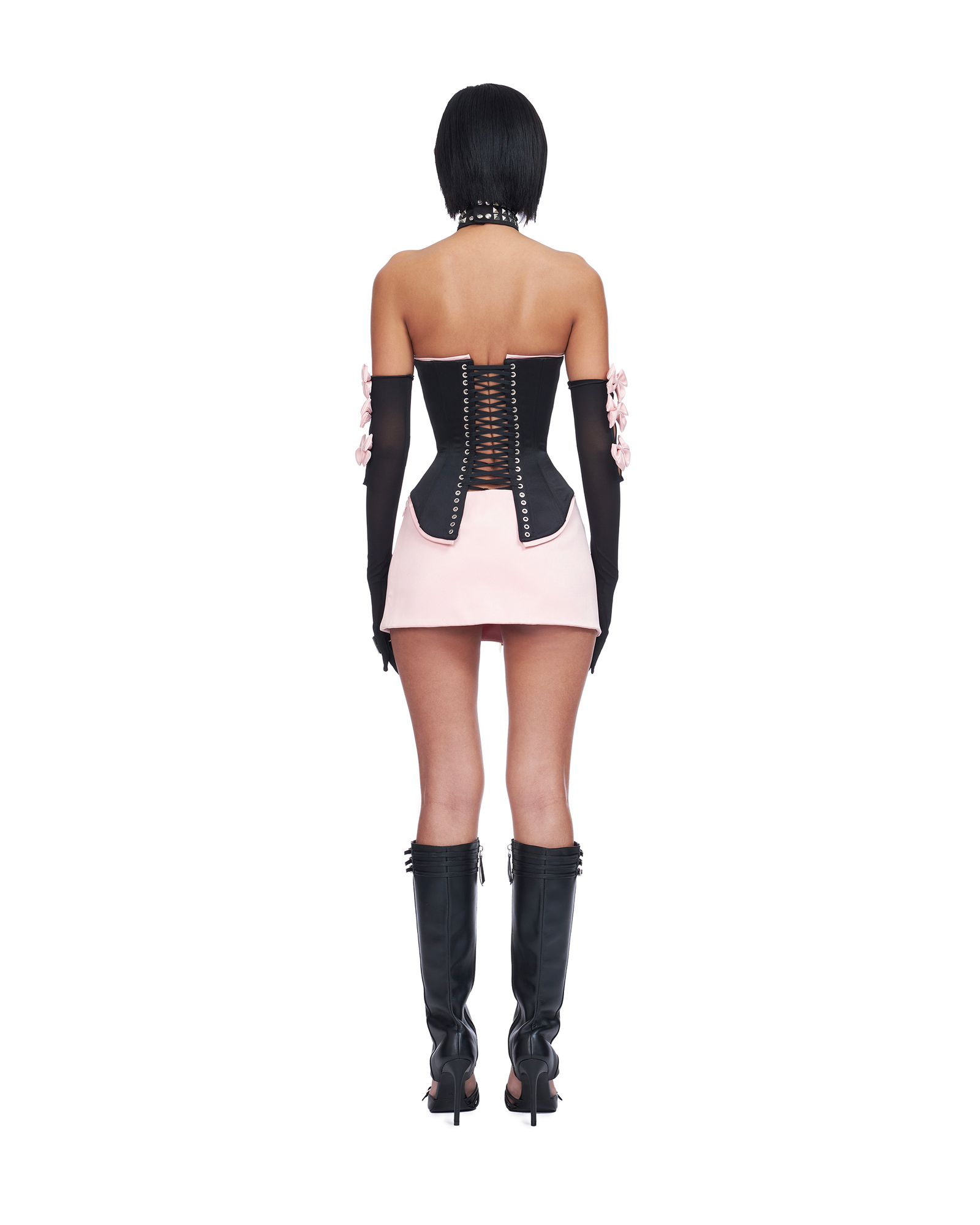 Double layered satin corset with busk and bow details