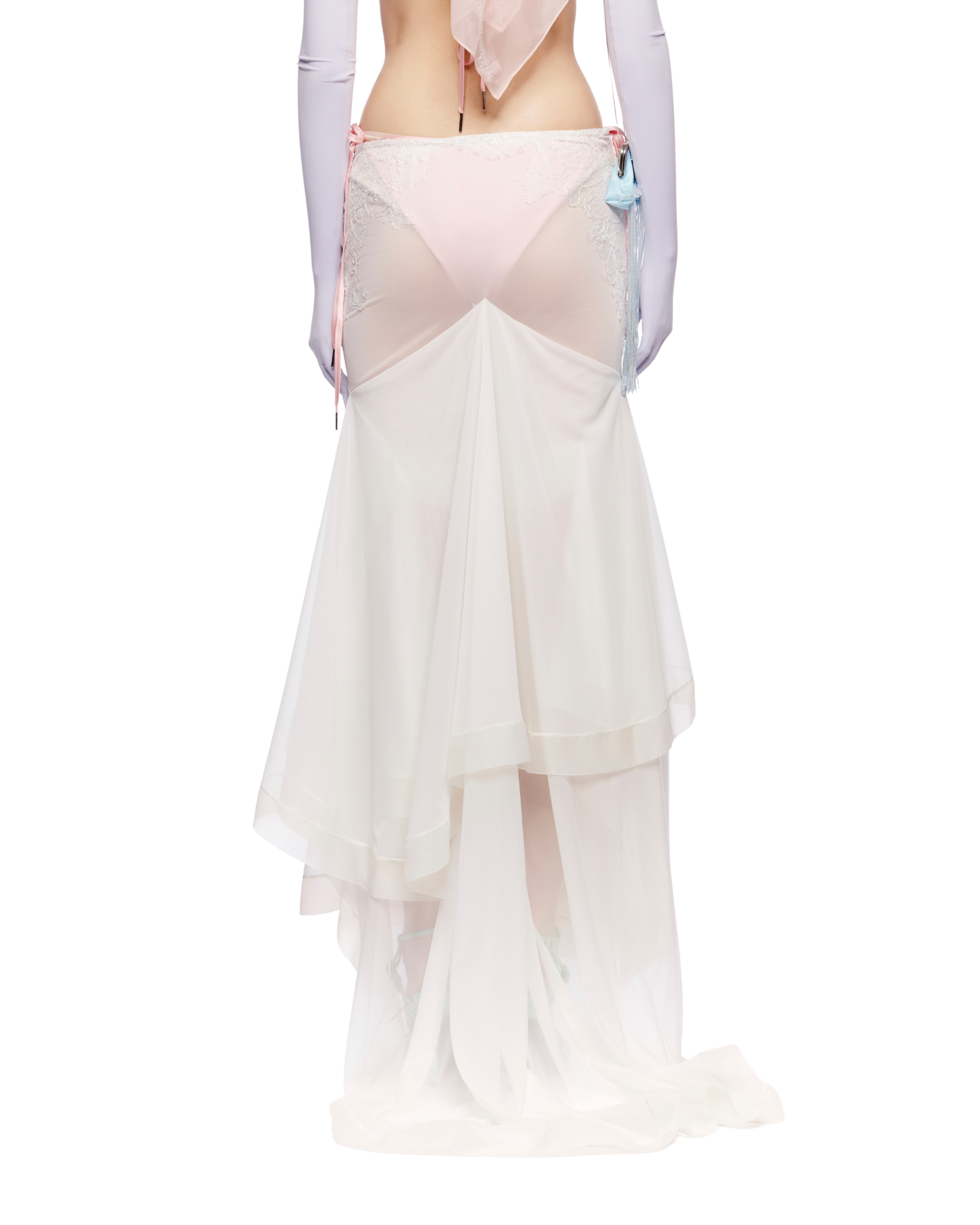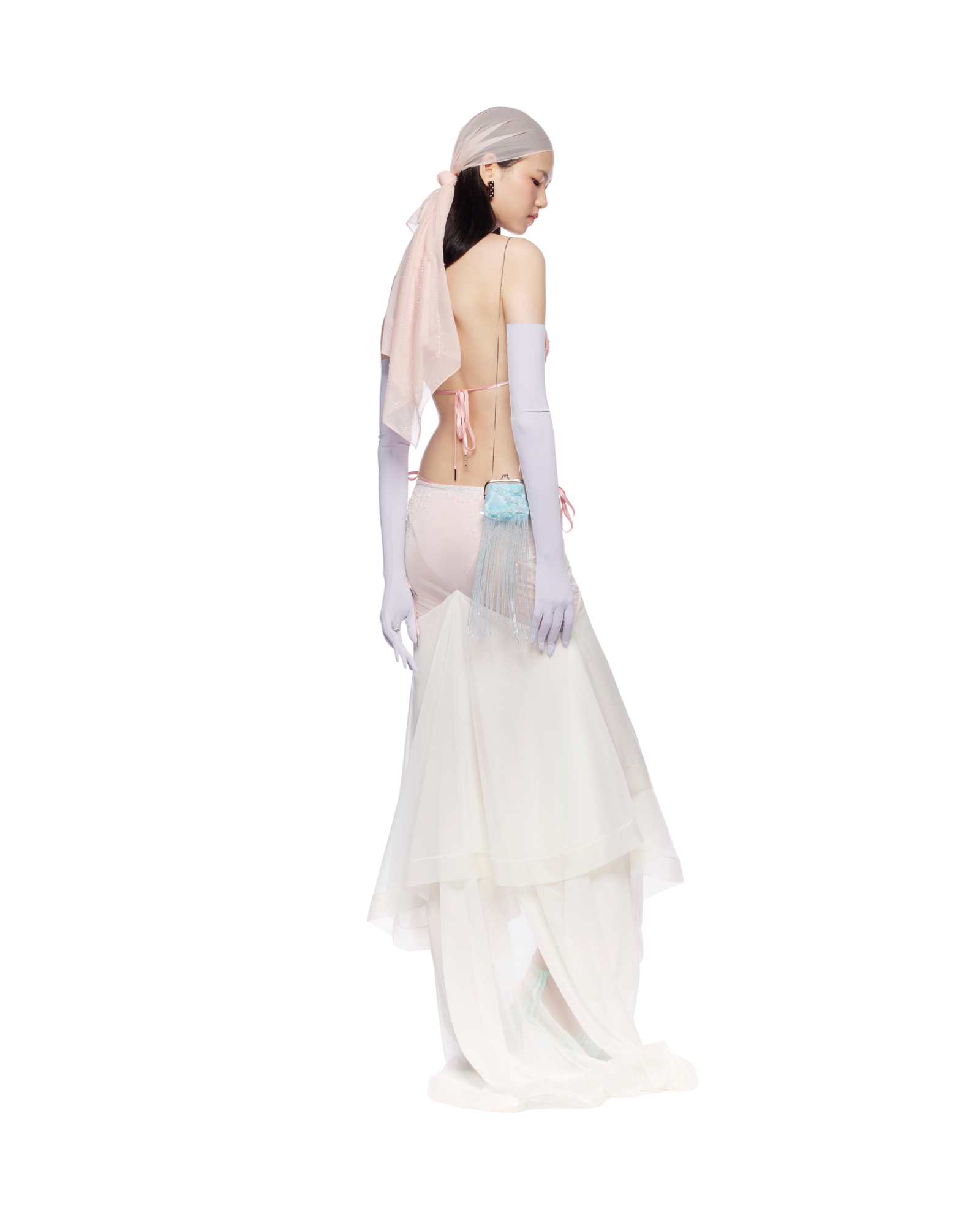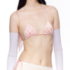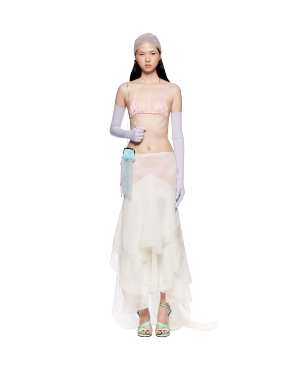 This bikini set is crafted in lustrous silk, adorned with hand-beaded floral trims at the triangle cups. It comes with matching bottoms for a complete set. Style it with a mini skirt, long gloves, and a handheld bag for a refined evening statement.