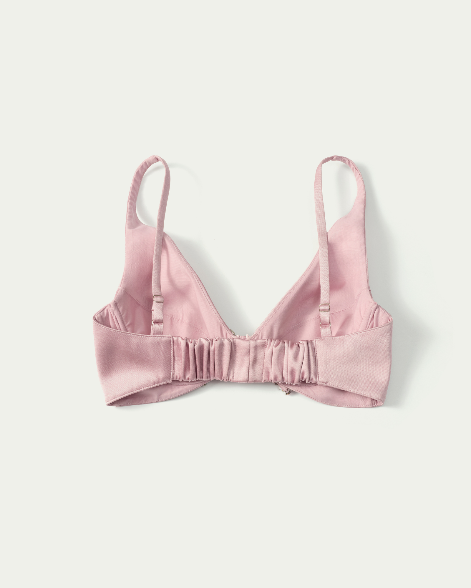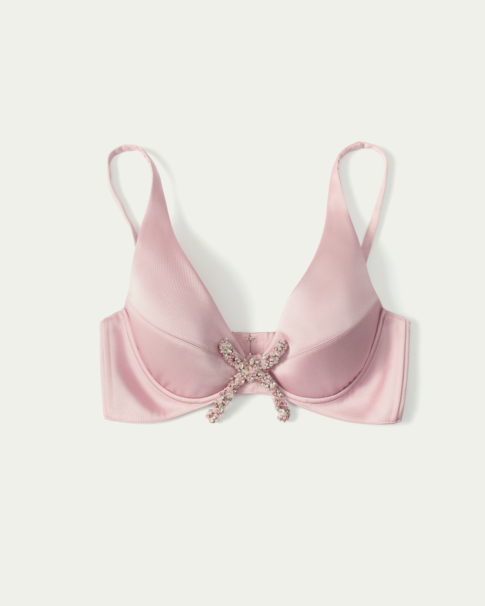 Bow-embellished silk bra top featuring a plunging neckline with underwired cups for a softly sculpted, supportive fit. A crystal-embellished bow at the center front creates a refined focal point, adding a subtle couture sparkle.