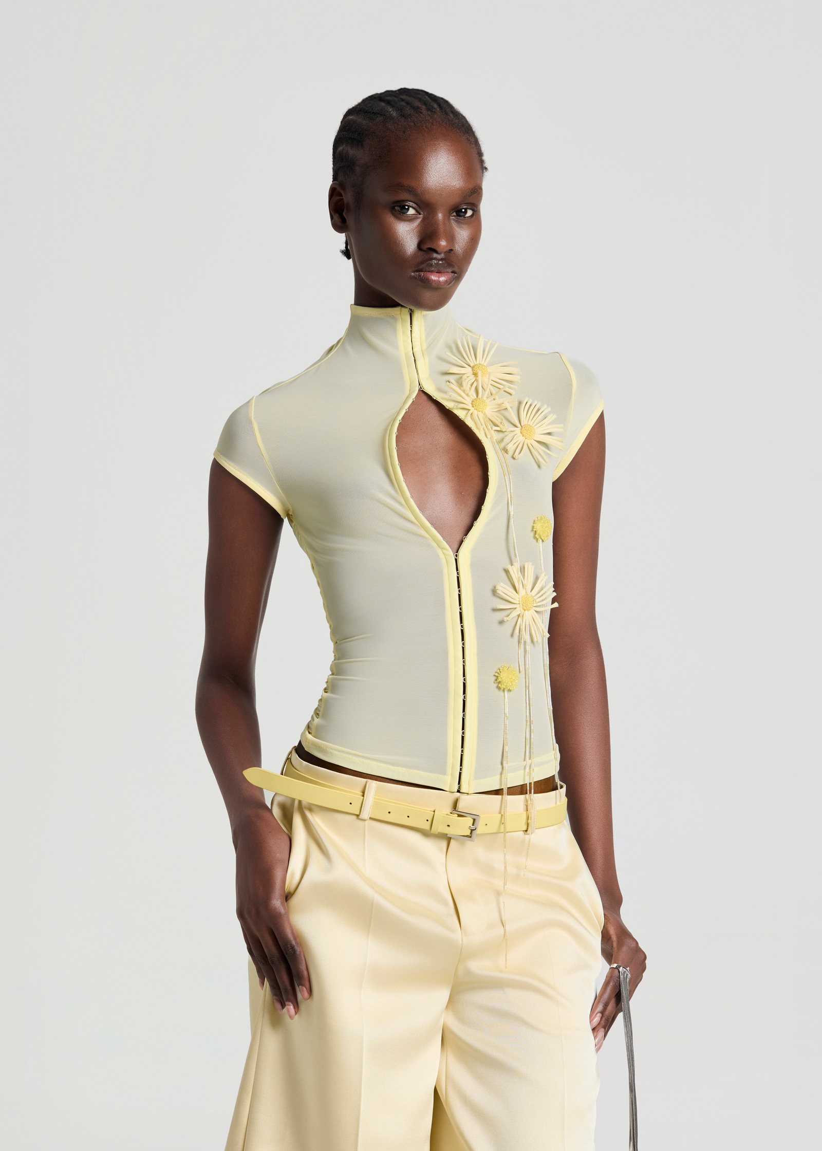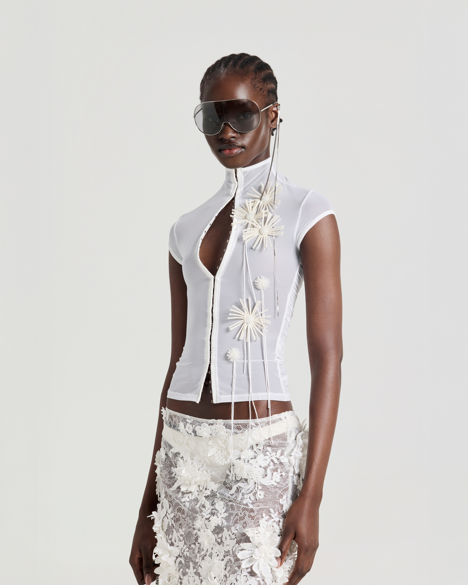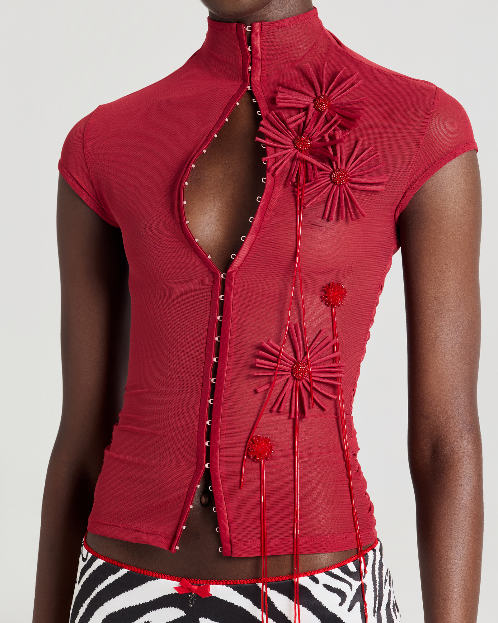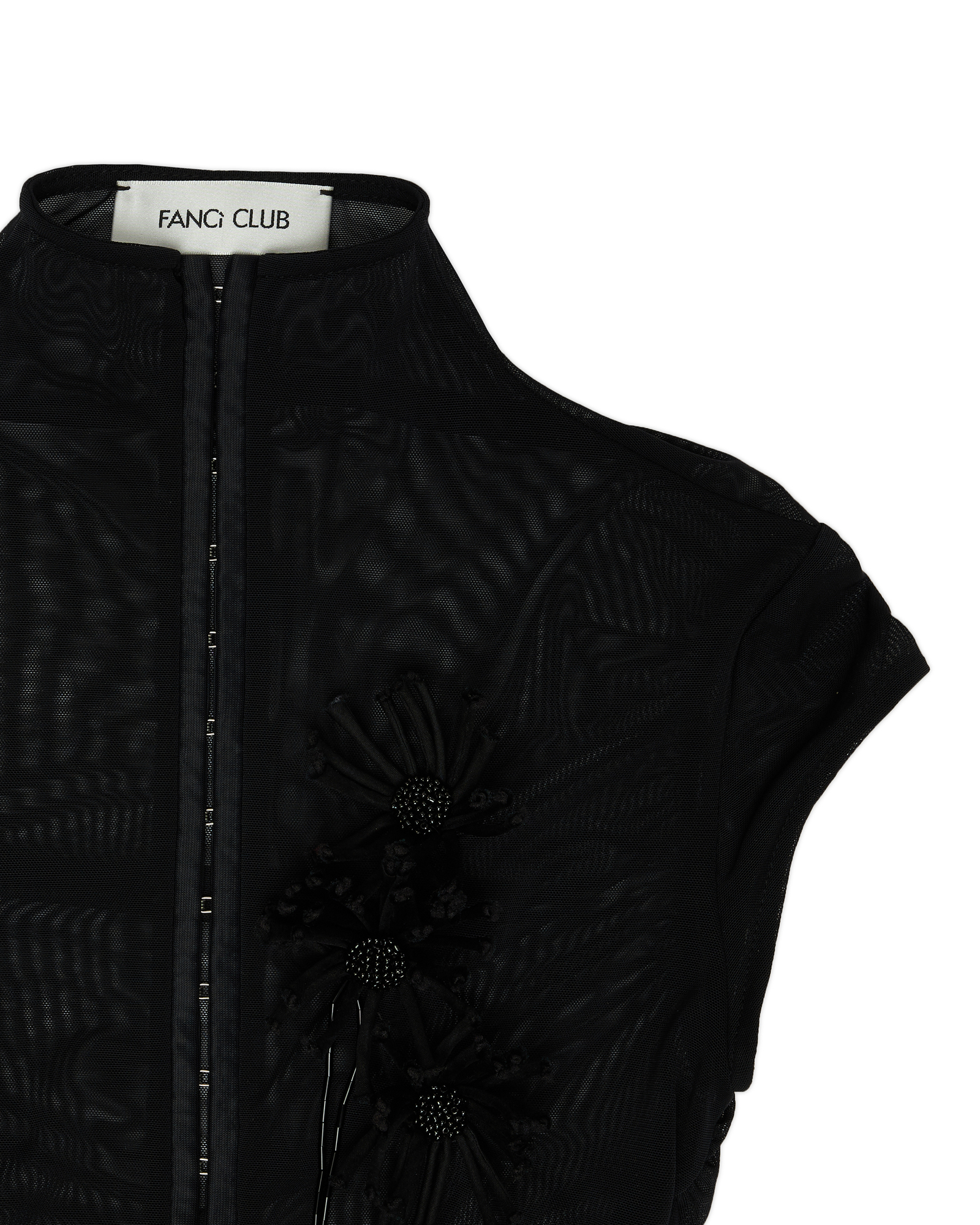 Mock neck mesh top with flower