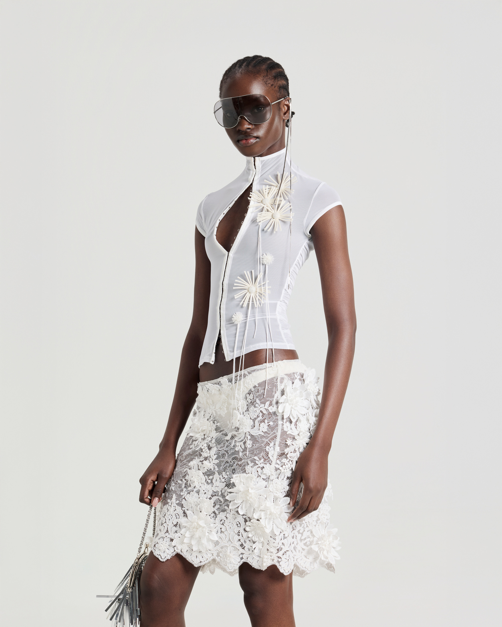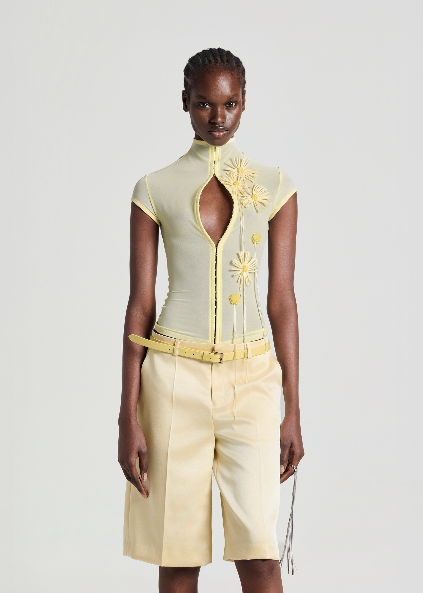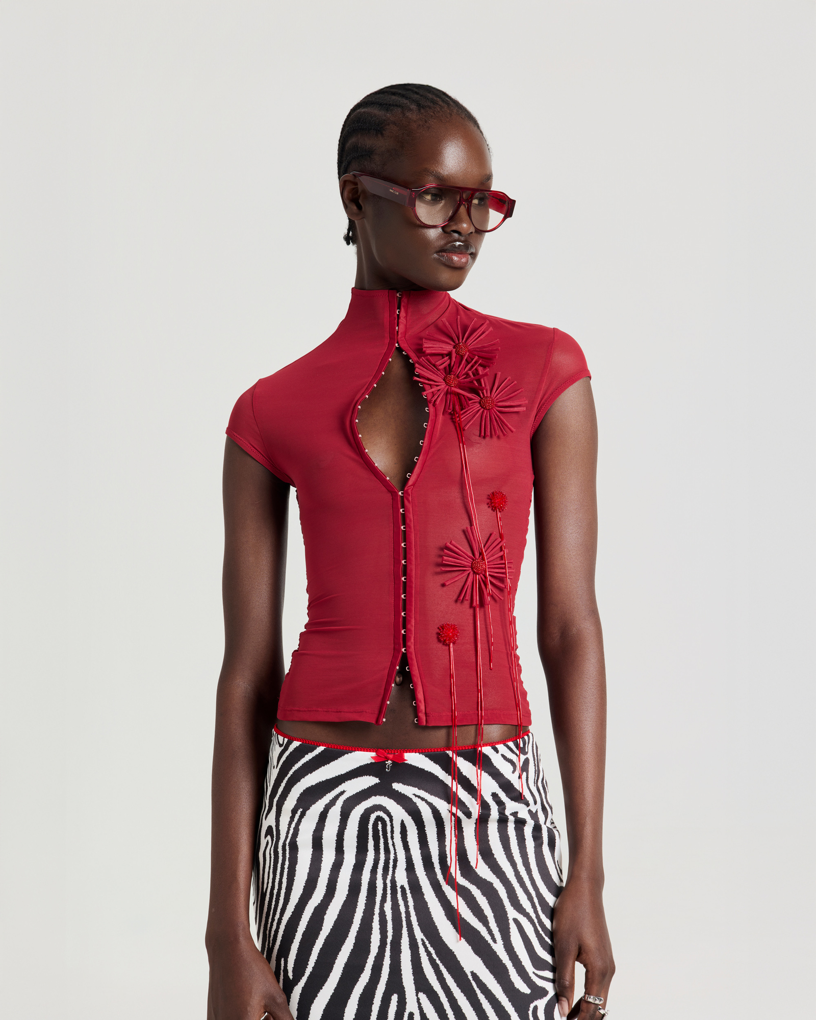 Mock neck mesh top with flower