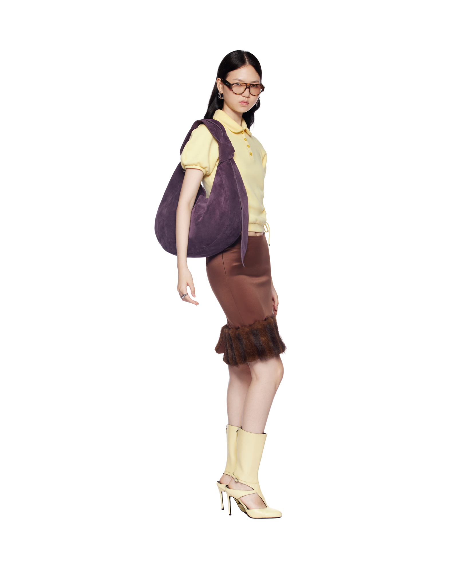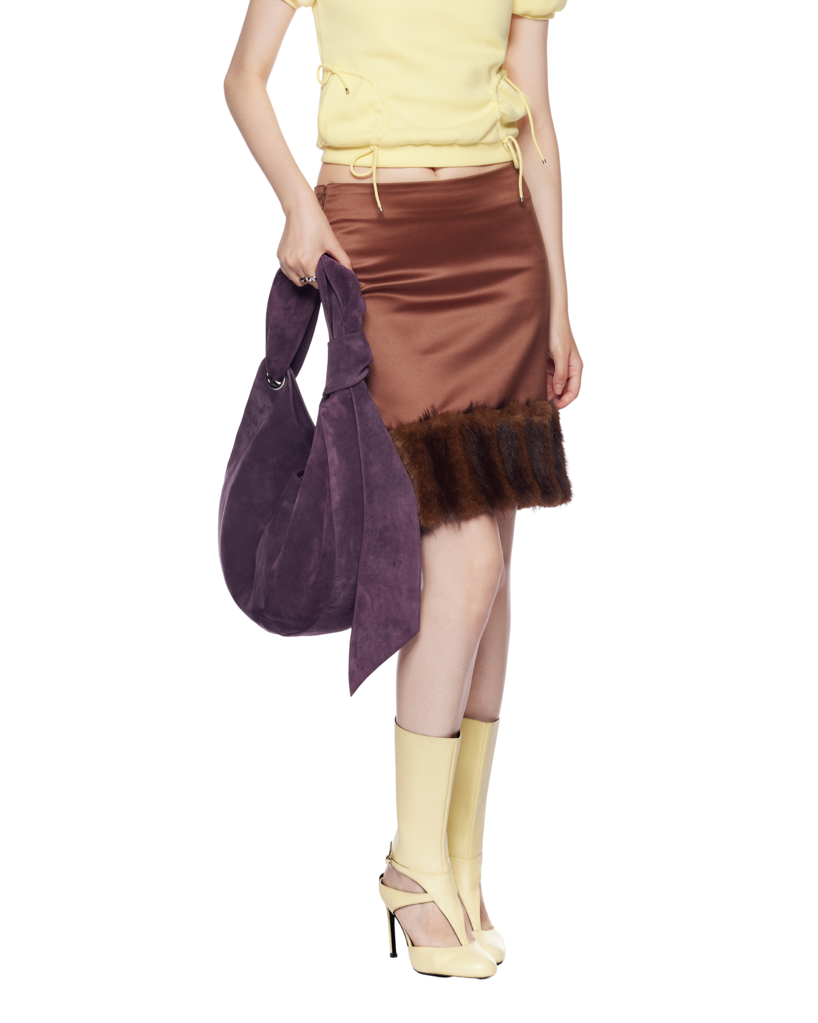 This warm-ish midi skirt combines classic pencil tailoring with a soft faux-fax hem, adding unexpected texture while keeping a sleek silhouette. Perfectly styled with a puff-sleeve polo, jacket or corset.