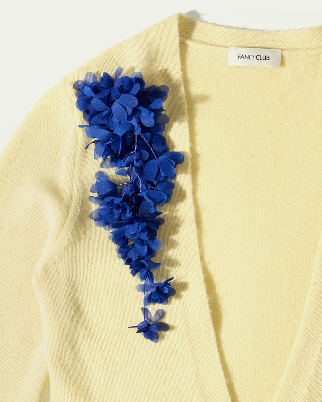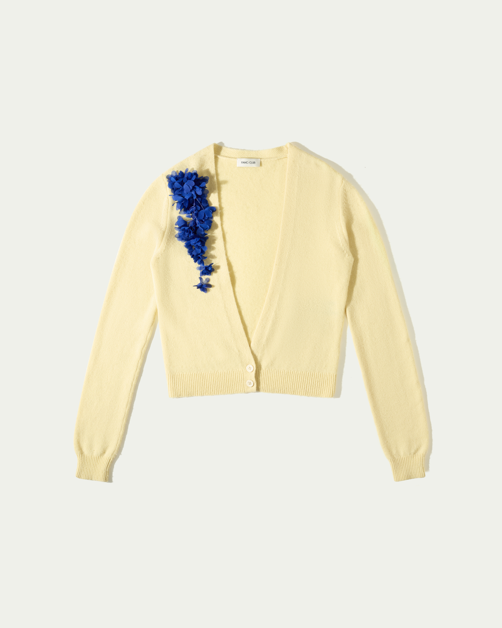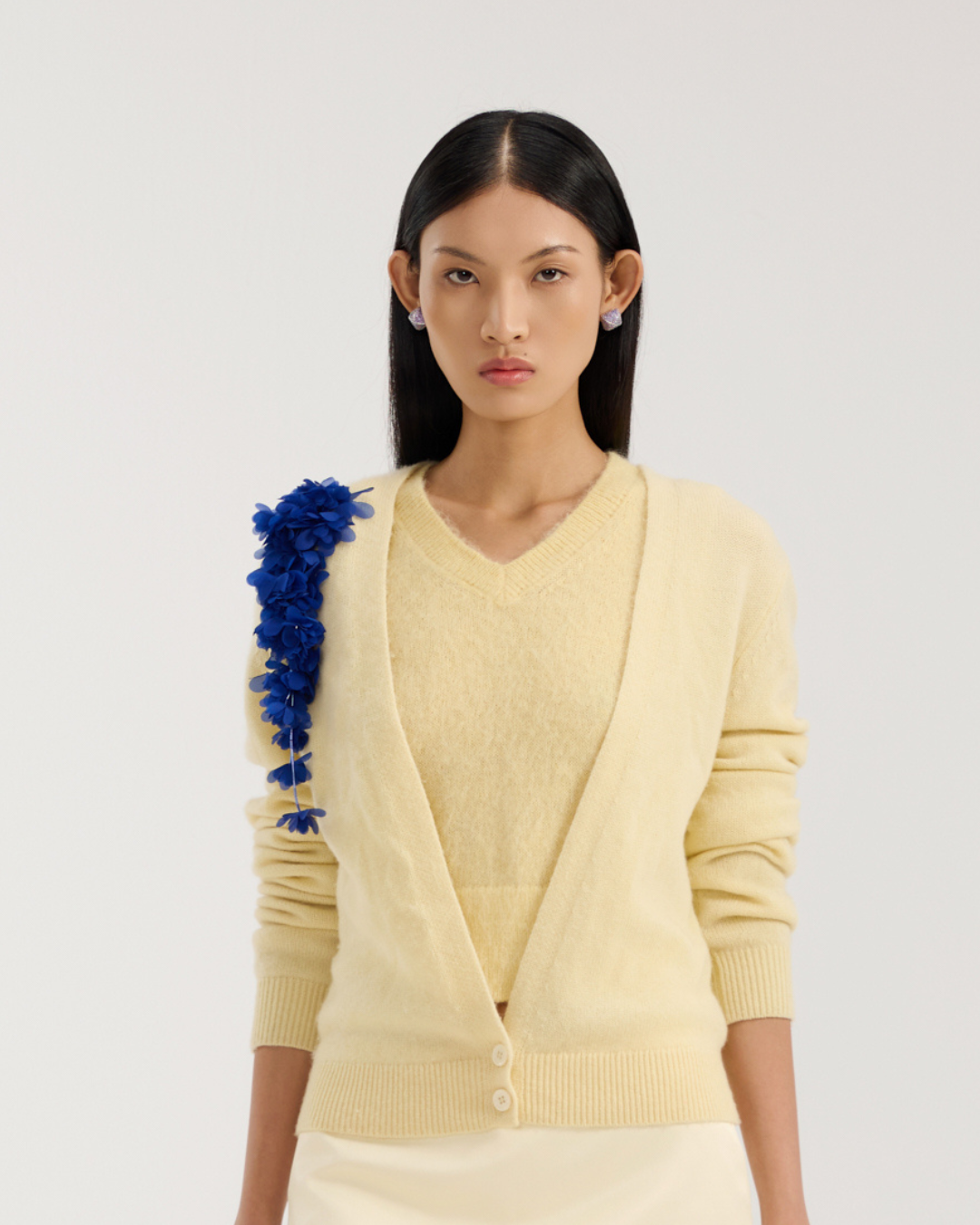 Wool cardigan with a plunging neckline, finished with a clustered 3D floral appliqué on one shoulder for an asymmetric touch. Warm and soft with an easy drape, it layers well over tees or shirts and pairs effortlessly with tailored trousers, jeans or shorts.