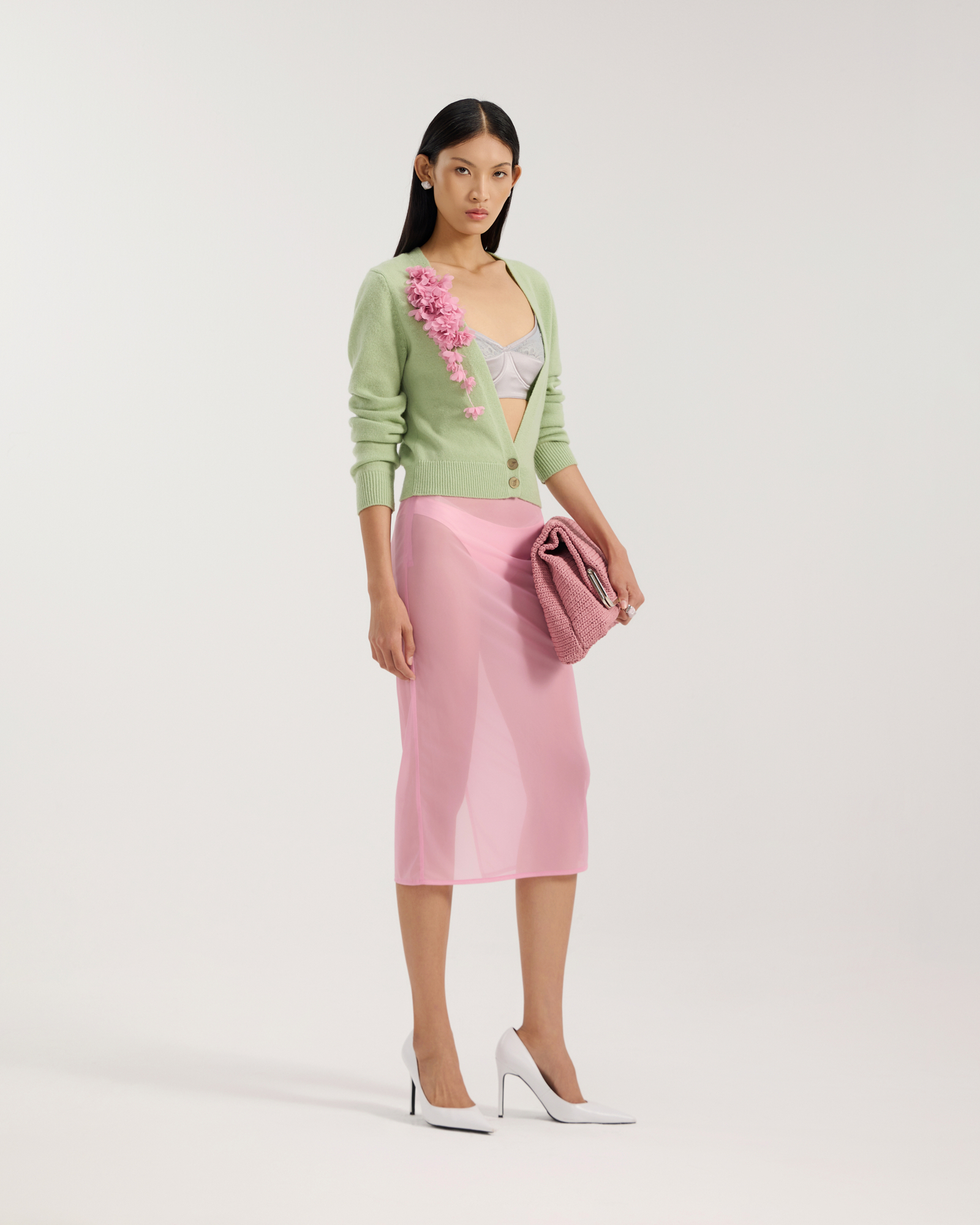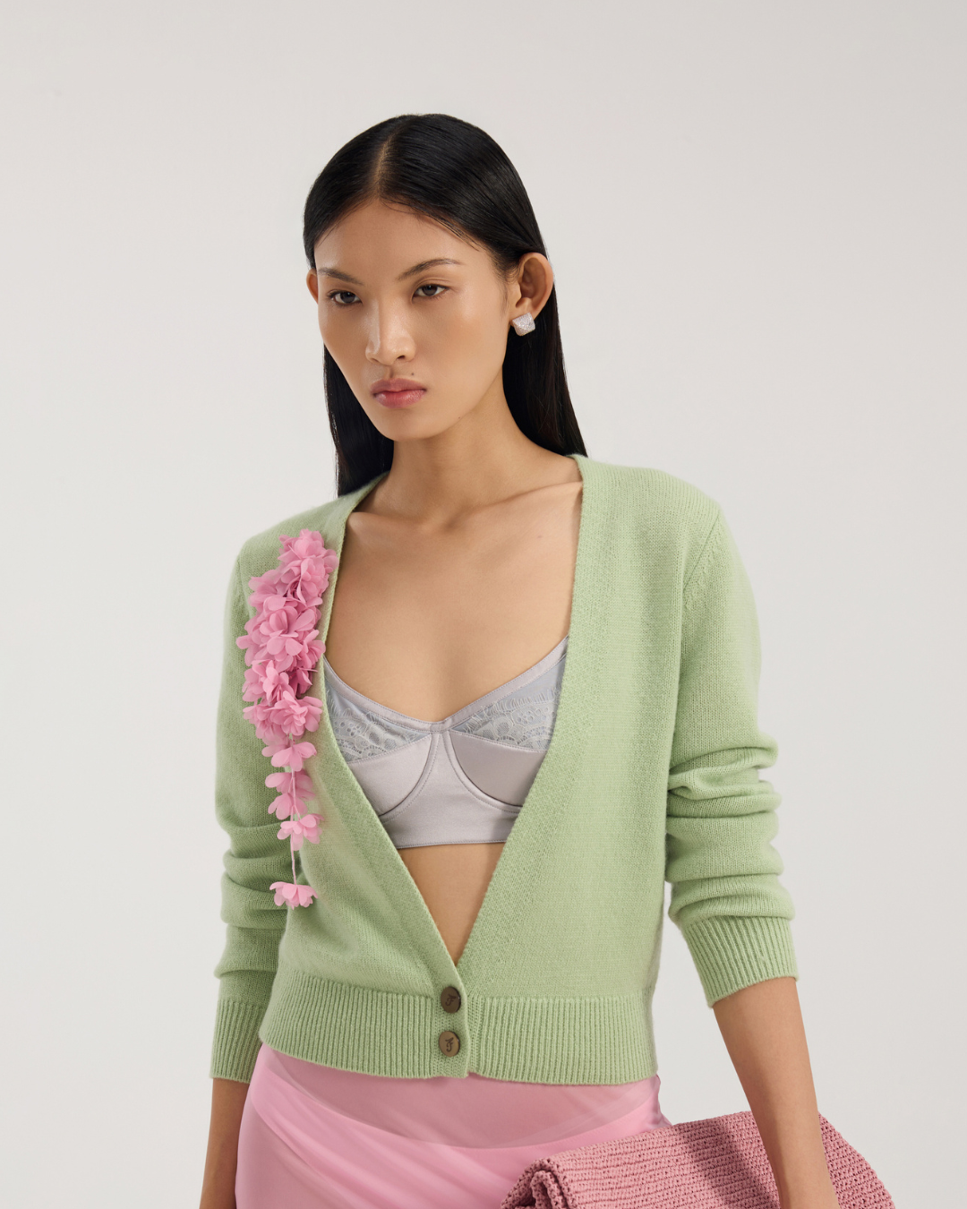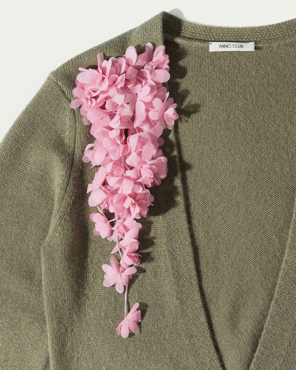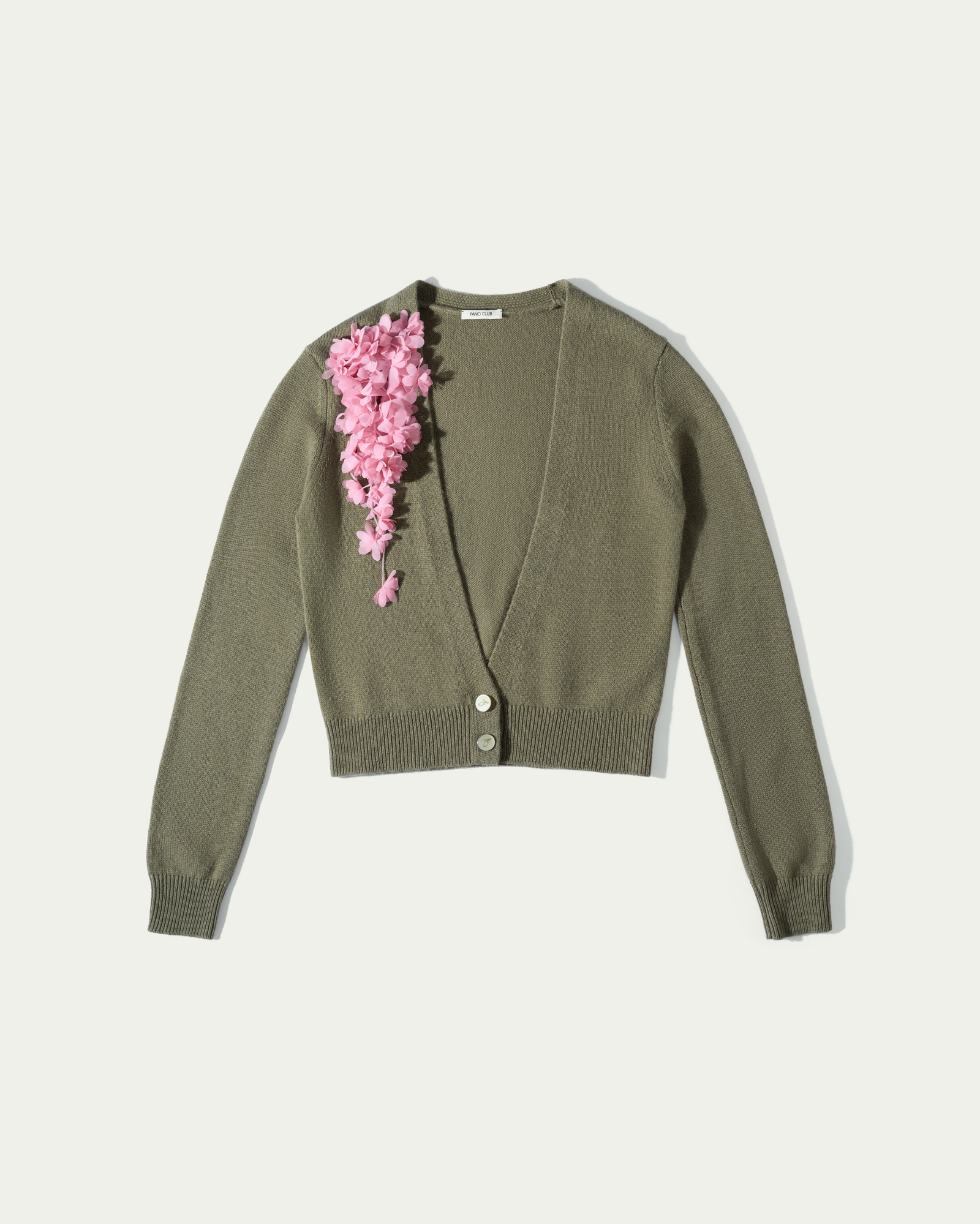 Wool cardigan with a plunging neckline, finished with a clustered 3D floral appliqué on one shoulder for an asymmetric touch. Warm and soft with an easy drape, it layers well over tees or shirts and pairs effortlessly with tailored trousers, jeans or shorts.