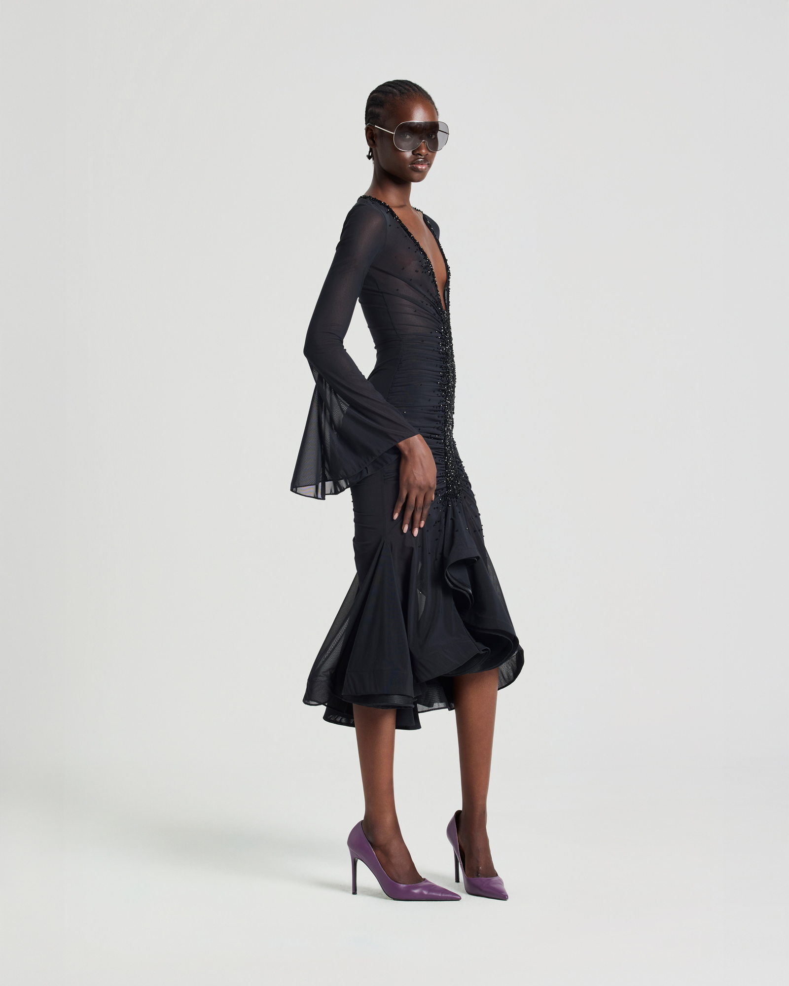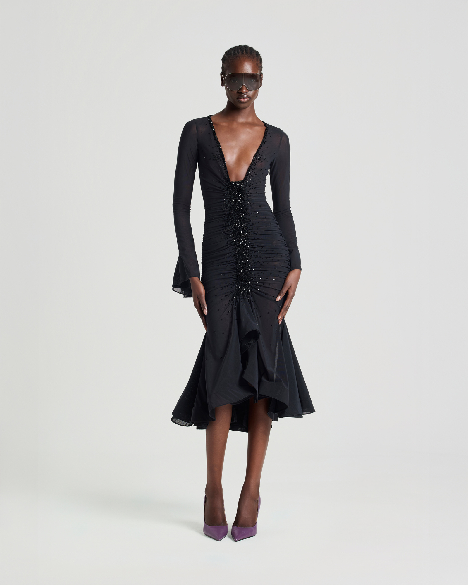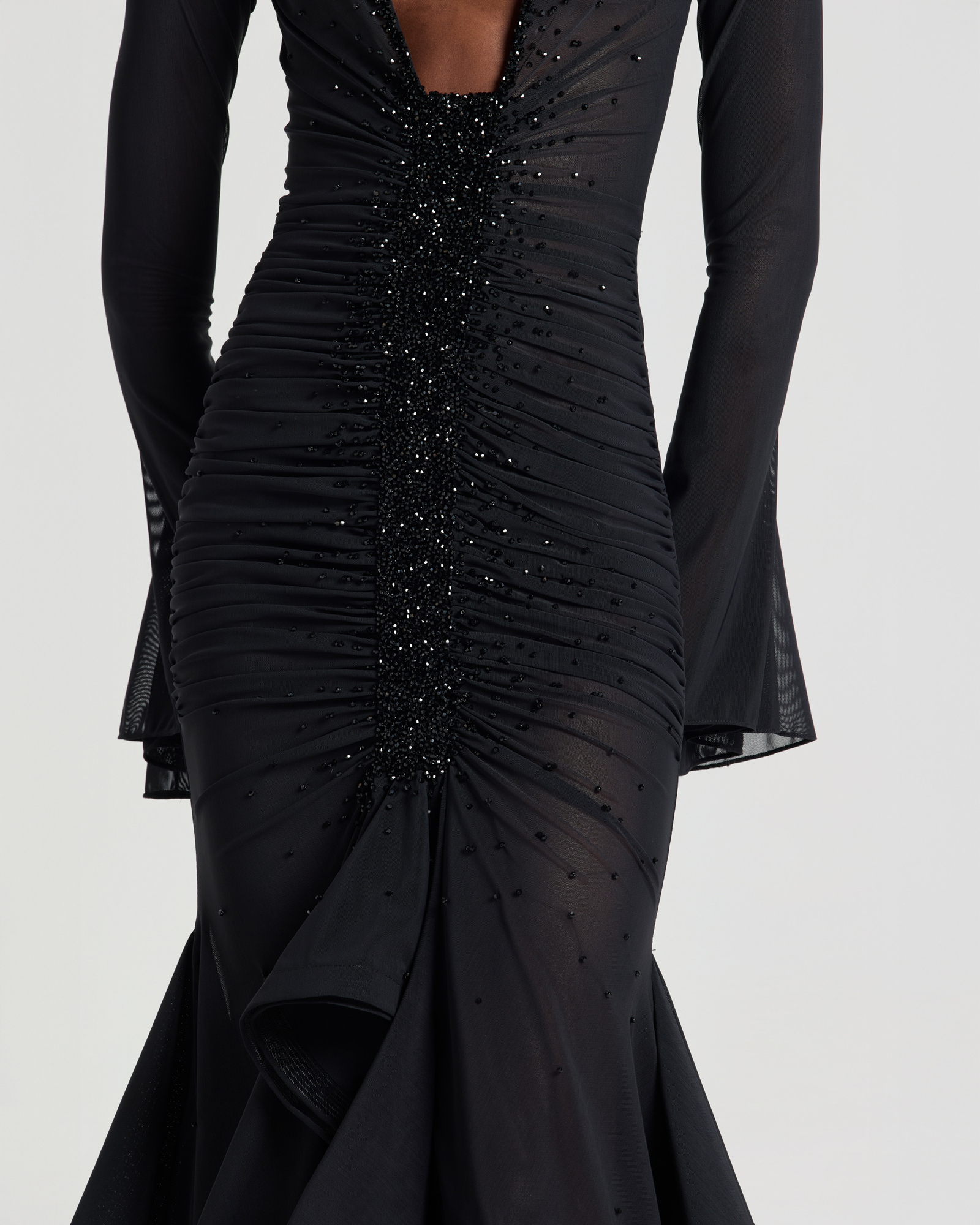 Ruched mesh midi dress with a plunging neckline and crystal embellishments along the neckline and center front for a sparkling, eye-catching effect, completed through sixteen hours of meticulous hand-finishing. Designed in a mermaid-hem silhouette that flatters the figure, with long flared sleeves adding a touch of elegance.