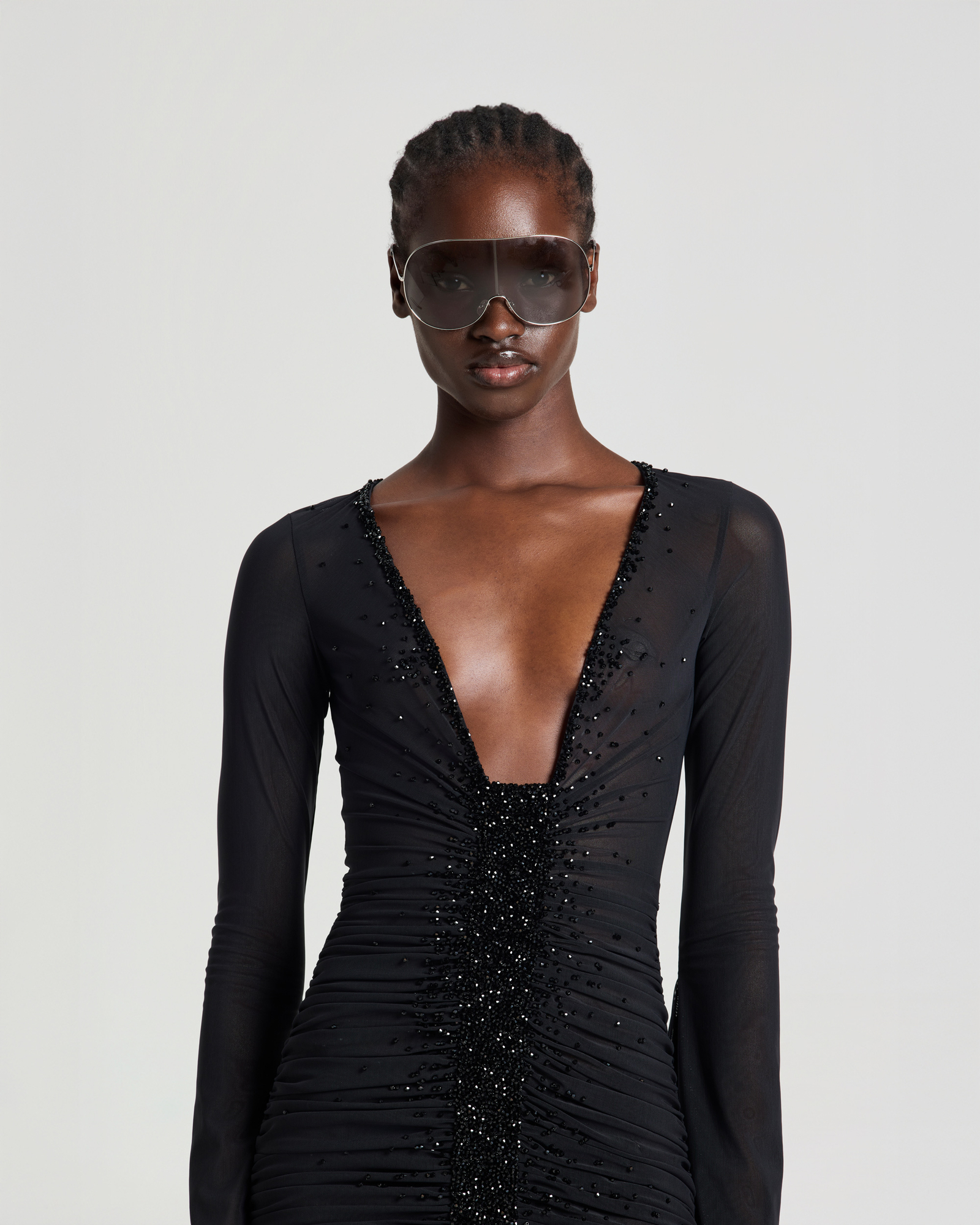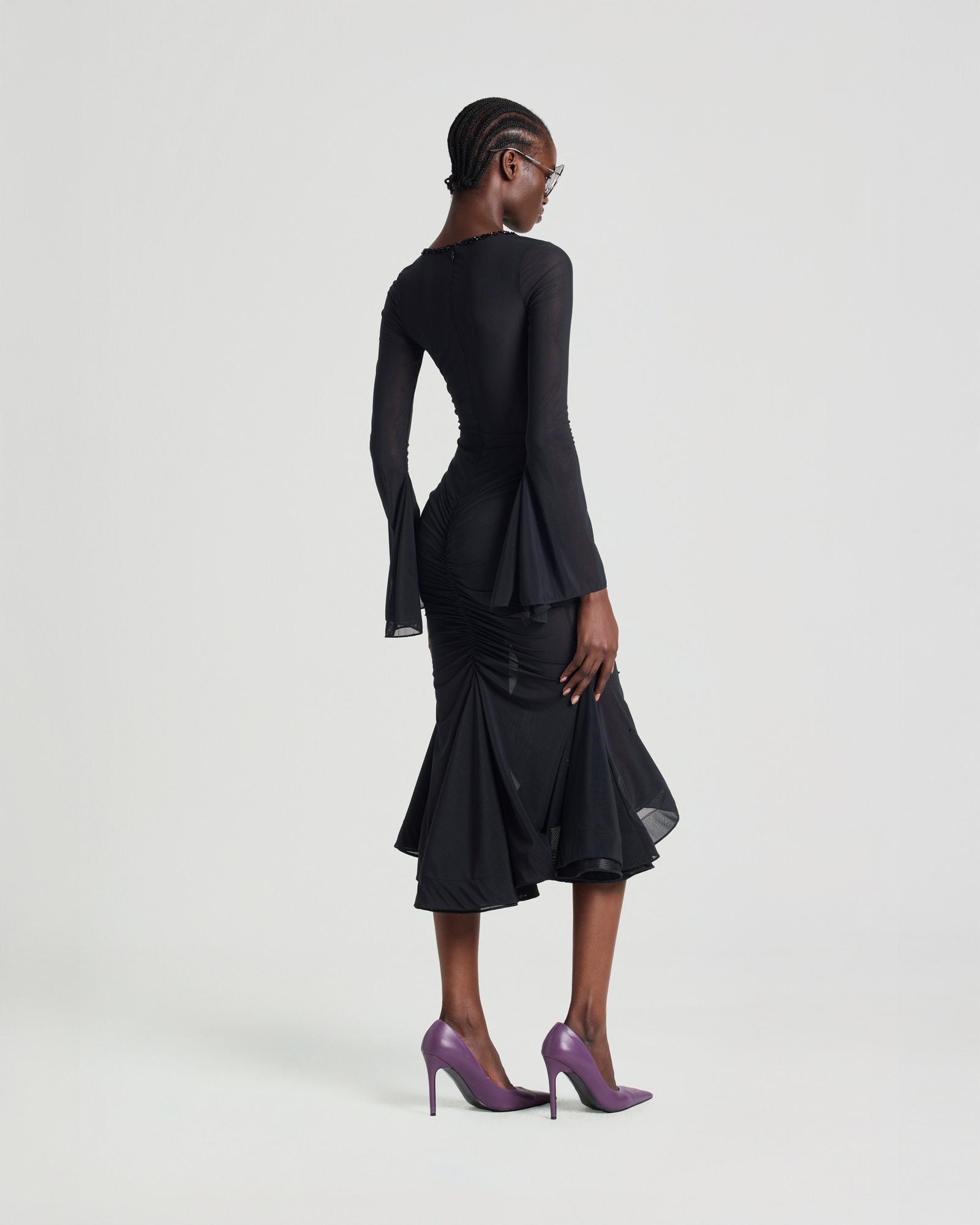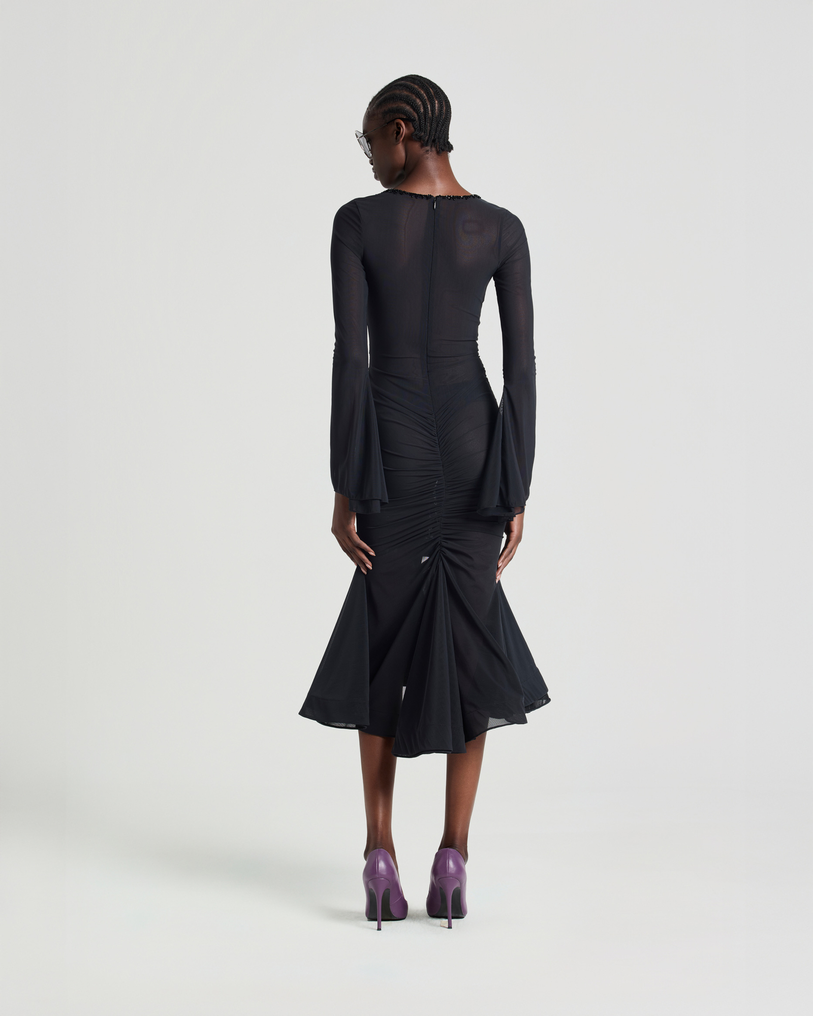 Ruched mesh midi dress with a plunging neckline and crystal embellishments along the neckline and center front for a sparkling, eye-catching effect, completed through sixteen hours of meticulous hand-finishing. Designed in a mermaid-hem silhouette that flatters the figure, with long flared sleeves adding a touch of elegance.