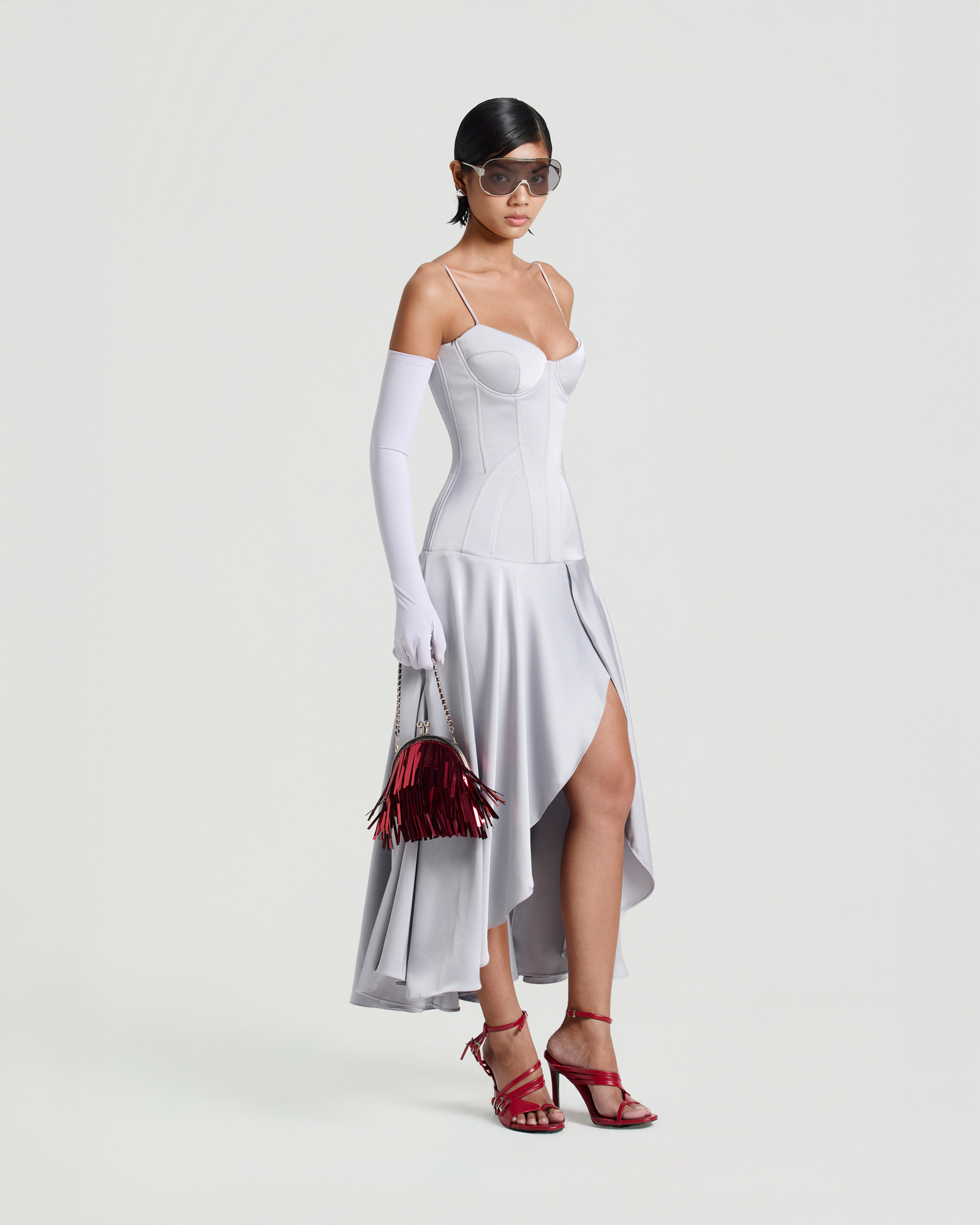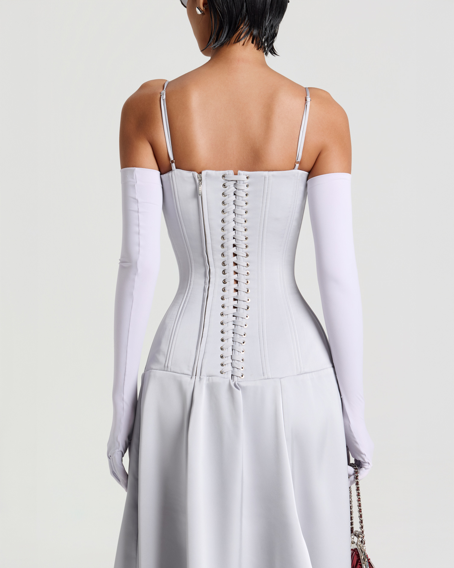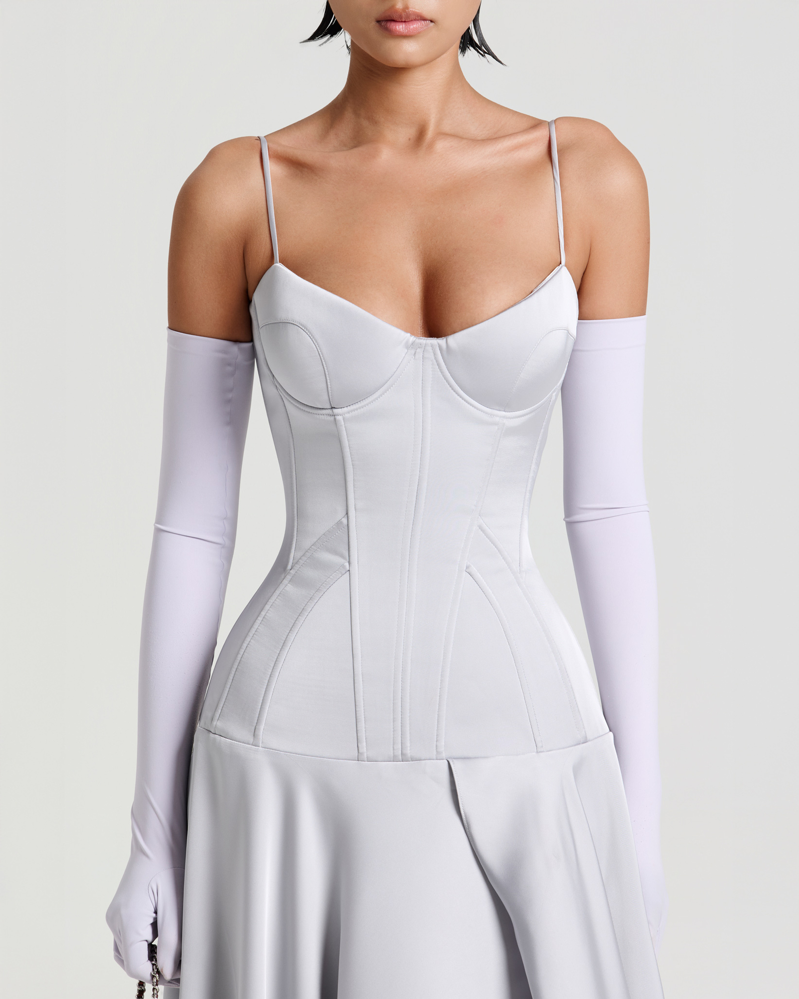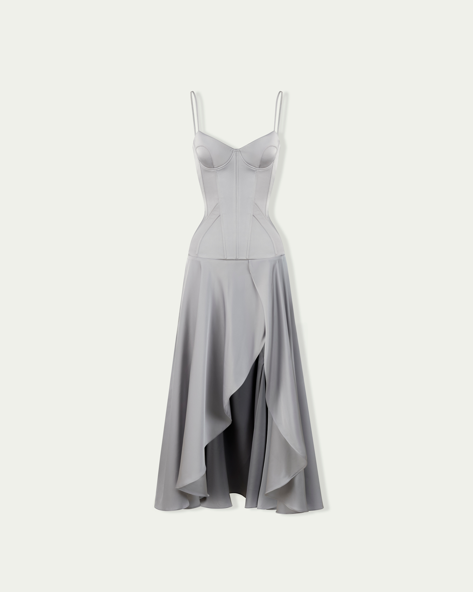 A satin corsetted midi dress crafted with structured boning and padded cups to sculpt the waistline. Pairs with opera gloves, bold rings, and heels for a striking evening look.