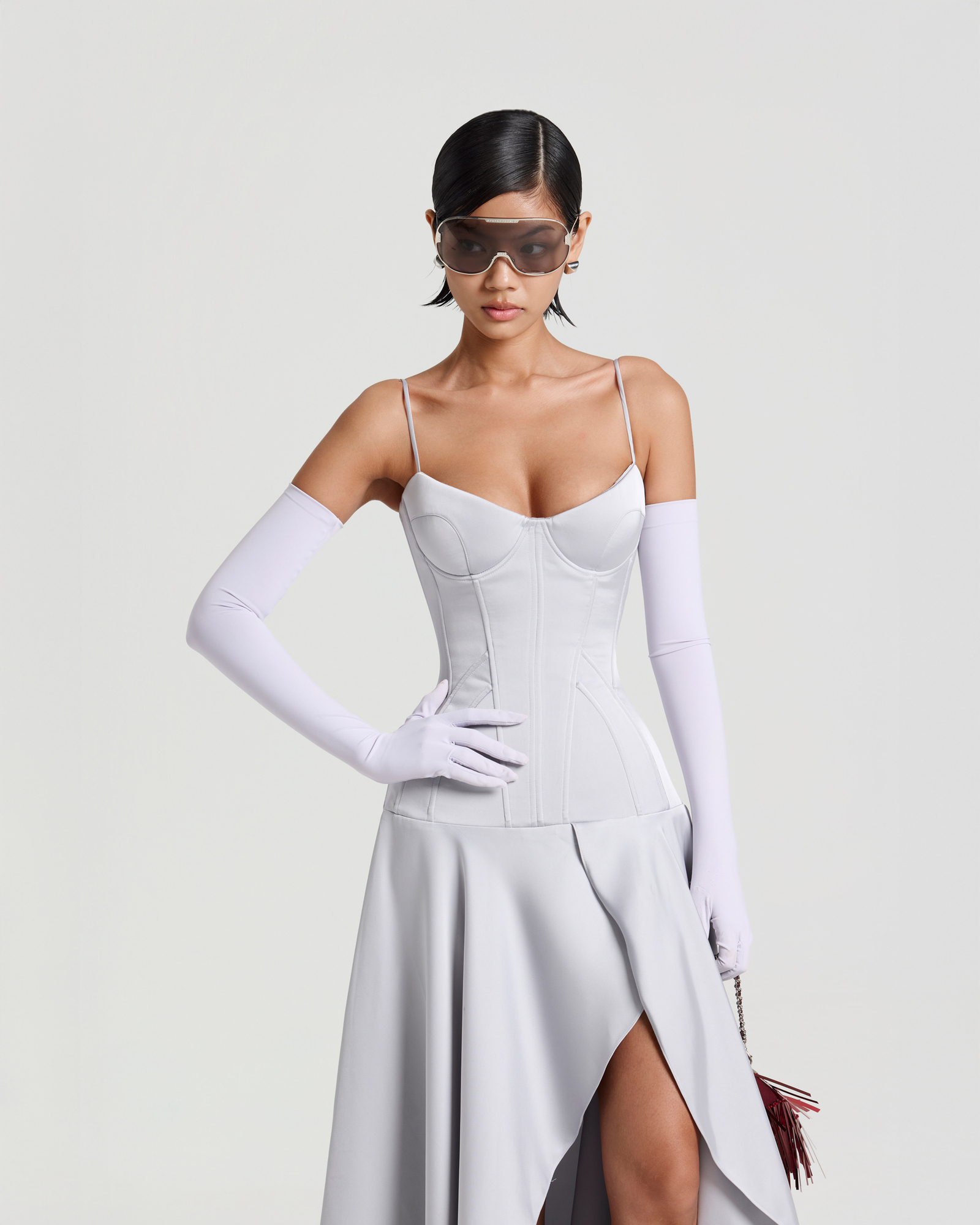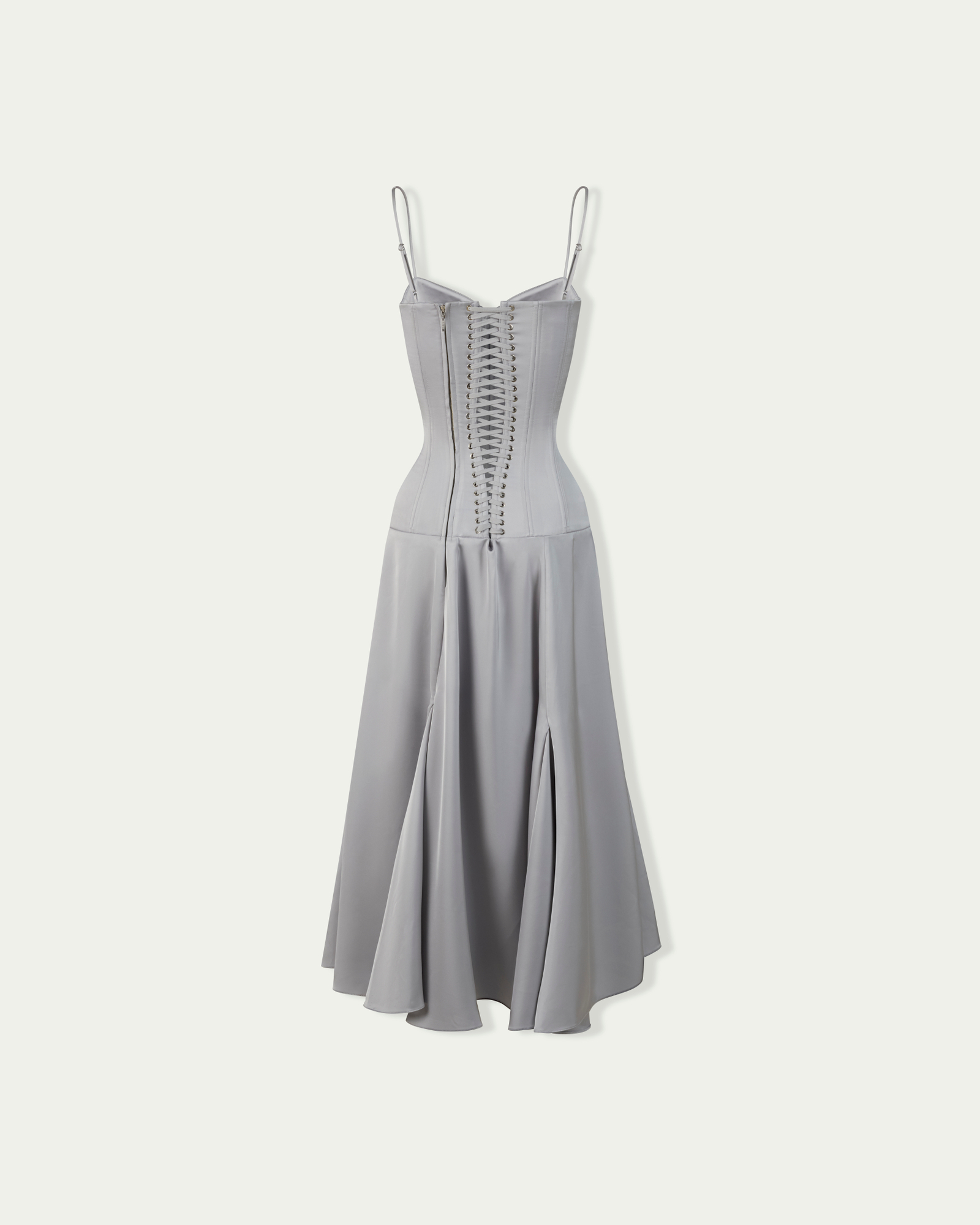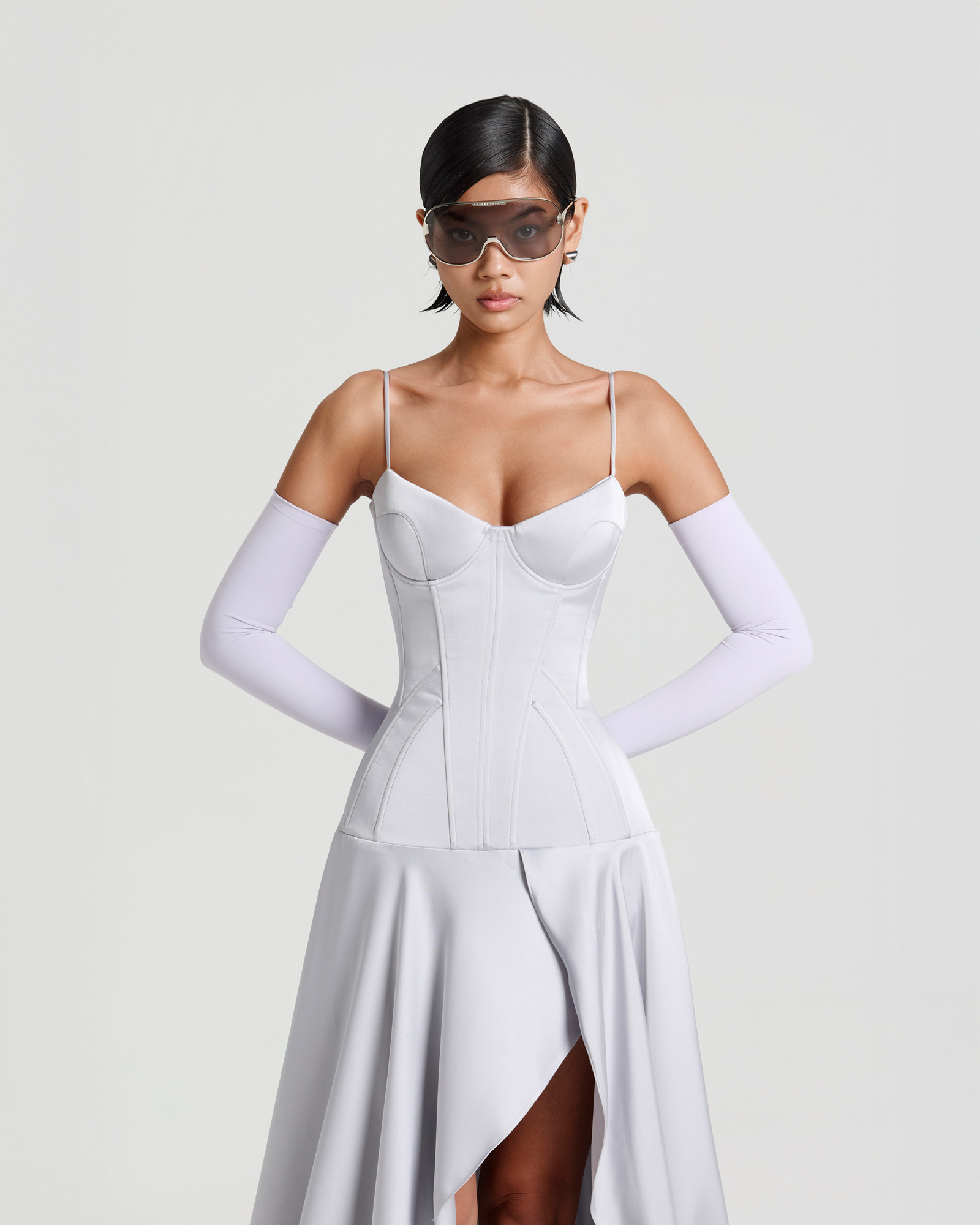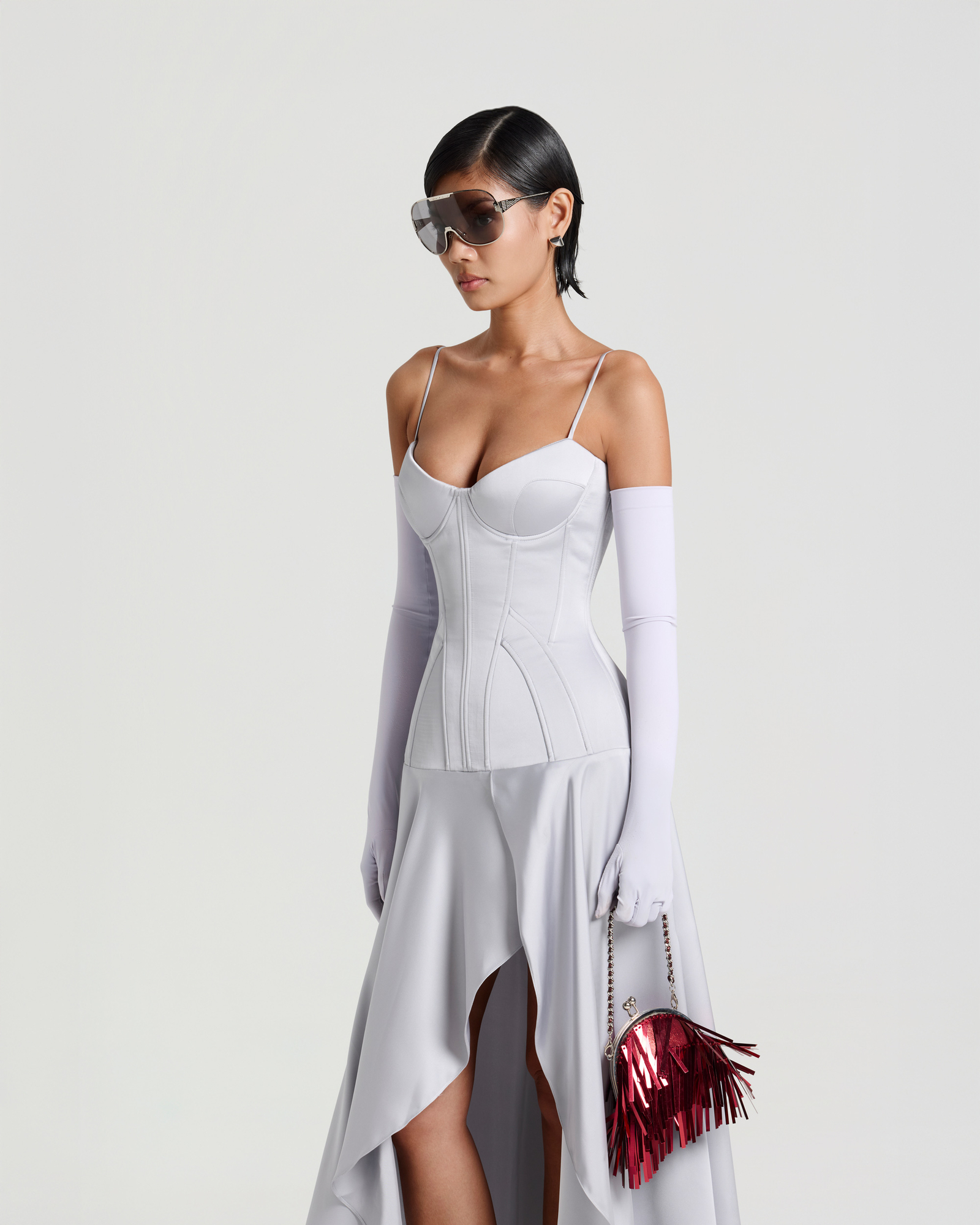 A satin corsetted midi dress crafted with structured boning and padded cups to sculpt the waistline. Pairs with opera gloves, bold rings, and heels for a striking evening look.