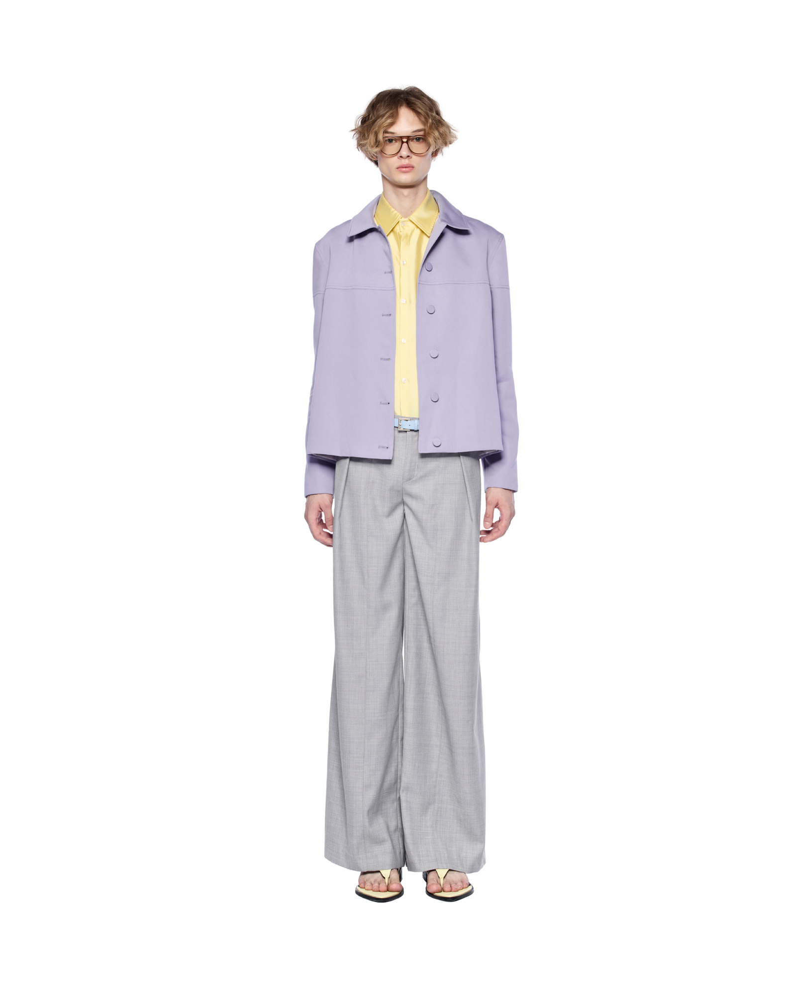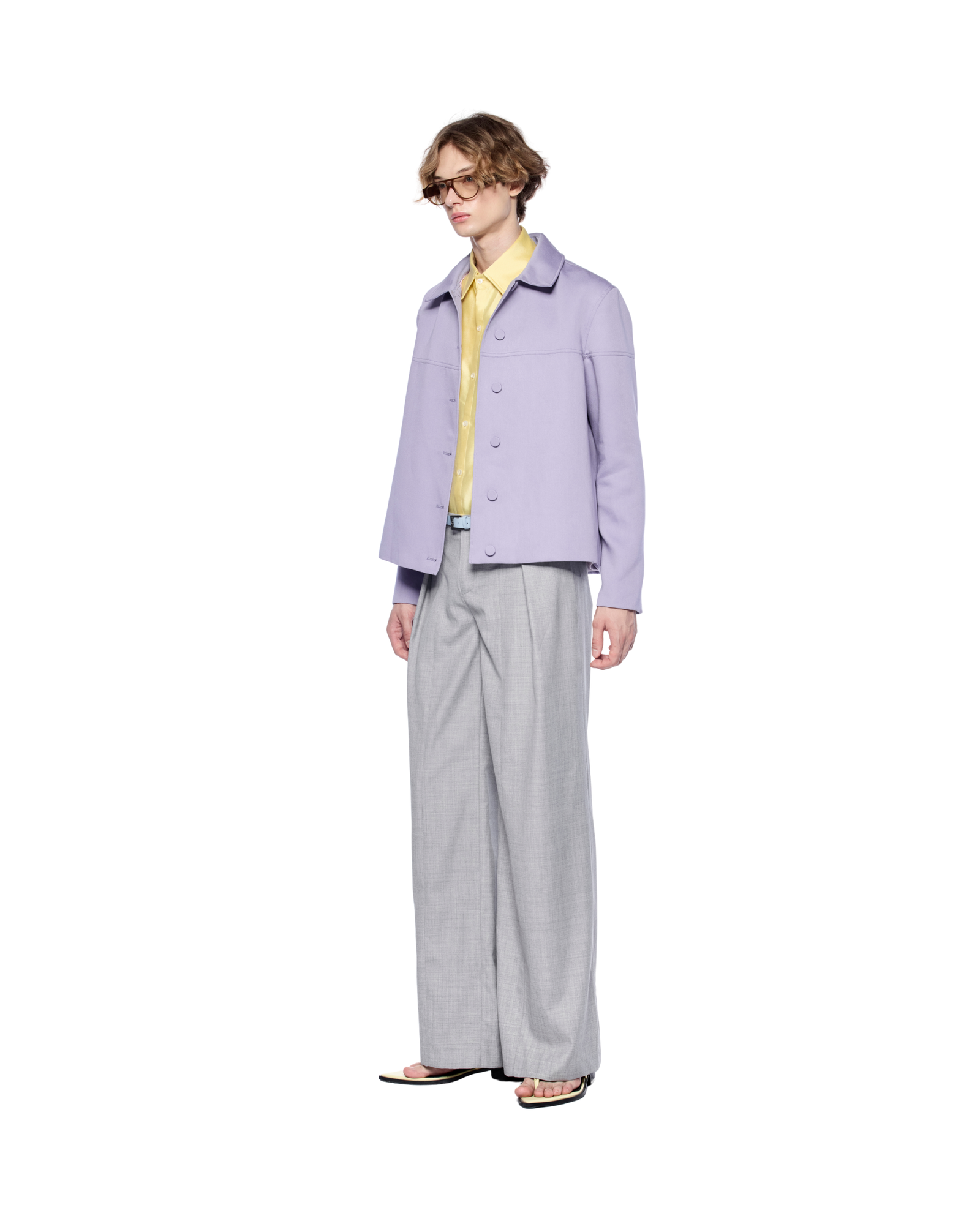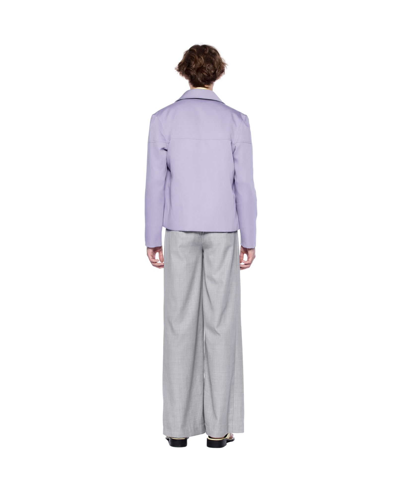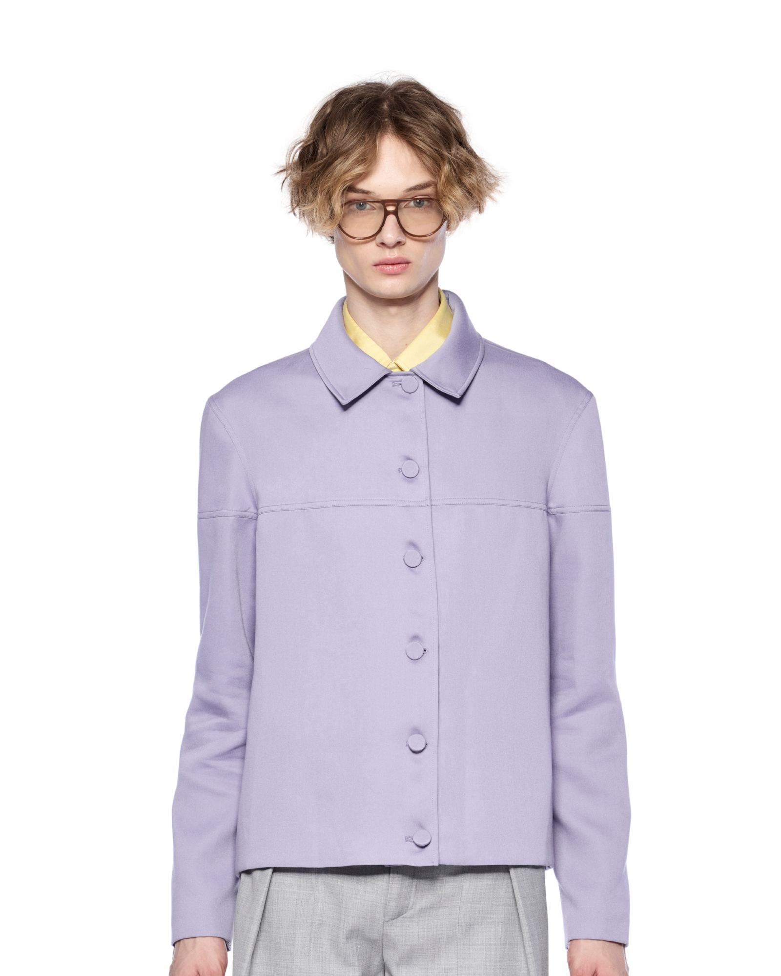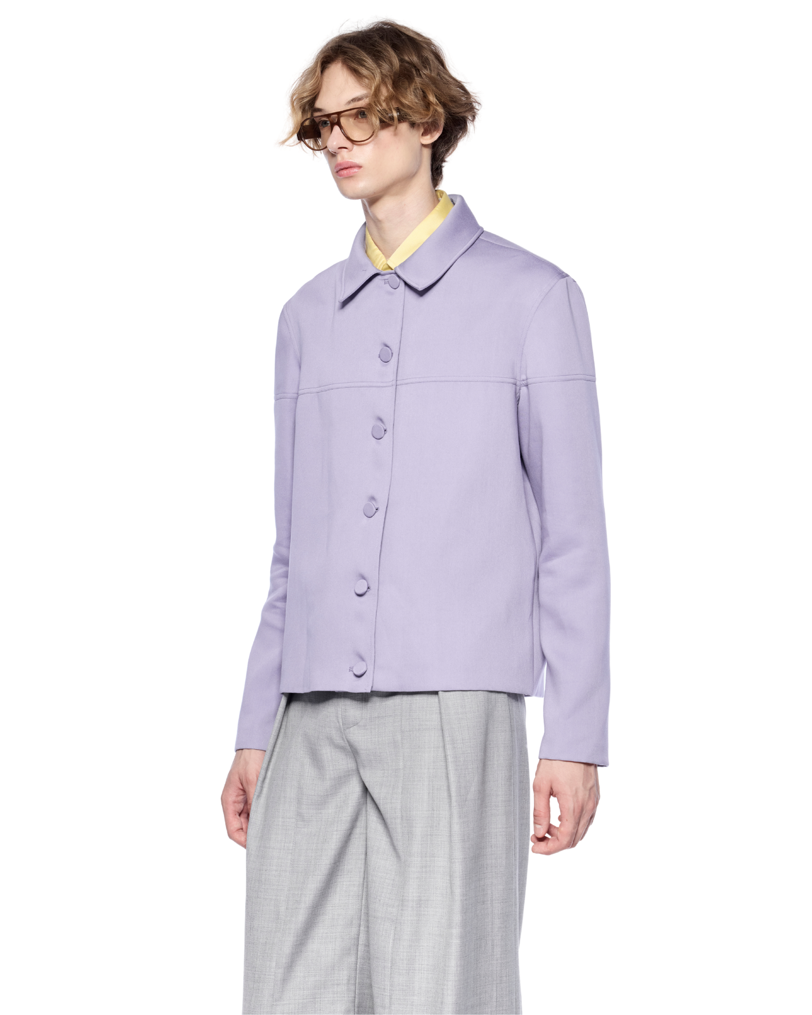 A wool-blend jacket with a boxy silhouette, defined by its button-front closure and seam detailing along the chest and arms. Style it over a fitted shirt with tailored trousers or straight-leg pants for a sharp, modern look