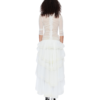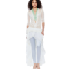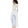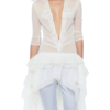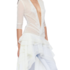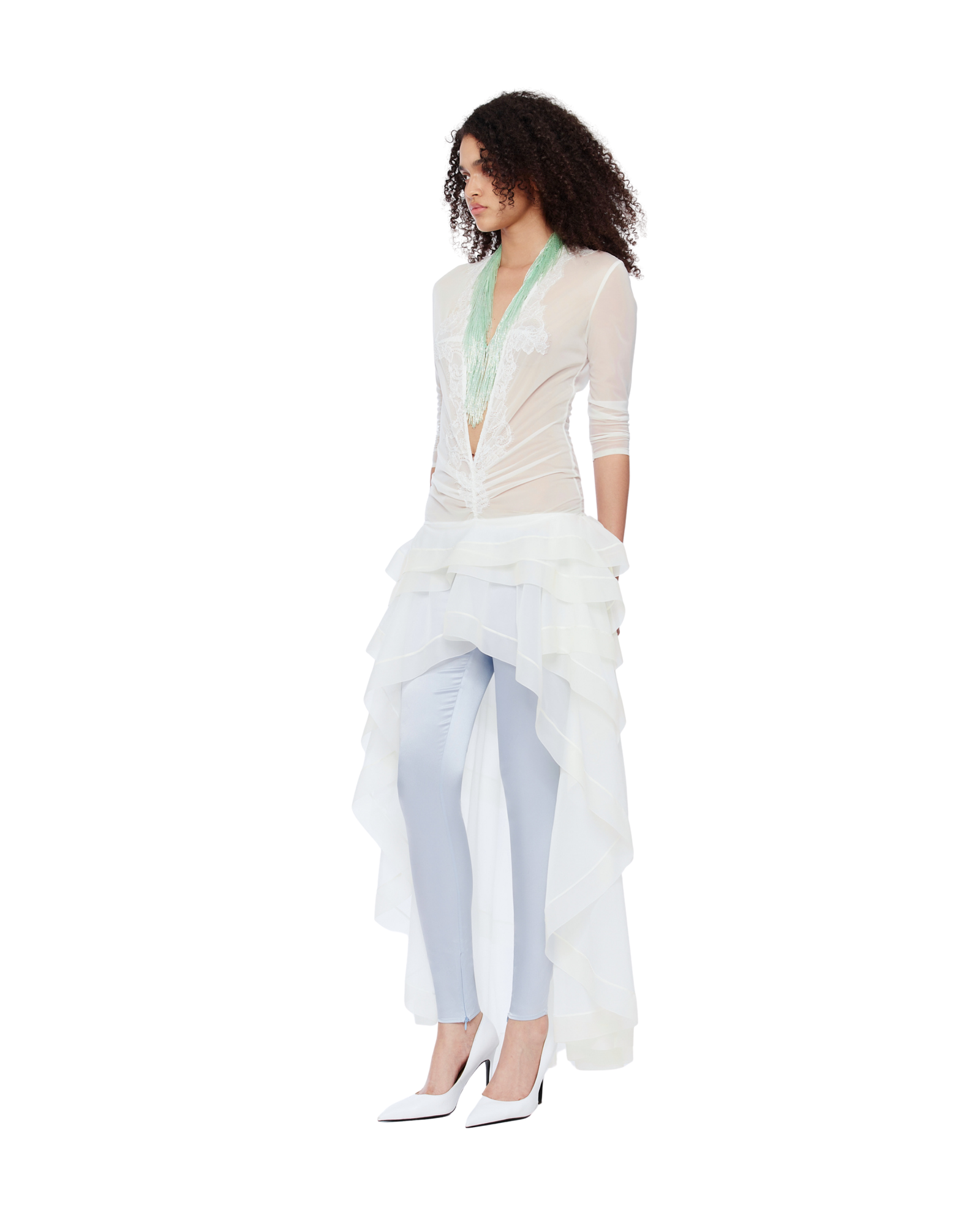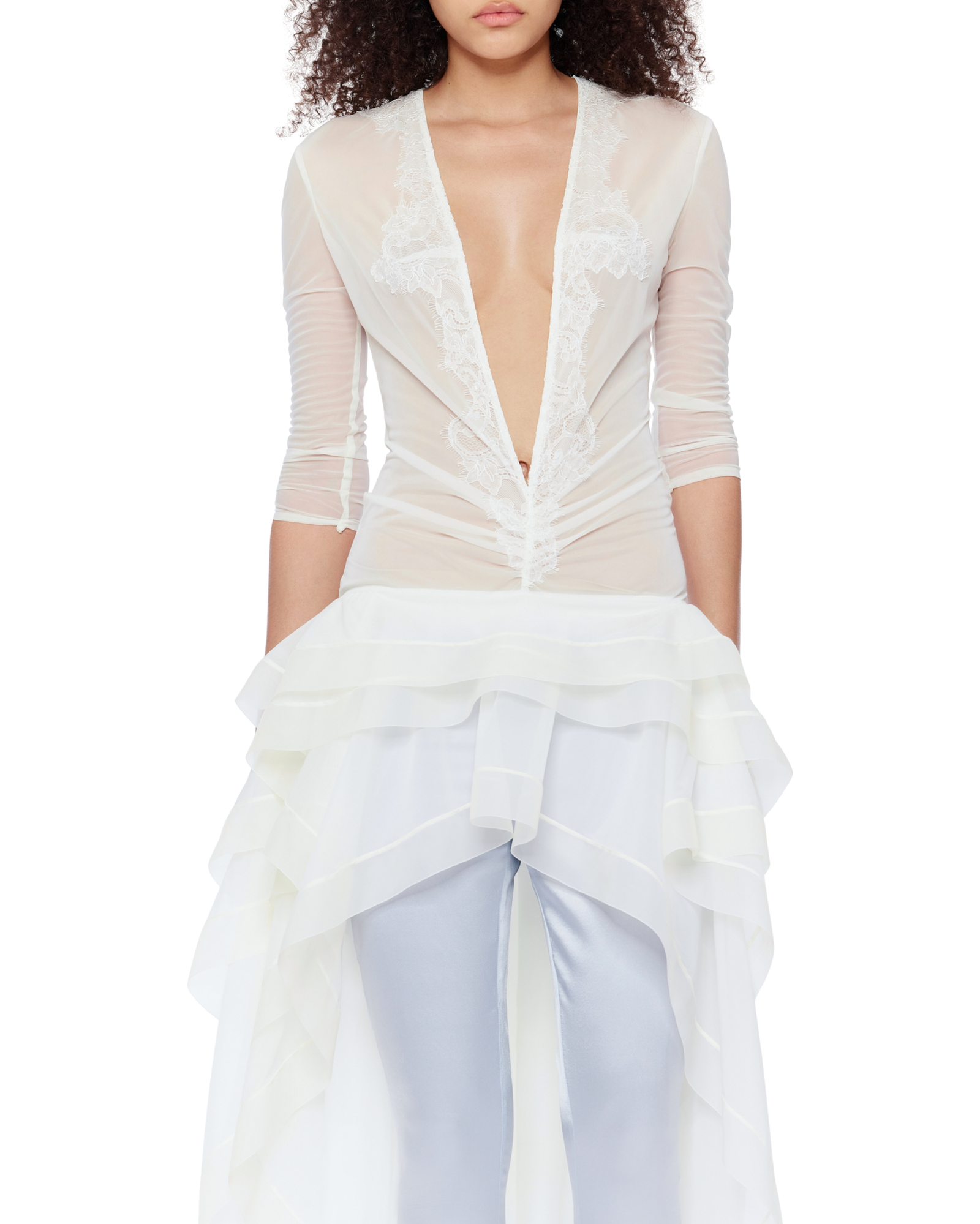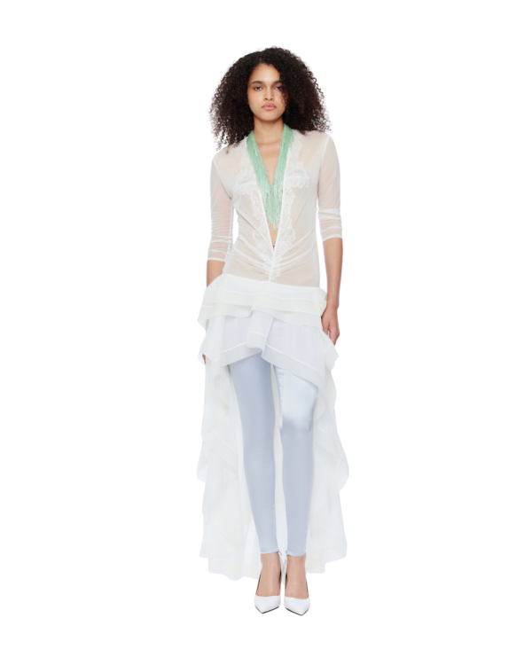 A sheer ruffle dress refined by a deep plunging V-neck and lace-and-bead appliqué tracing the front and back. The layered high-low hem creates volume and movement, while the runched details contour the body. Style it with mini shorts or low-rise fitted pants for a daring finish.