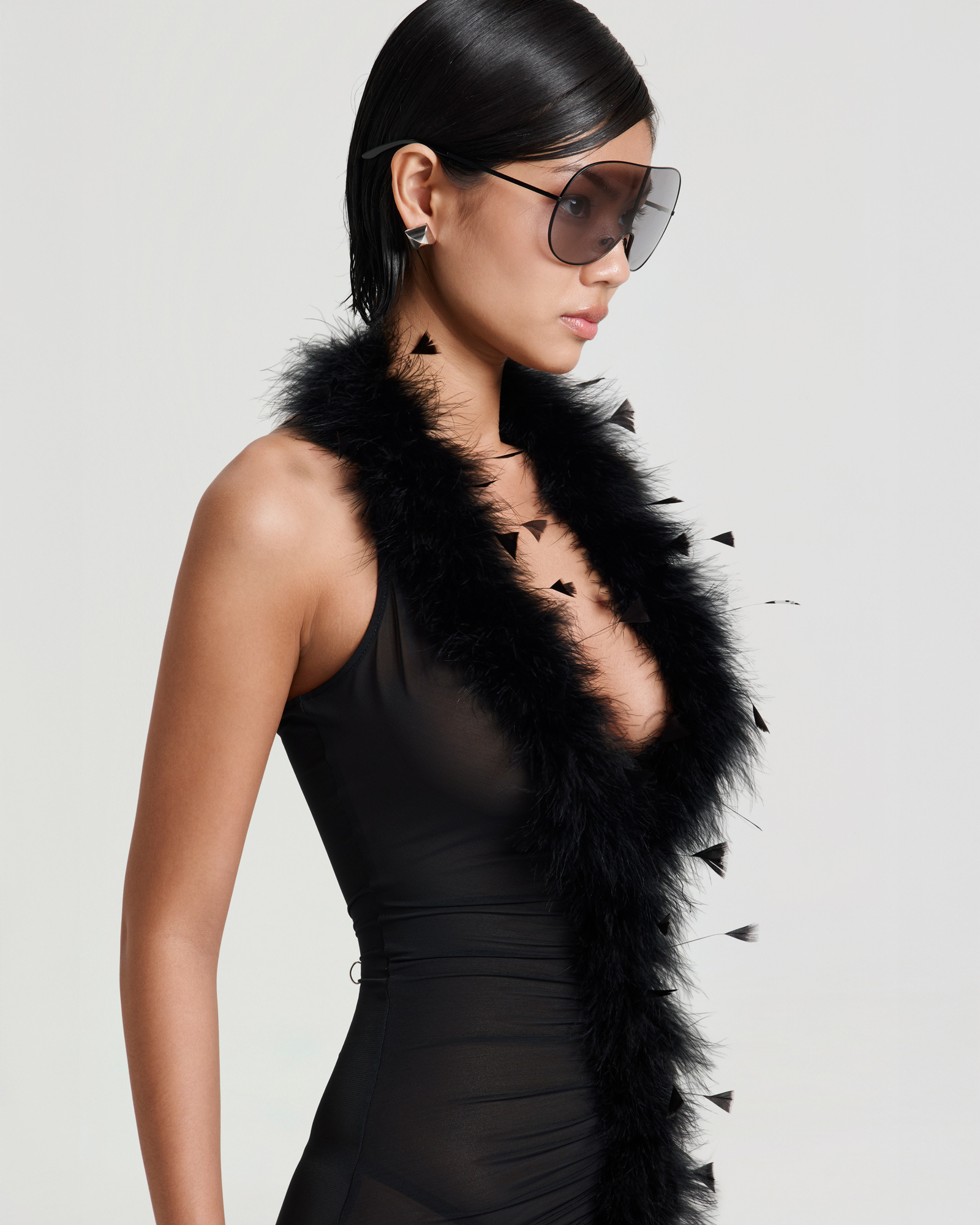 Plunging V-neckline adorned with feather trim along to center front