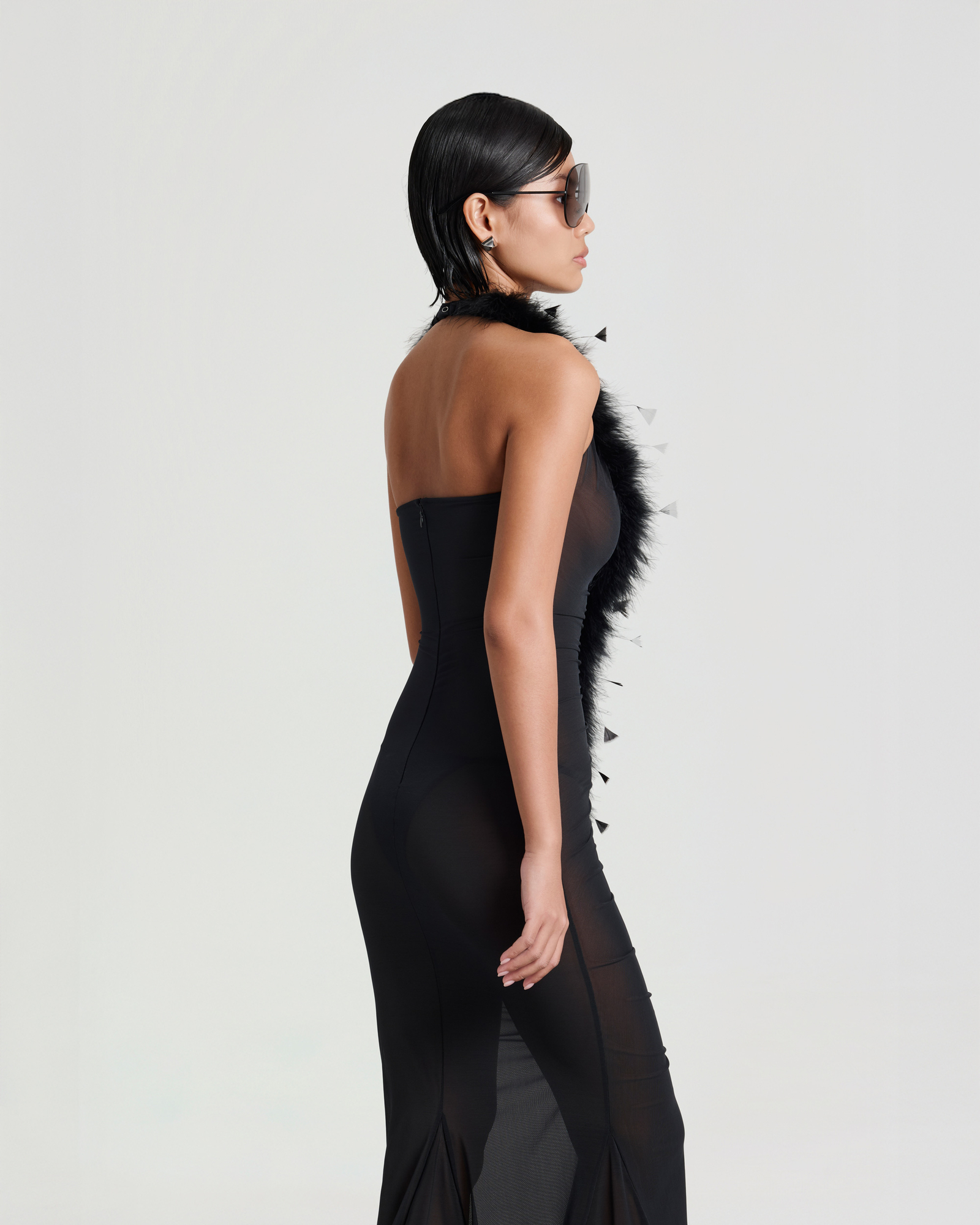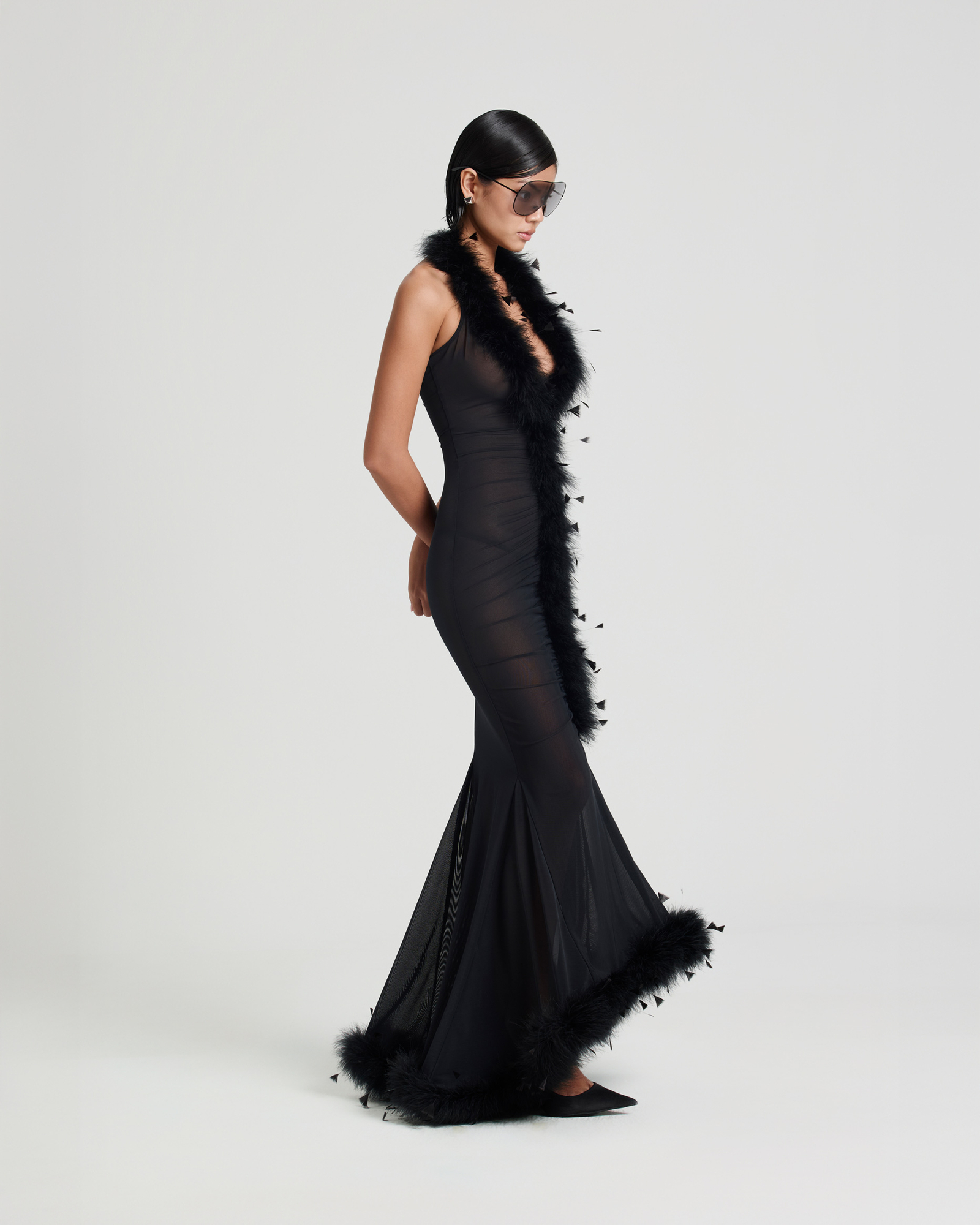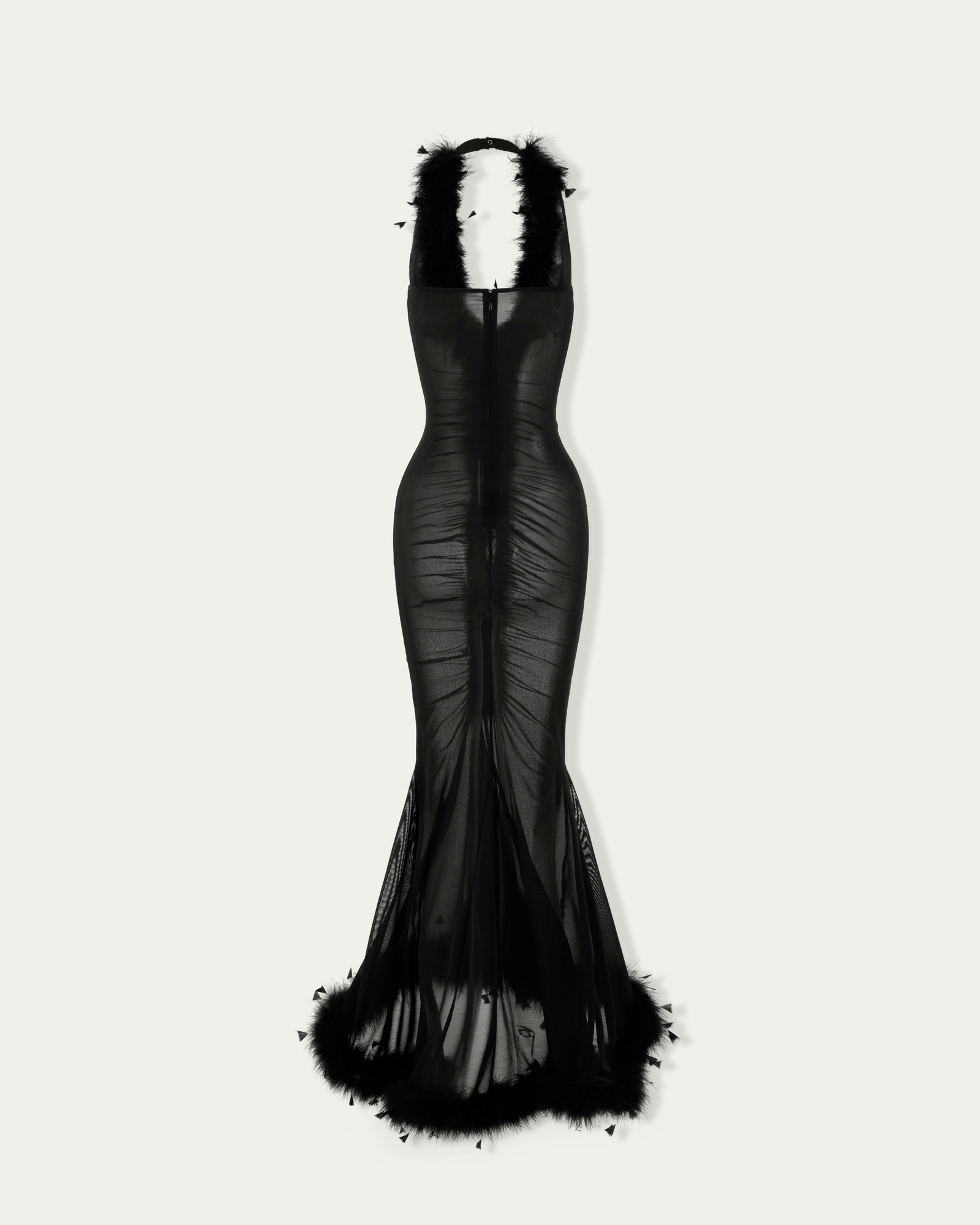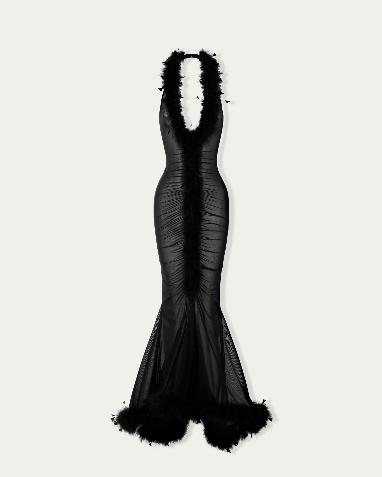 Sheer dress with a plunging V-neckline, accented with soft feather trim extending down the center front. The ruched, form-fitting silhouette flatters the figure, while a flared mermaid hem with matching feather trim adds graceful movement. Sleeveless and finished with a concealed back zip, unlined for a light, flowing feel.