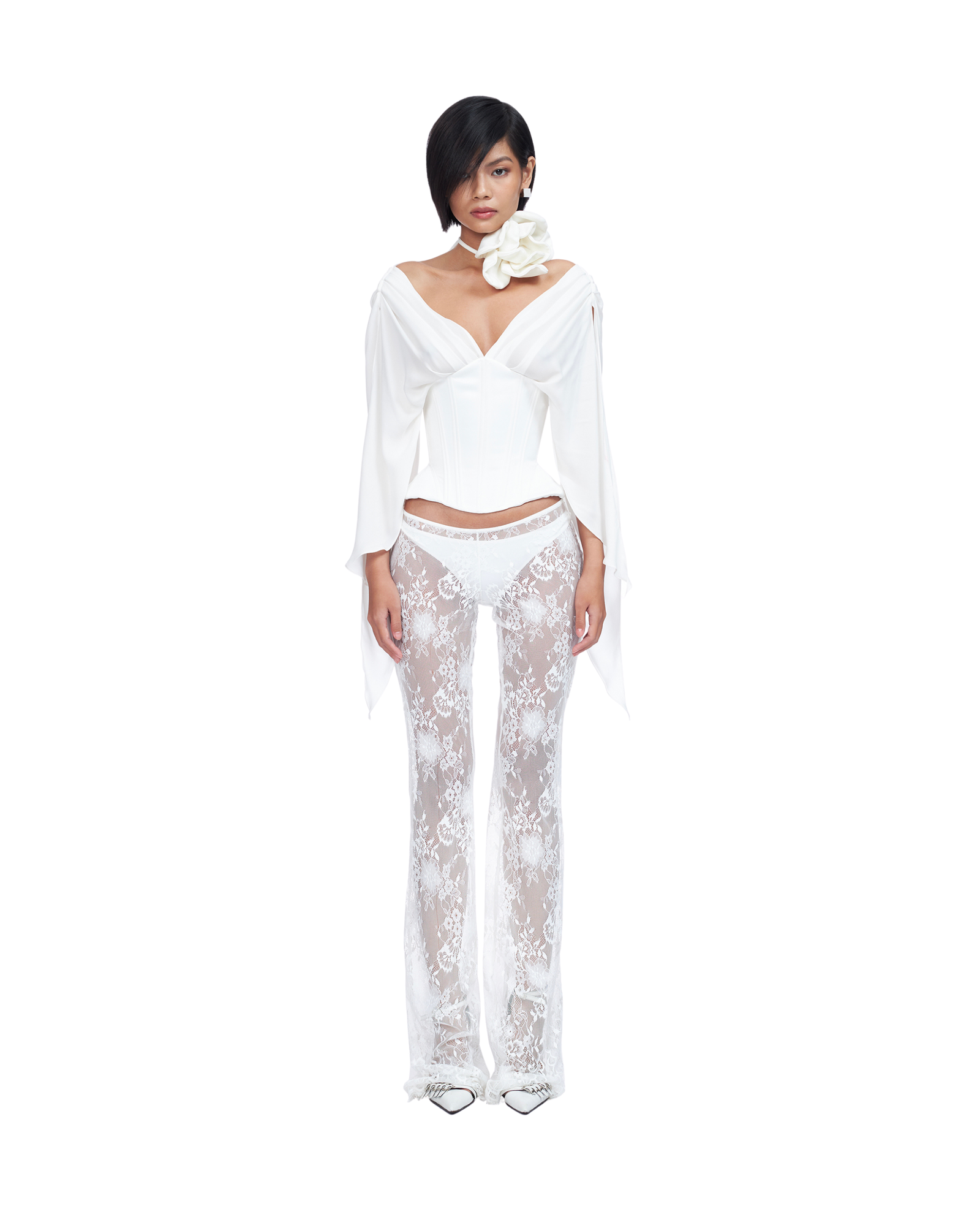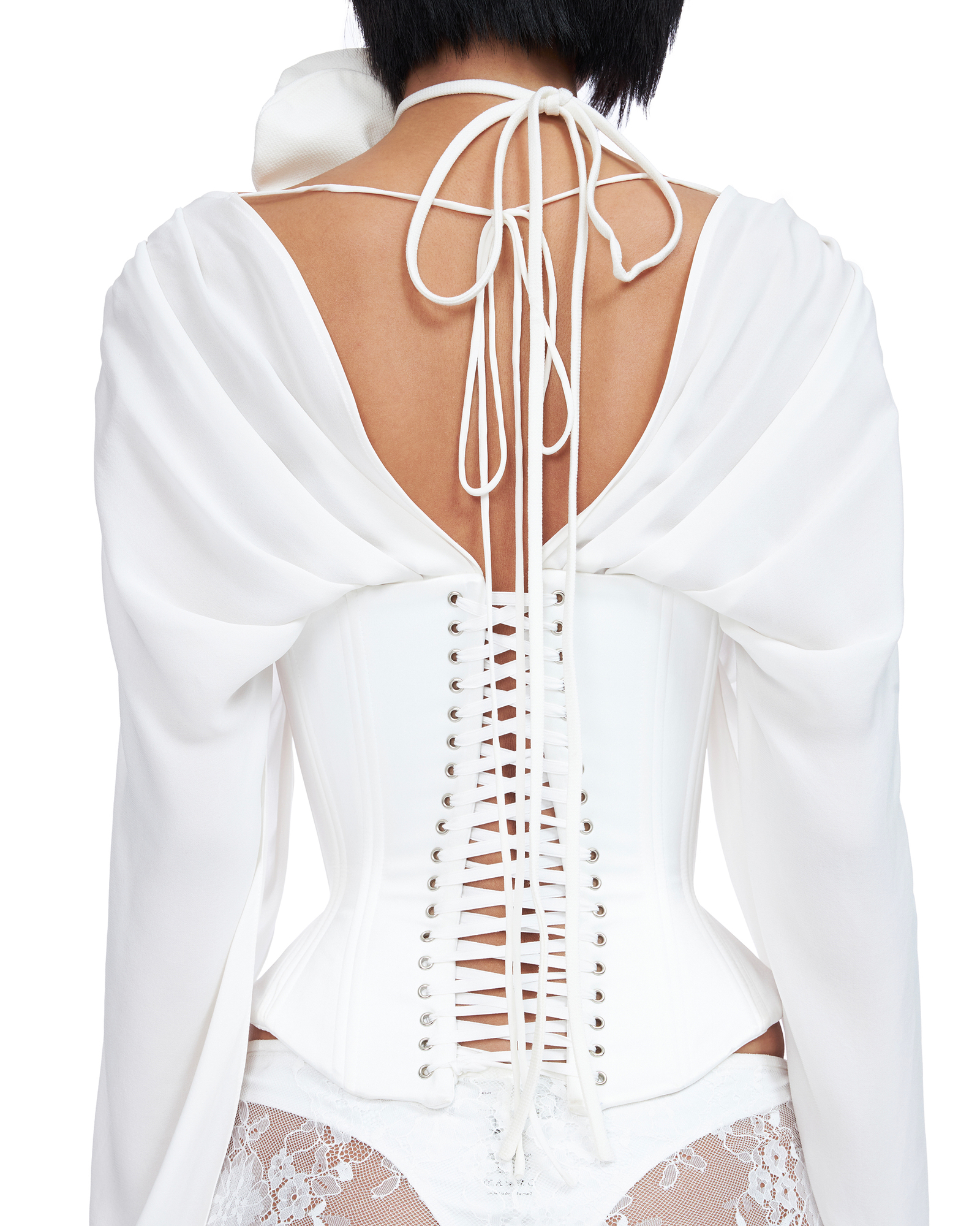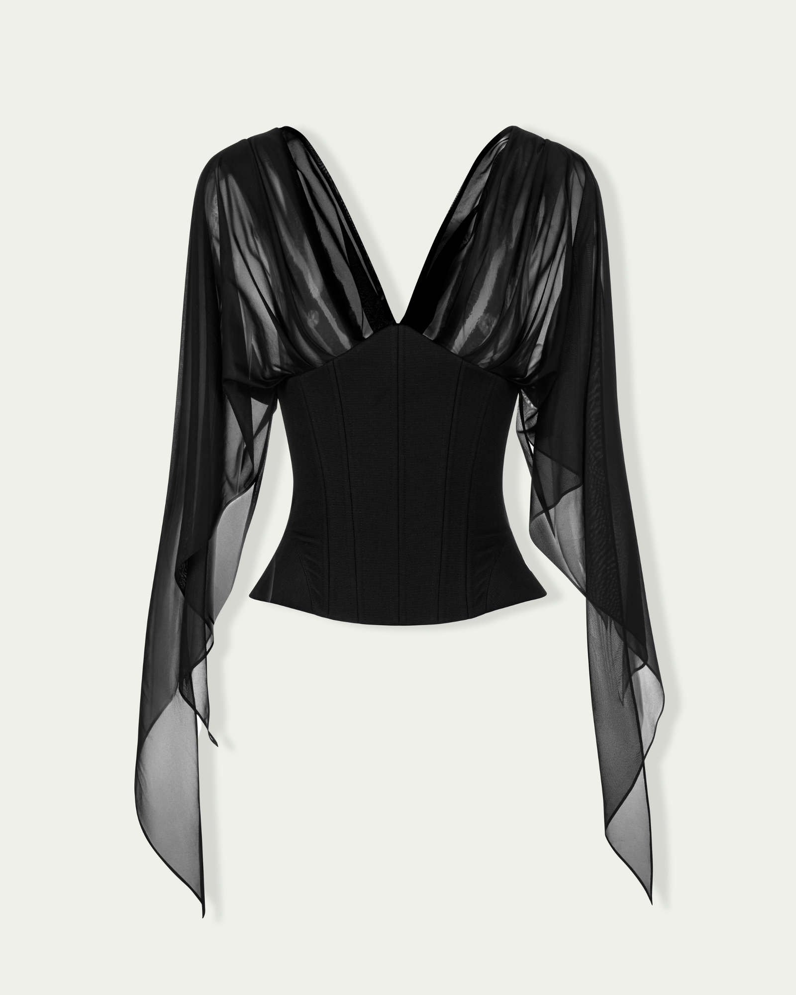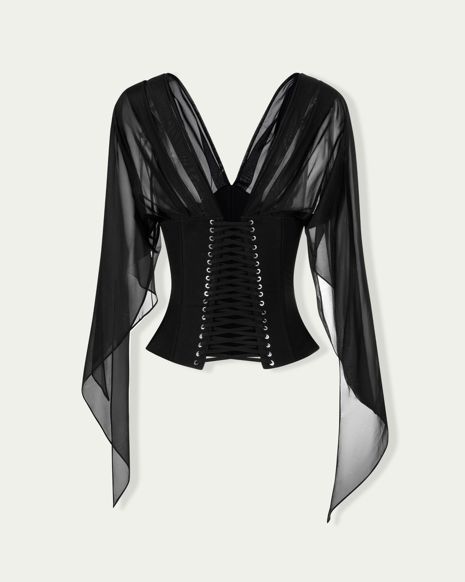 Corset top with bell-styled sleeve Structured boning throughout Deep semi sheer V-neck Lacing at back