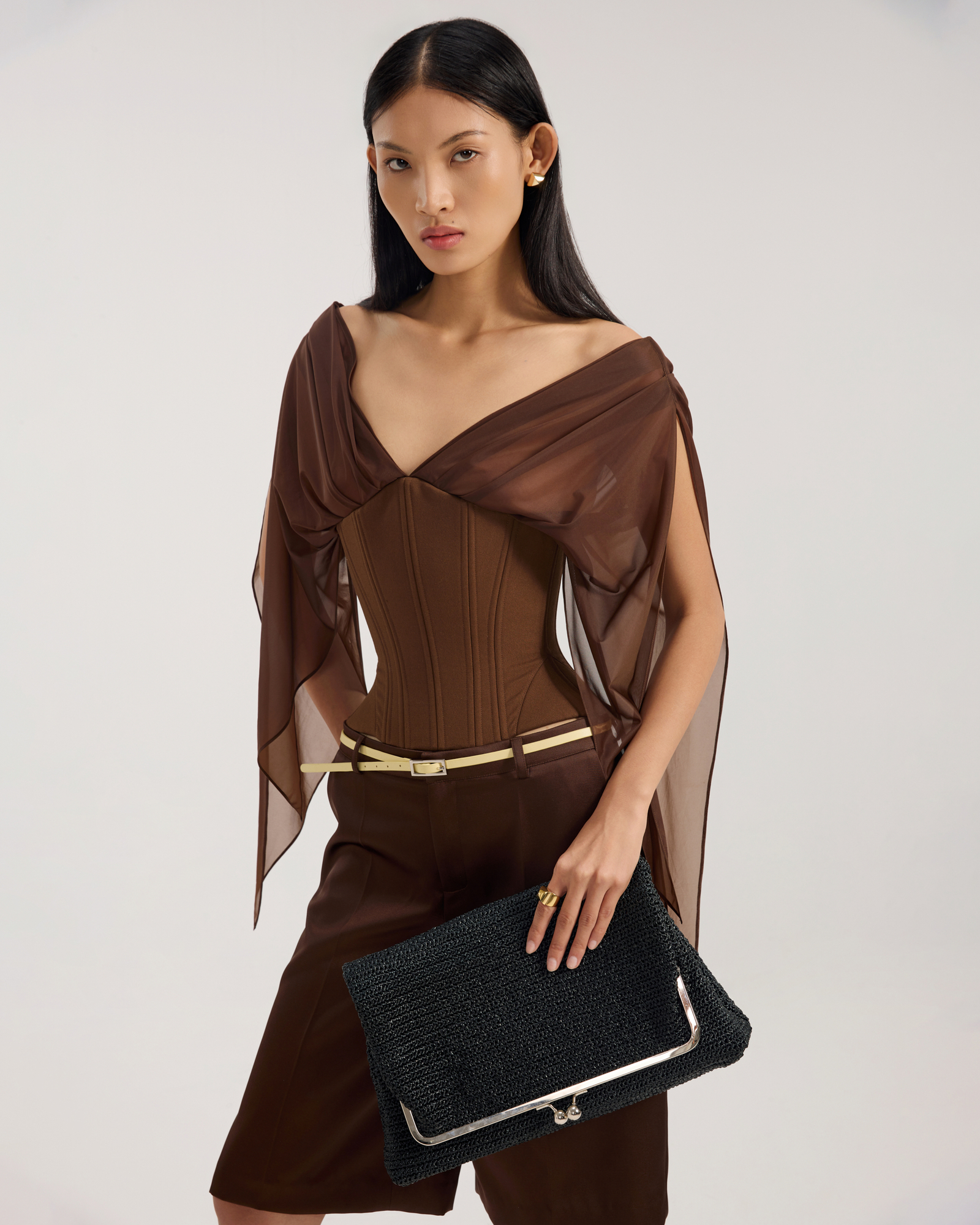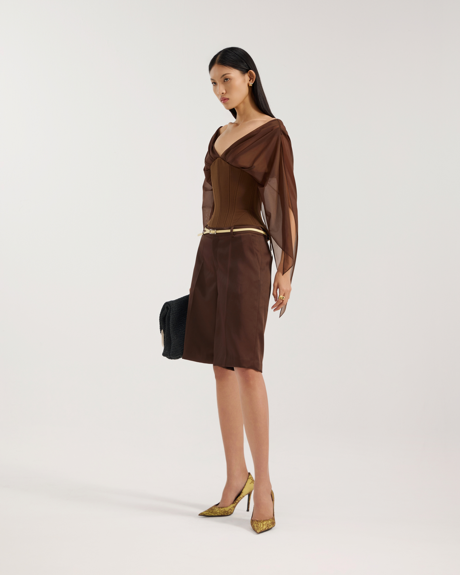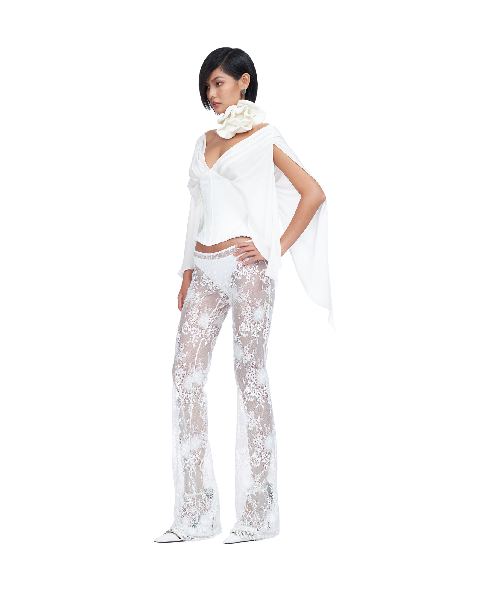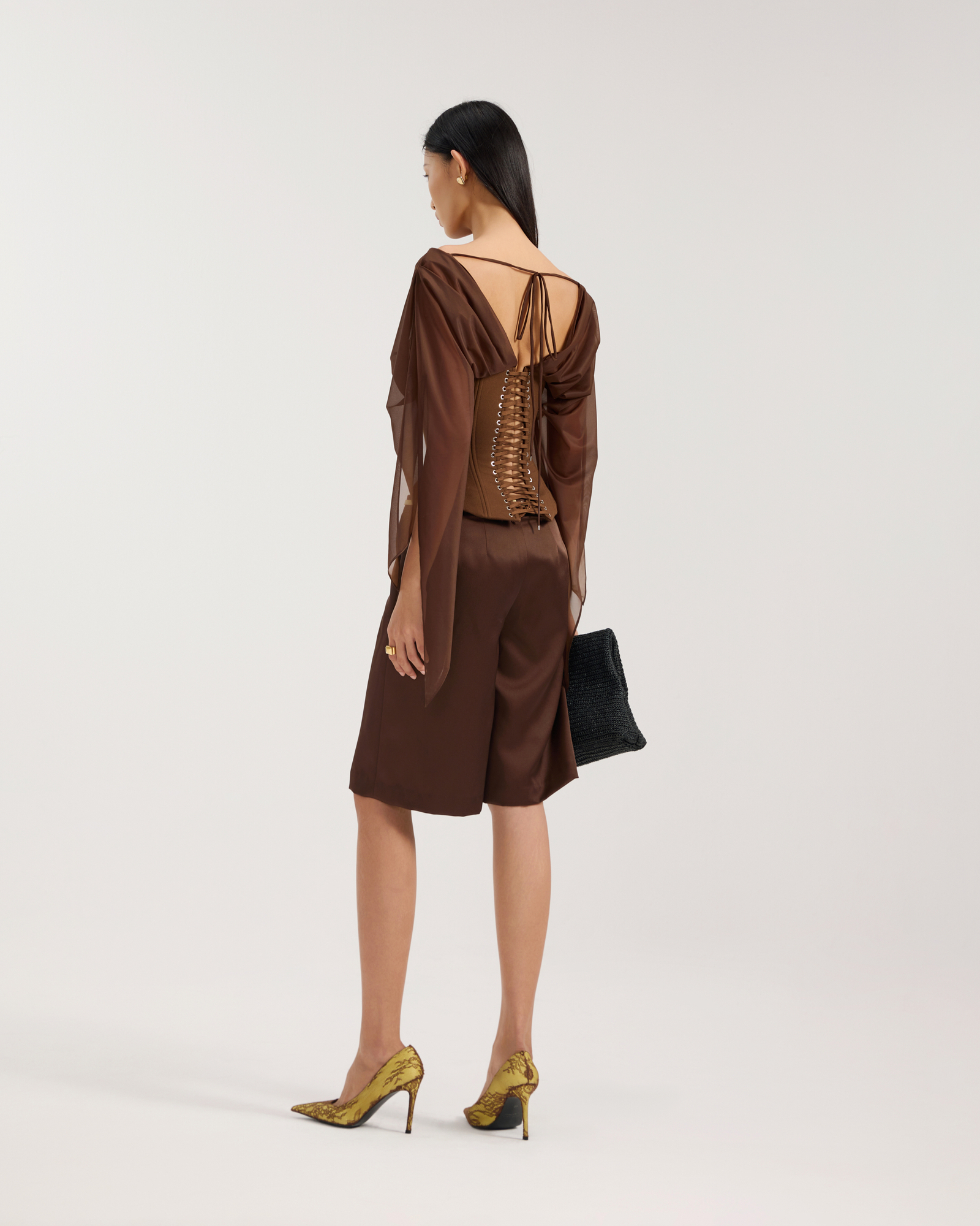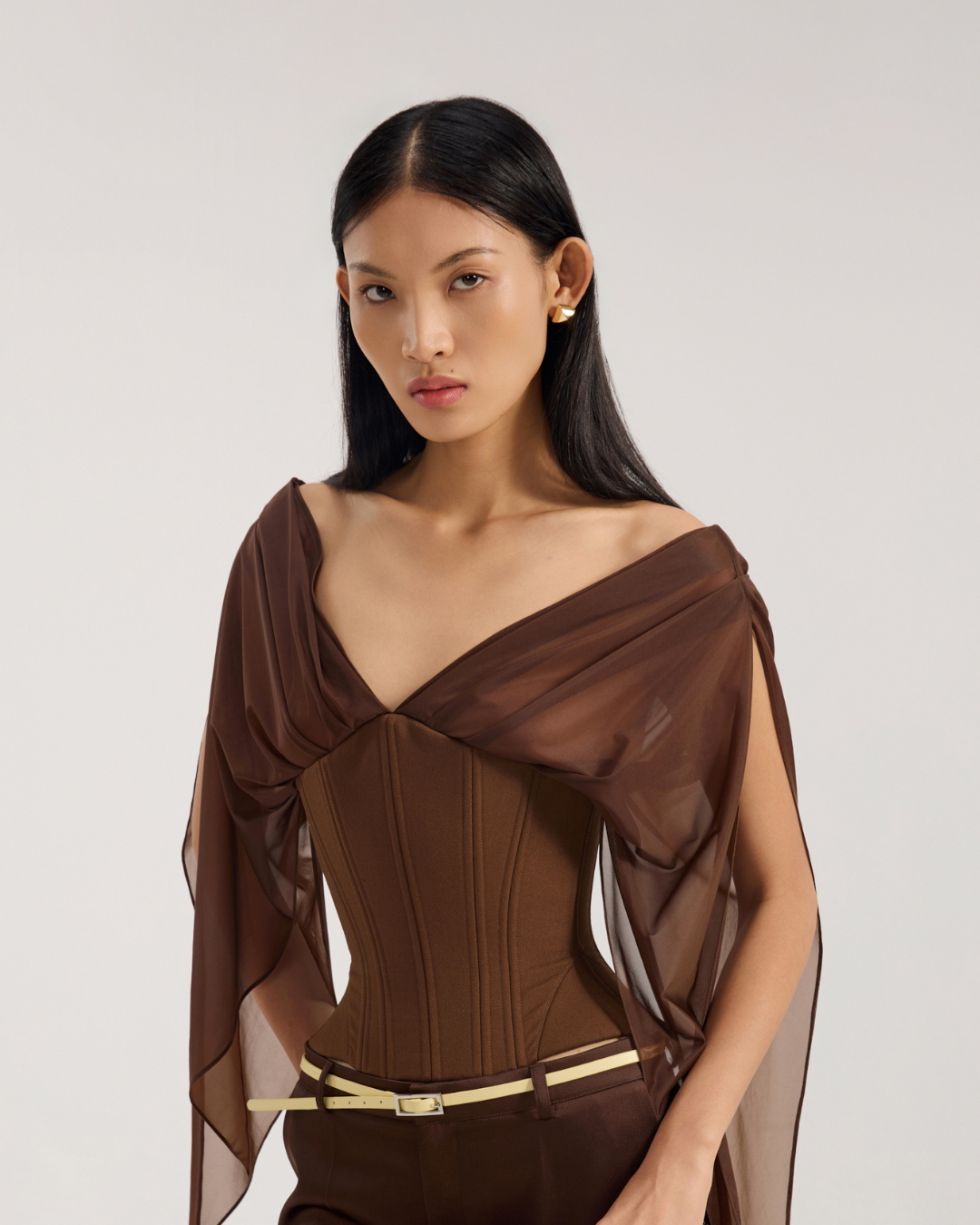 Corset top with bell-styled sleeve Structured boning throughout Deep semi sheer V-neck Lacing at back