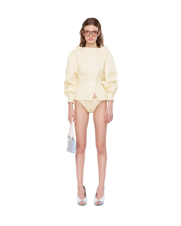 A wool-blend boatneck jacket with a cinched silhouette, perfect for pairing with wide-leg trousers, mini shorts, or a mini skirts.