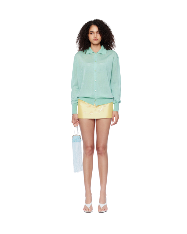 Hand-embroidered skirt features delicate floral beadwork at the front, meticulously crafted over six hours. Its low-rise silhouette subtly flatters the hips while keeping a refined, elegant vibe.