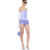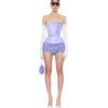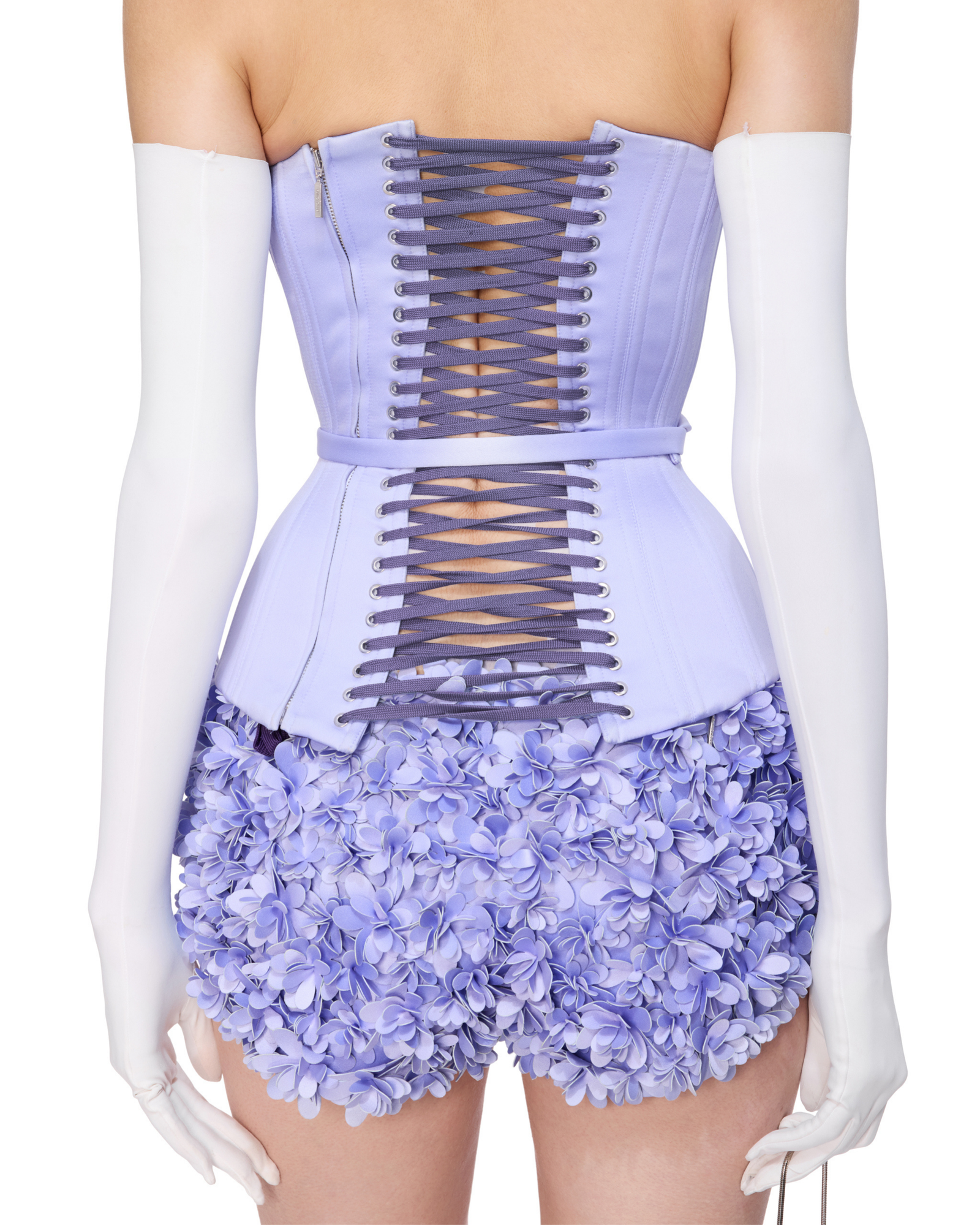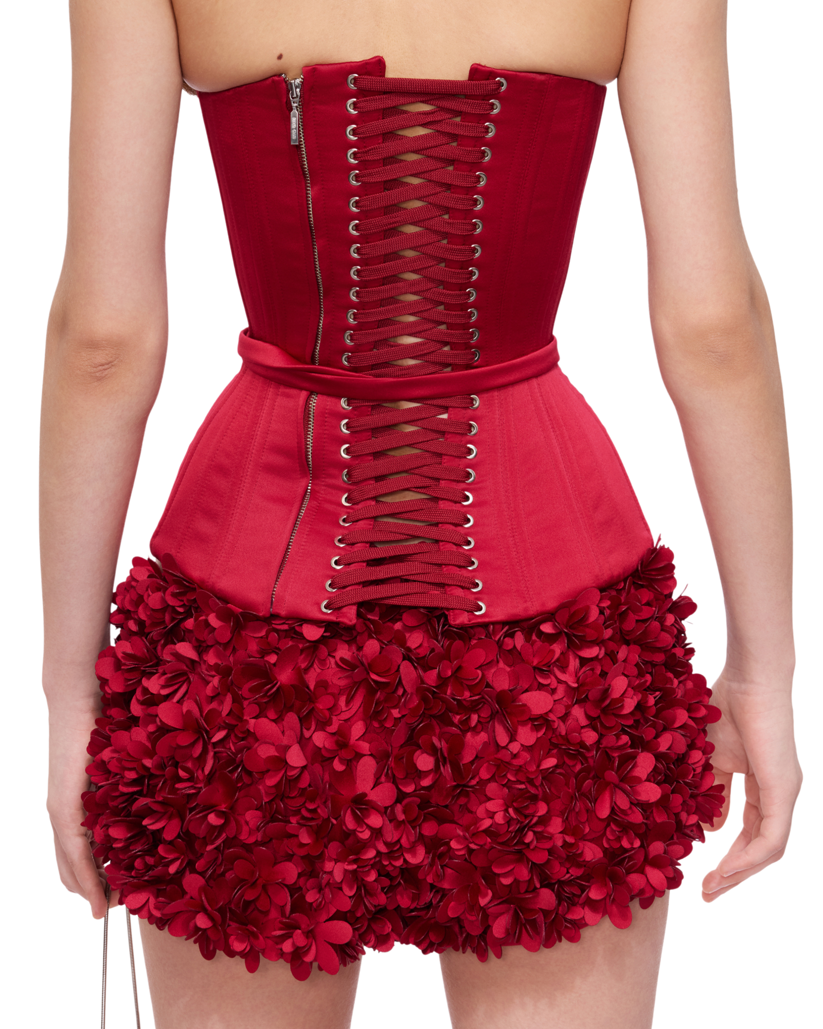 3D flowers brief shorts entirely hand-embroidered with laser-cut floral clusters, covering the surface in delicate detail. The structured form with a subtle sheen makes it stand out, best styled with a corset or polo for contrast.