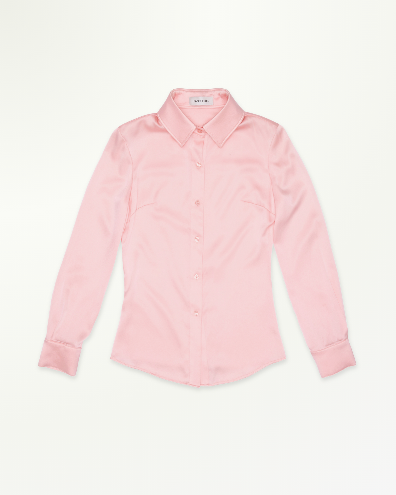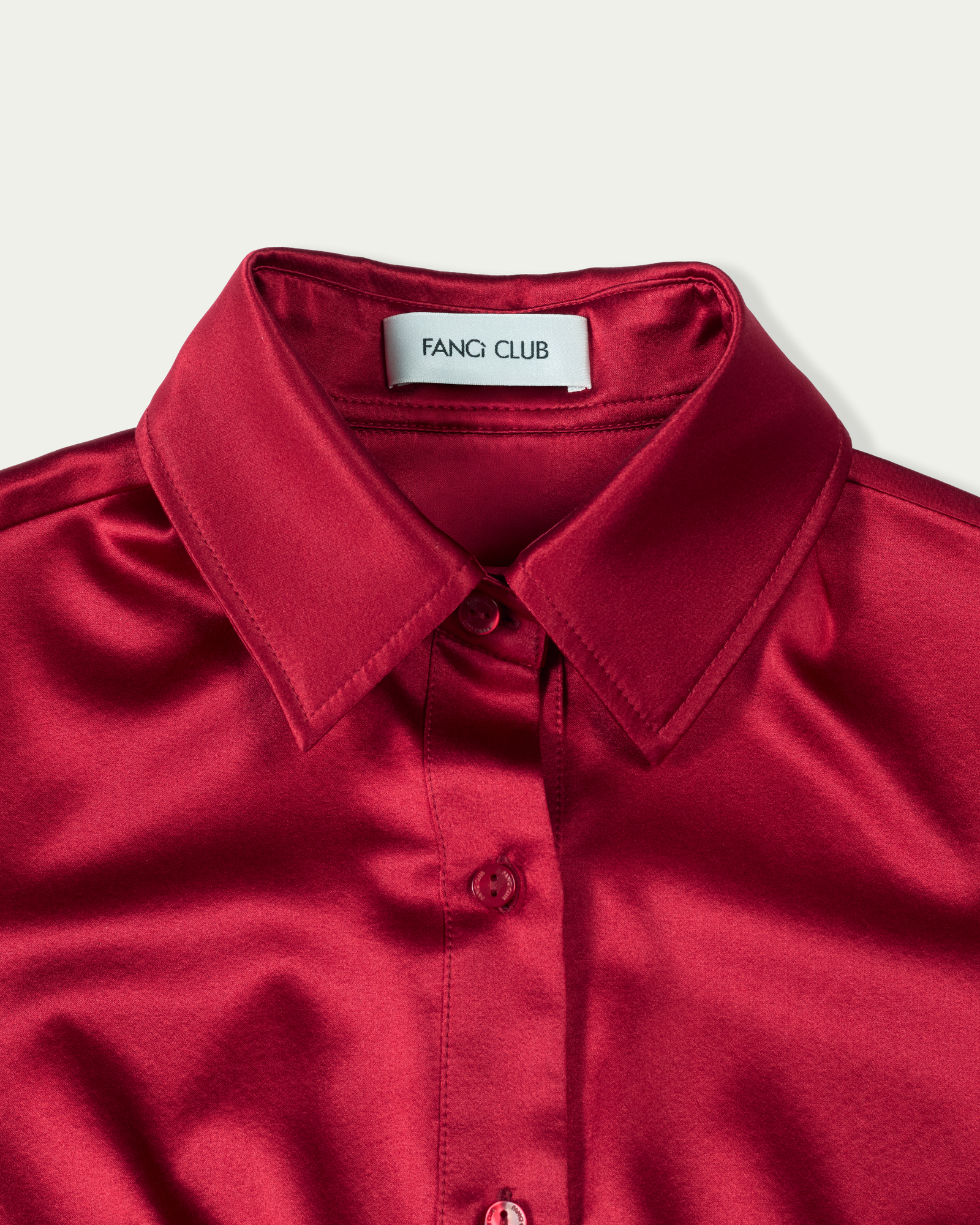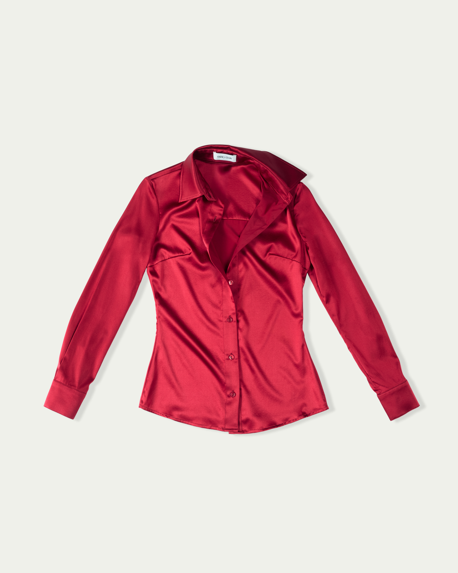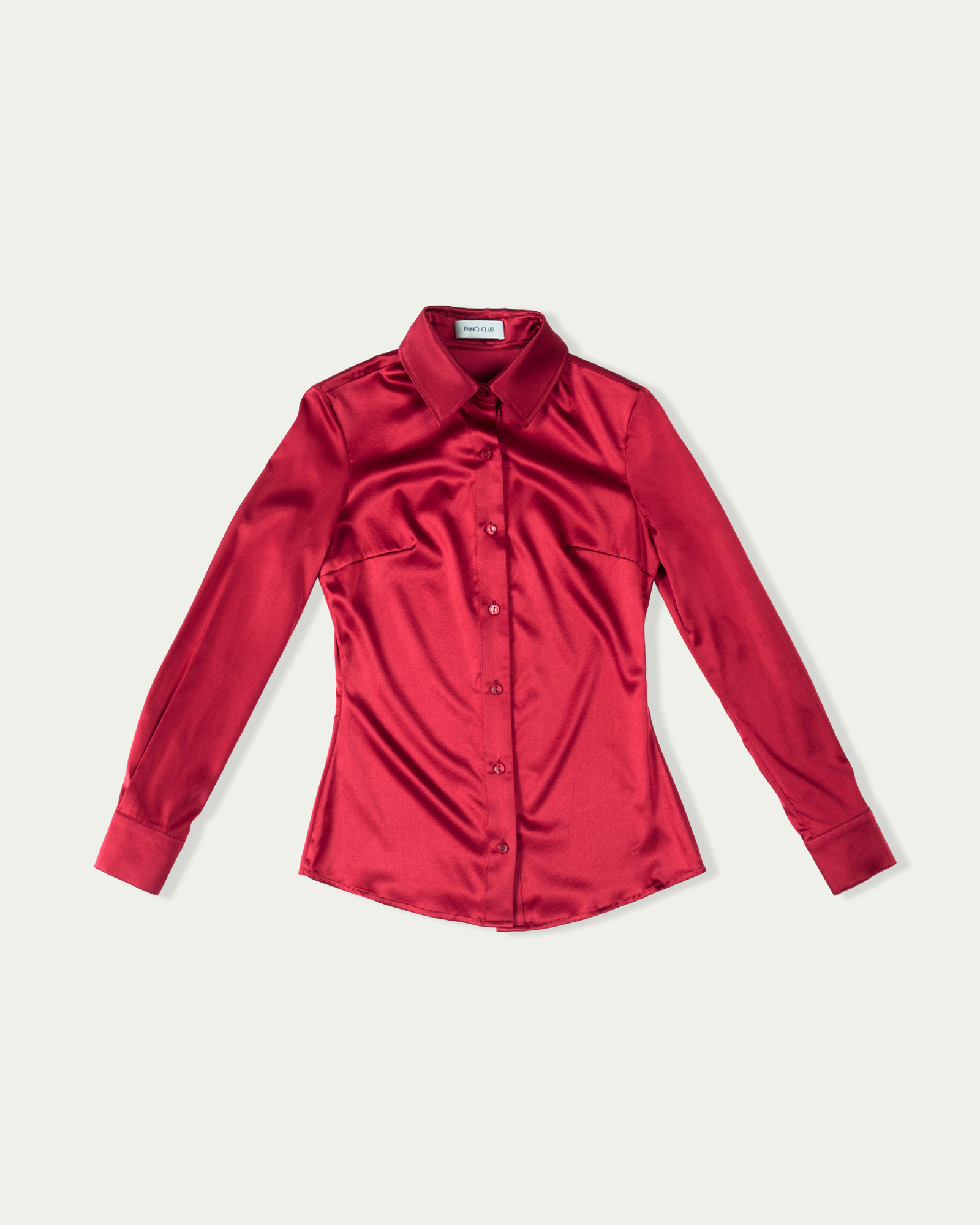 A refined fitted shirt in charmeuse silk, the fluid drape and subtle sheen highlight its tailored silhouette, balanced with a sharp spread collar and double-button cuffs. Style it with wide-leg trousers, a mini skirt, capri pants, or a midi skirt for effortless polish.