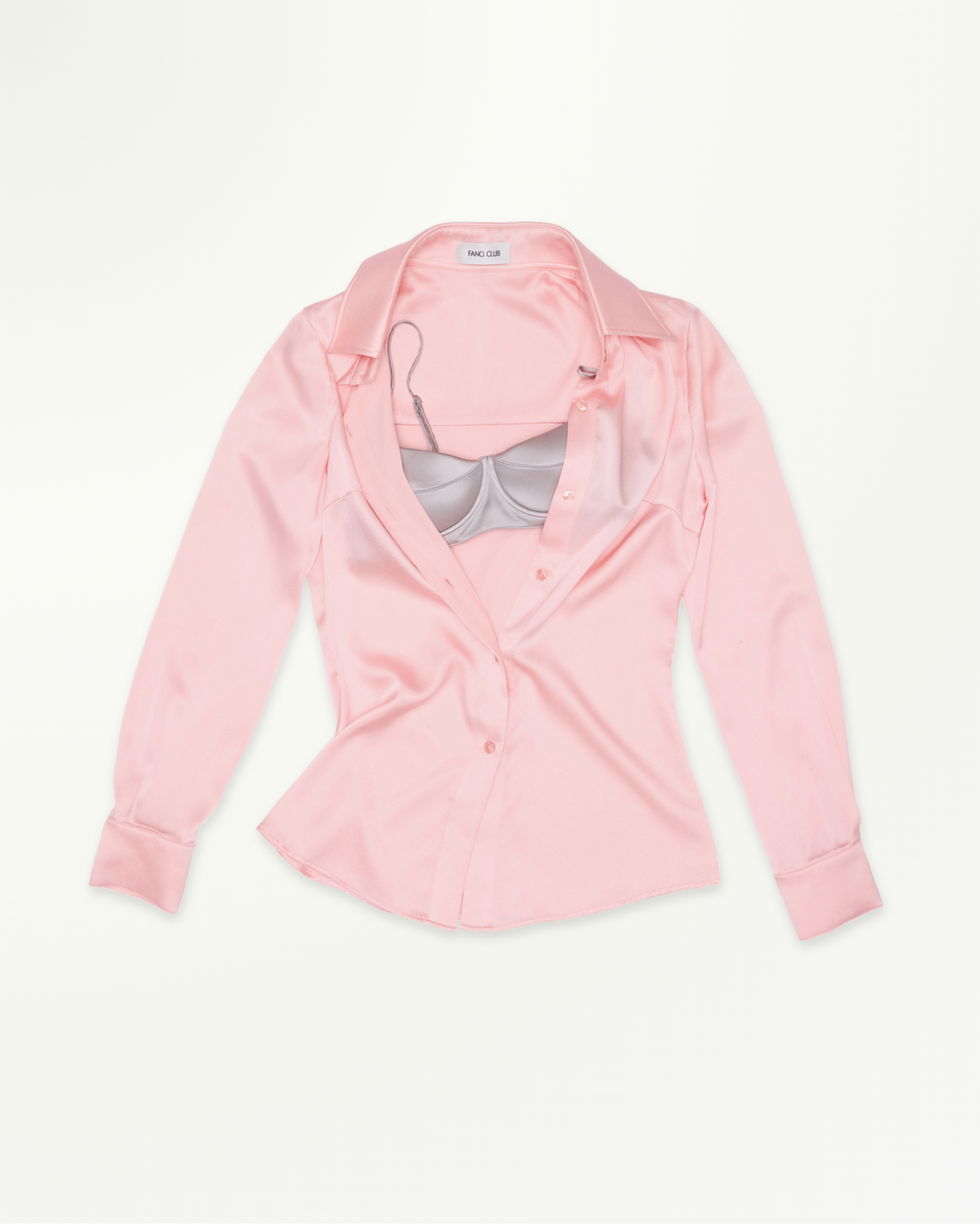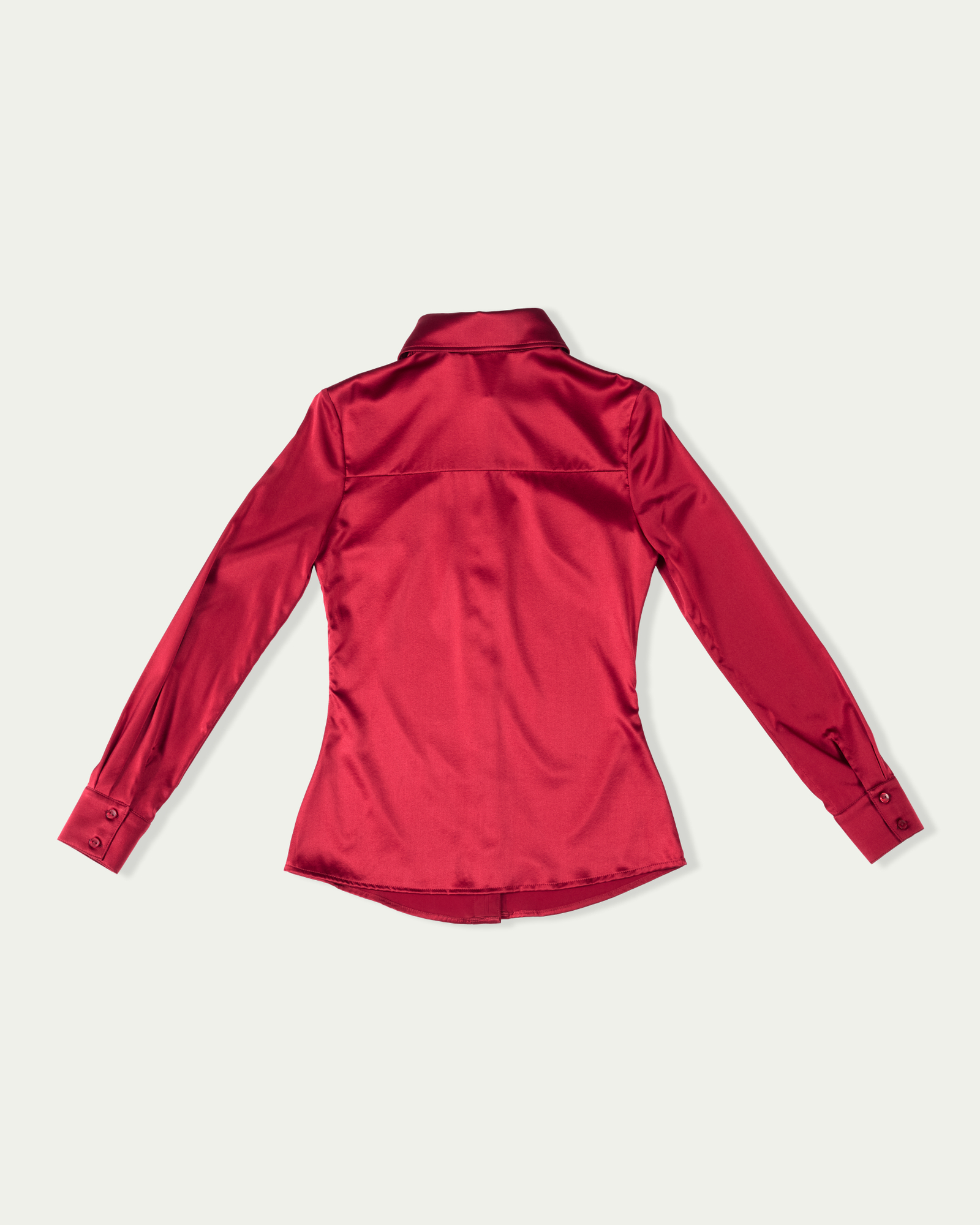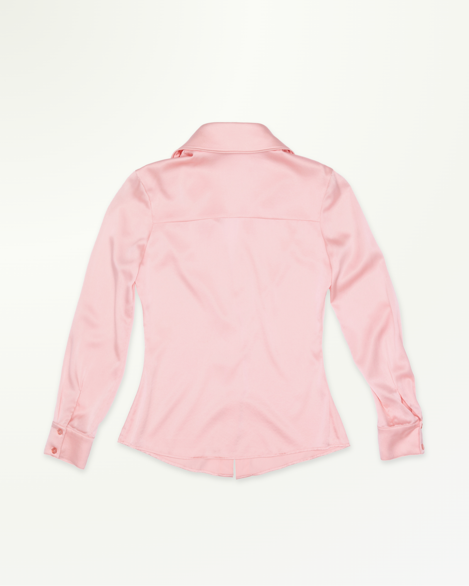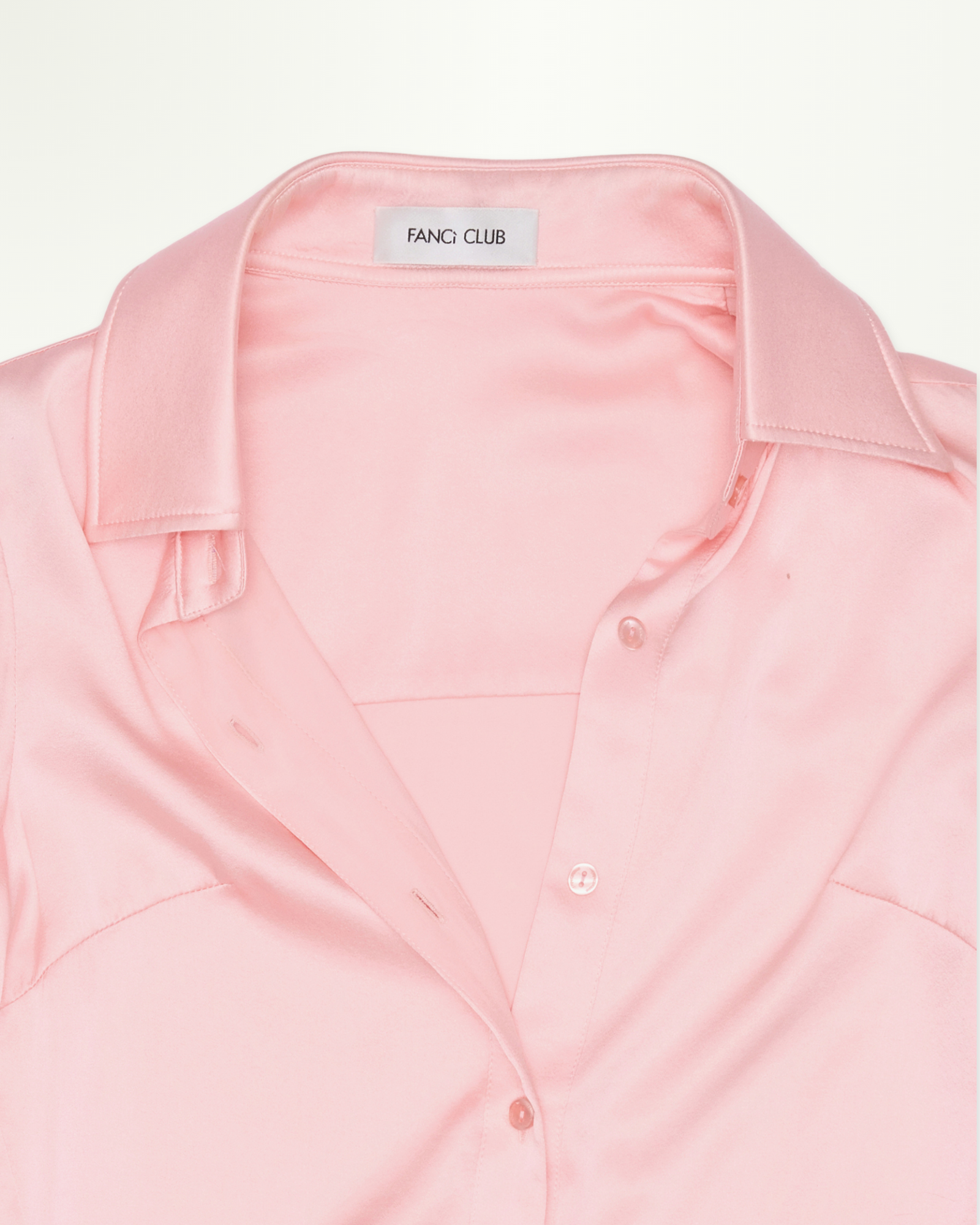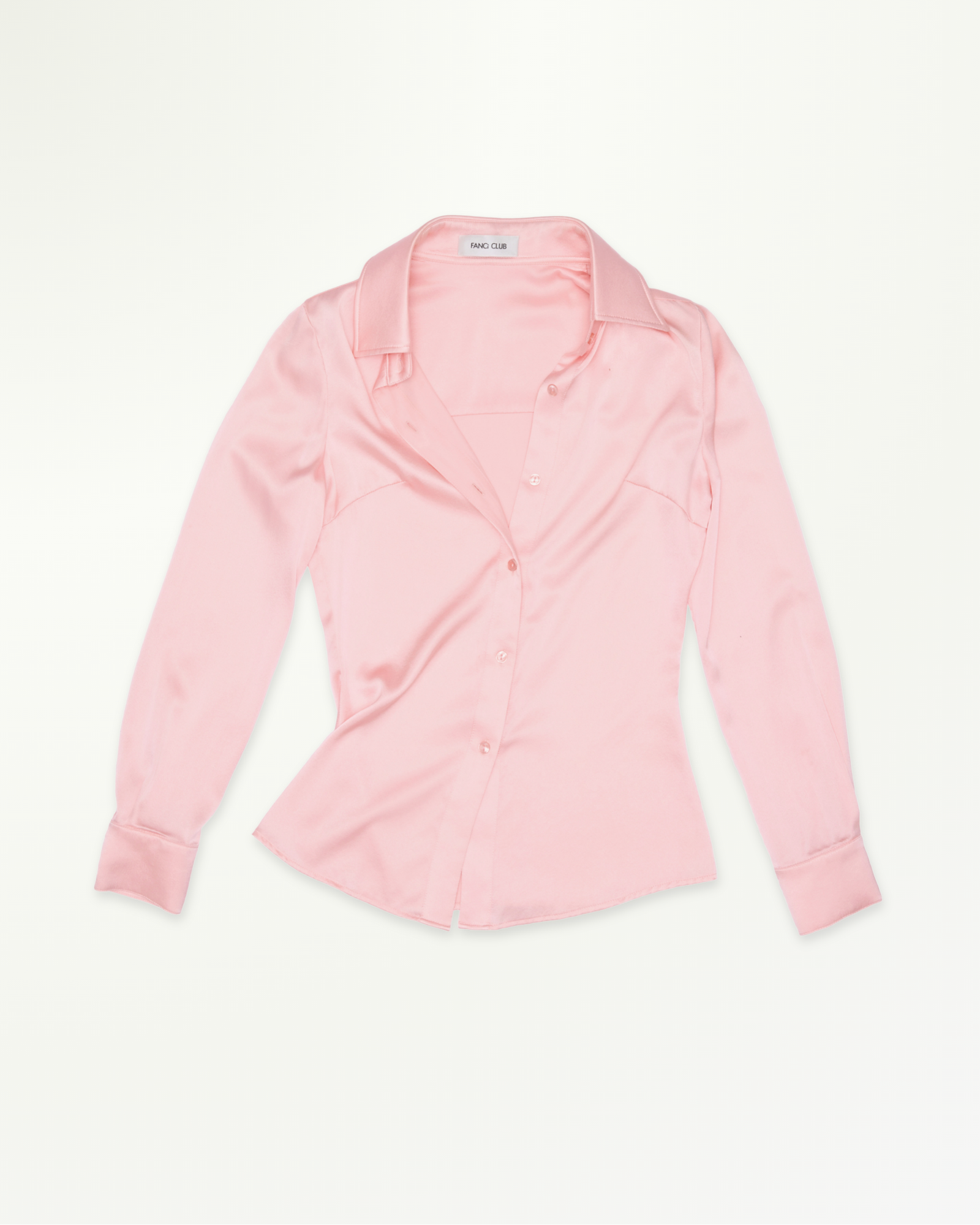 A refined fitted shirt in charmeuse silk, the fluid drape and subtle sheen highlight its tailored silhouette, balanced with a sharp spread collar and double-button cuffs. Style it with wide-leg trousers, a mini skirt, capri pants, or a midi skirt for effortless polish.