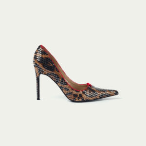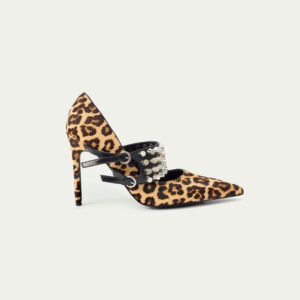 Pointed toe, with sheepskin footbed and leather sole Wrapped studded ankle strap with tie closure (with rosette-attached on one side) Logo-imprinted heel