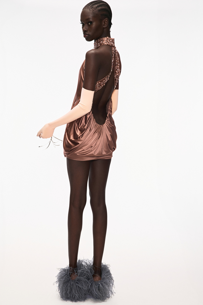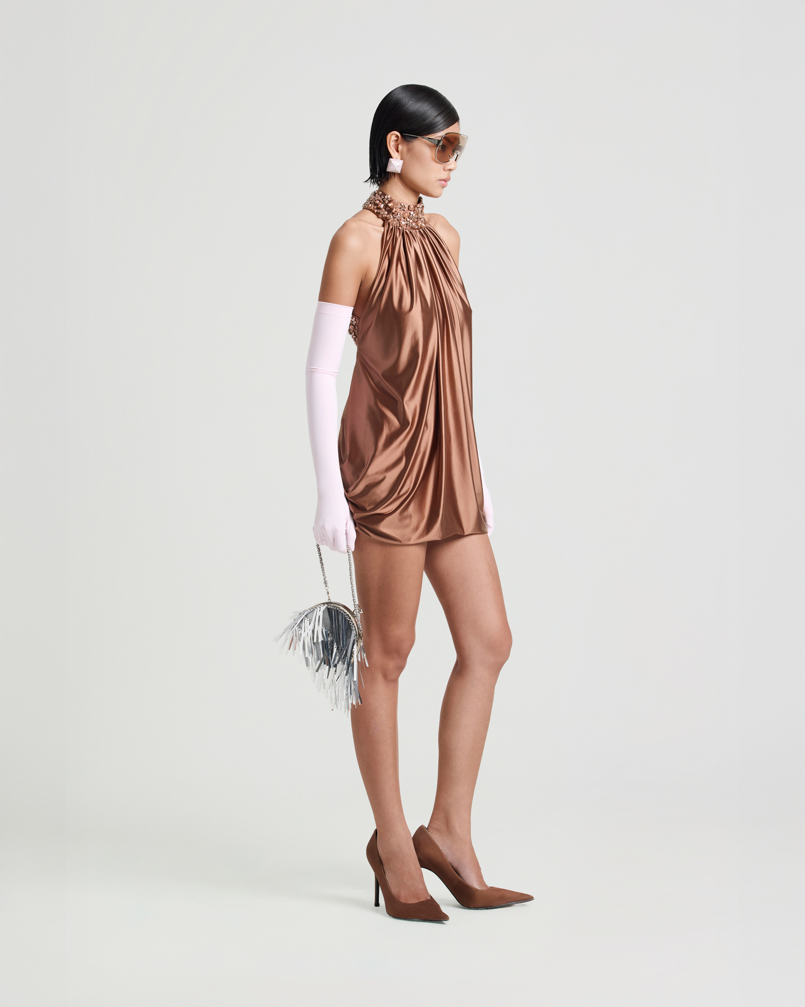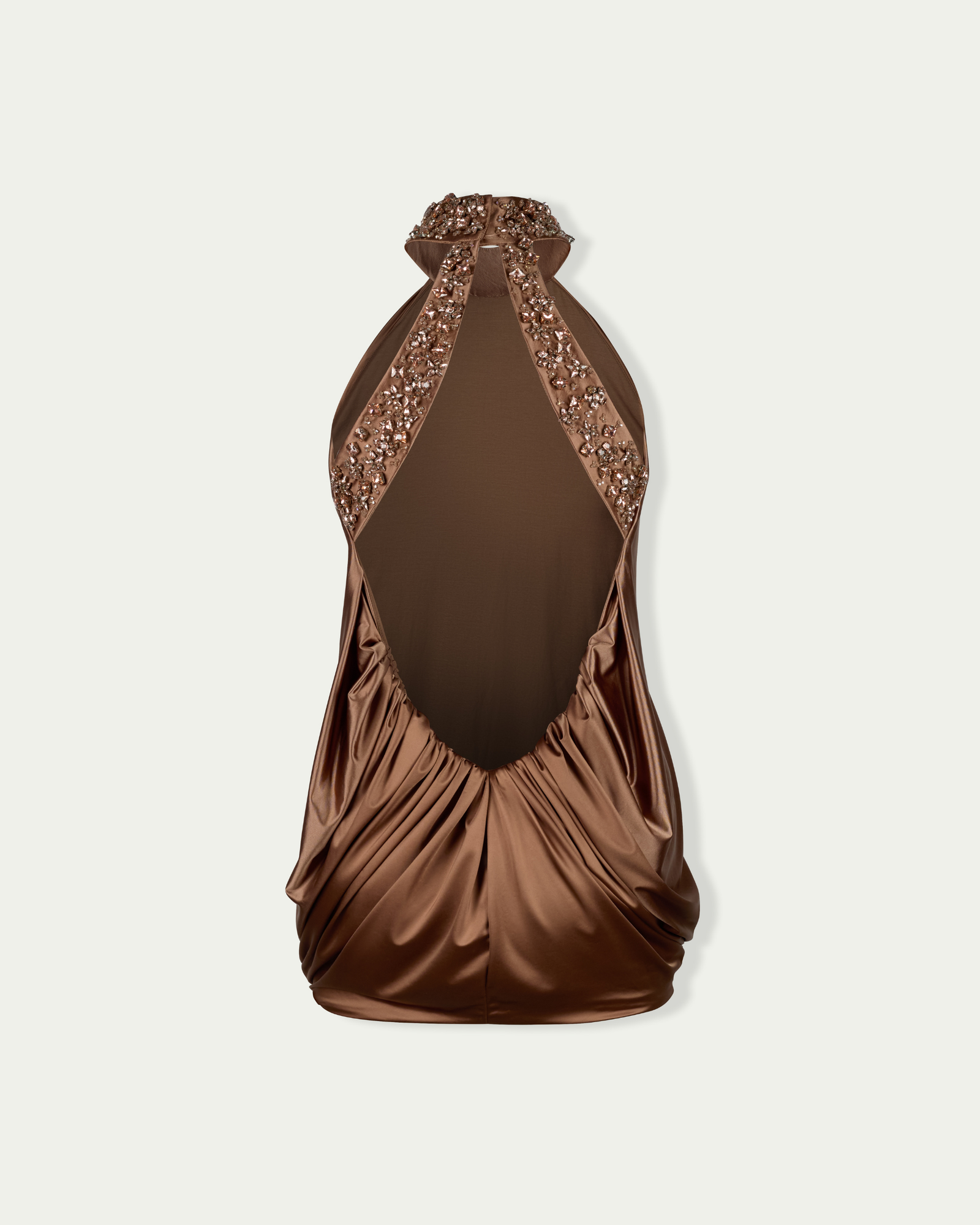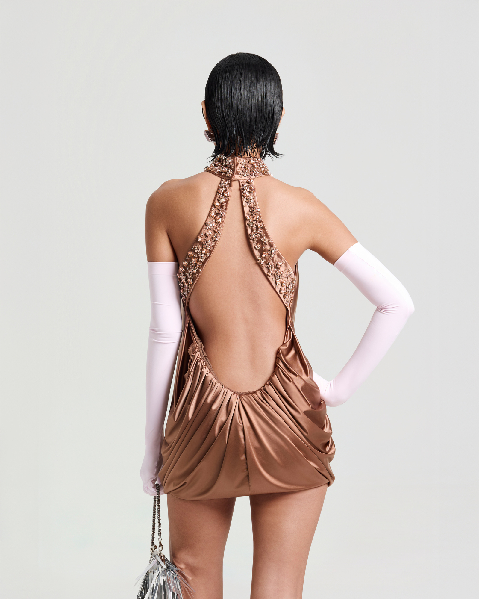 Halter neck mini dress featuring a deep open back and a draped bodice that creates soft, flowing movement. Crystal embellishments adorn the back straps, the dress offers a polished silhouette with a subtle sheen that highlights the curves, completed through sixteen hours of meticulous hand-beading.