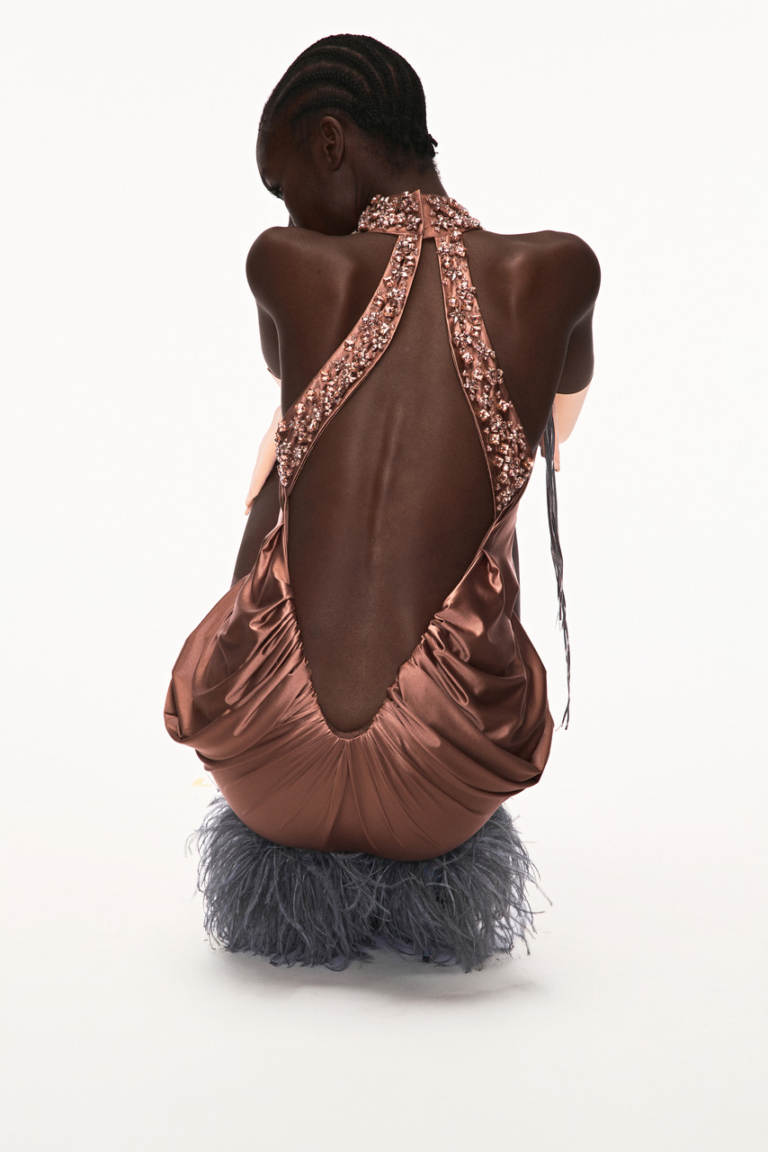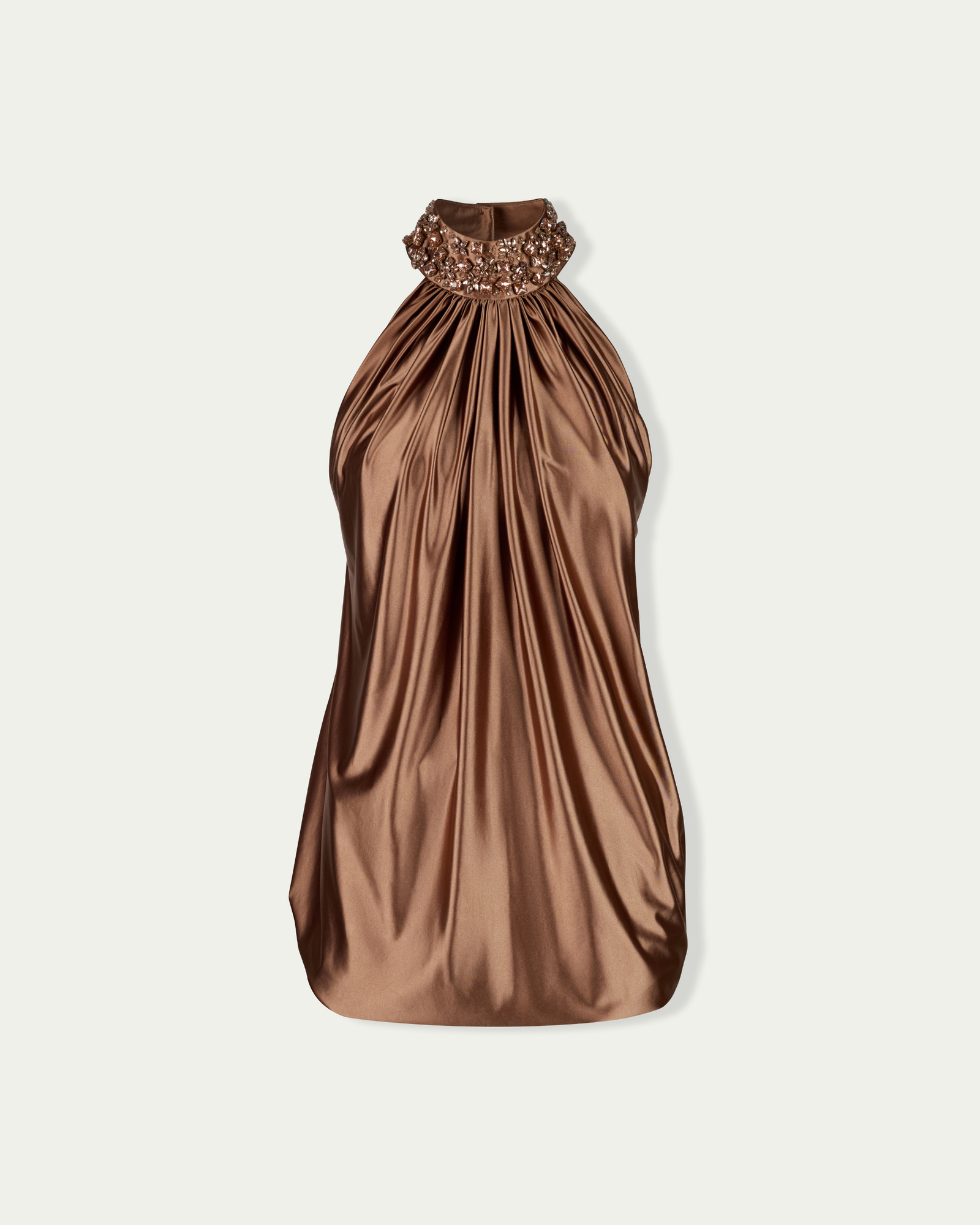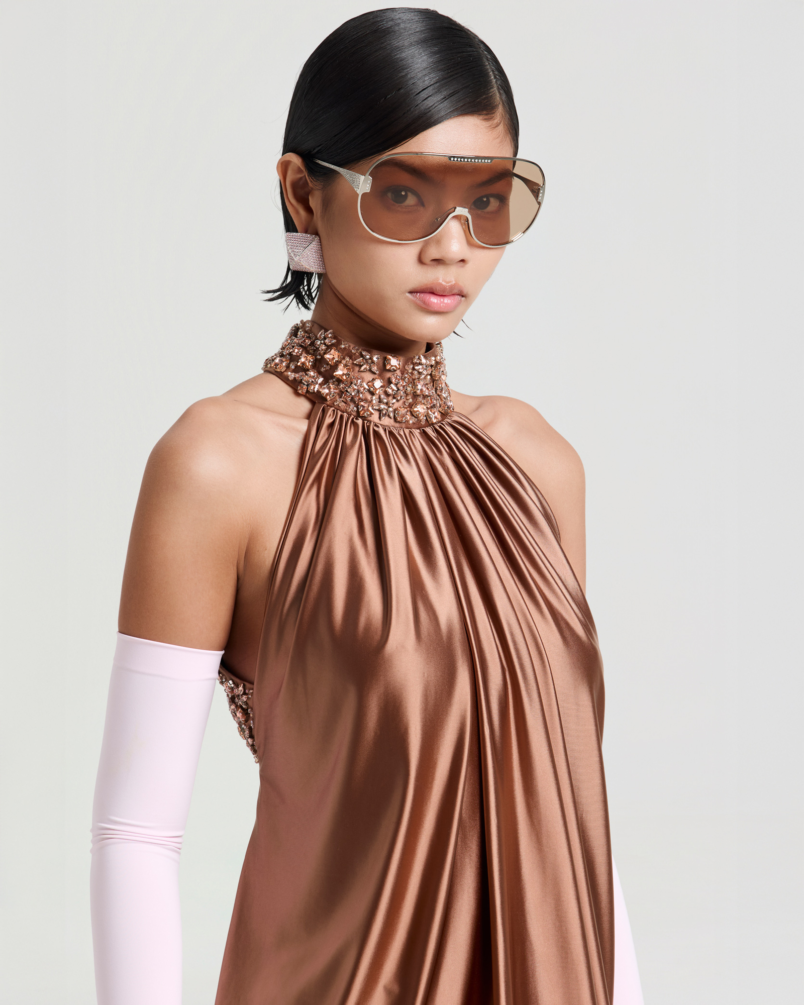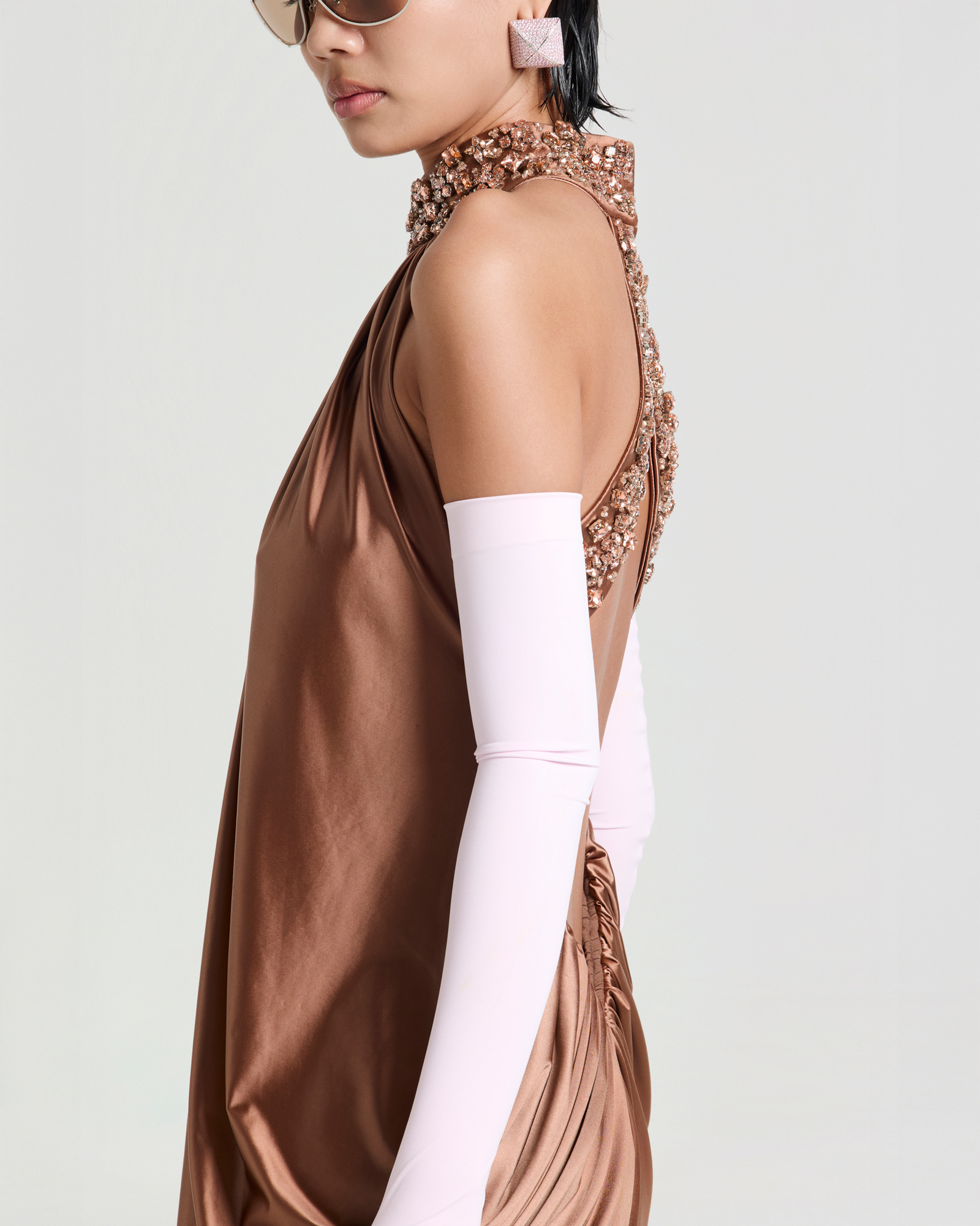 Halter neck mini dress featuring a deep open back and a draped bodice that creates soft, flowing movement. Crystal embellishments adorn the back straps, the dress offers a polished silhouette with a subtle sheen that highlights the curves, completed through sixteen hours of meticulous hand-beading.