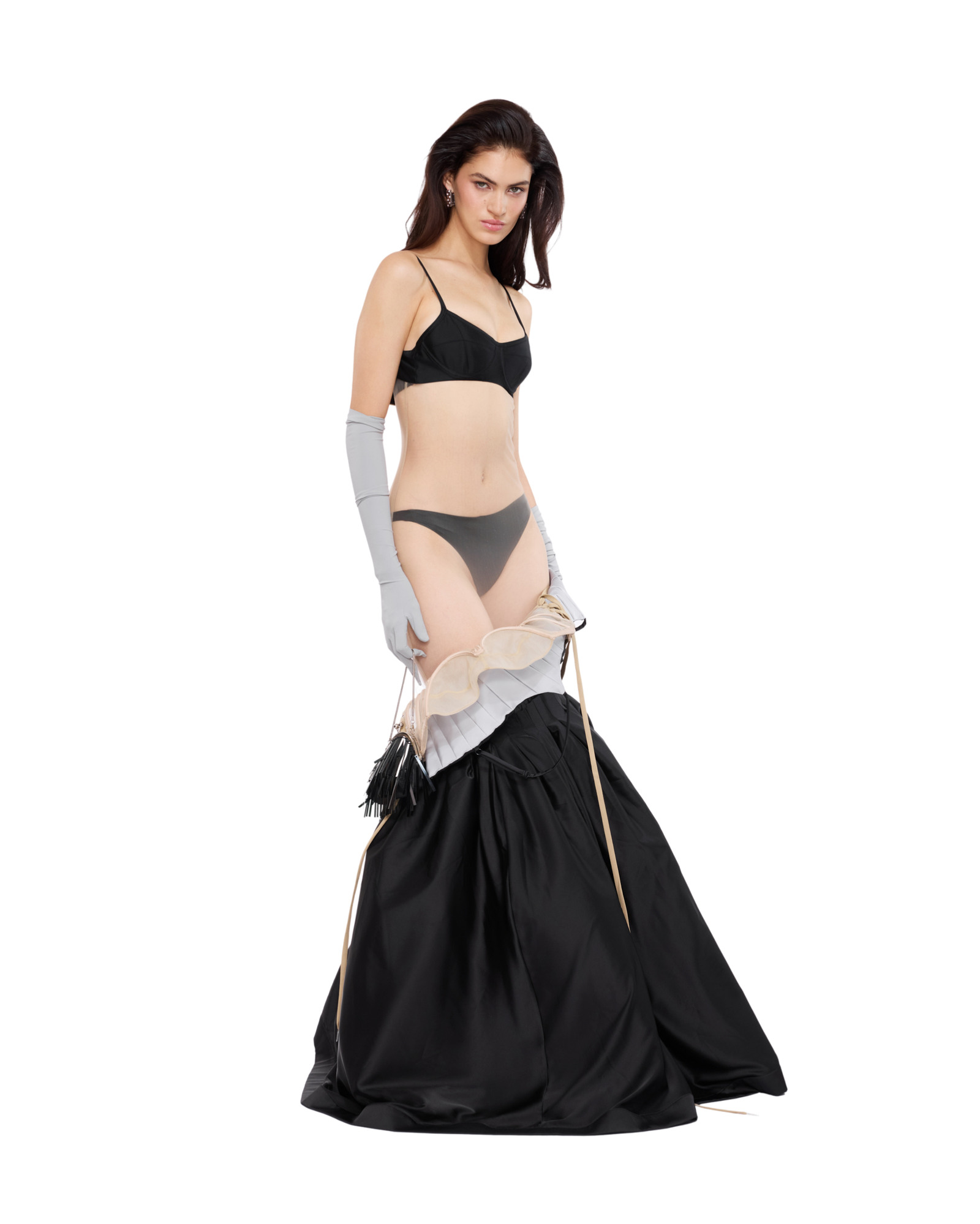 An evening gown that feels like it’s falling apart yet perfectly composed. The “un-dressing” design exposes and conceals in equal measure, fine mesh tracing the body, boning framing the curves, lace-up lines pulling it all together. A mermaid silhouette unfolds with each step, carrying the tension of rawness and elegance.
