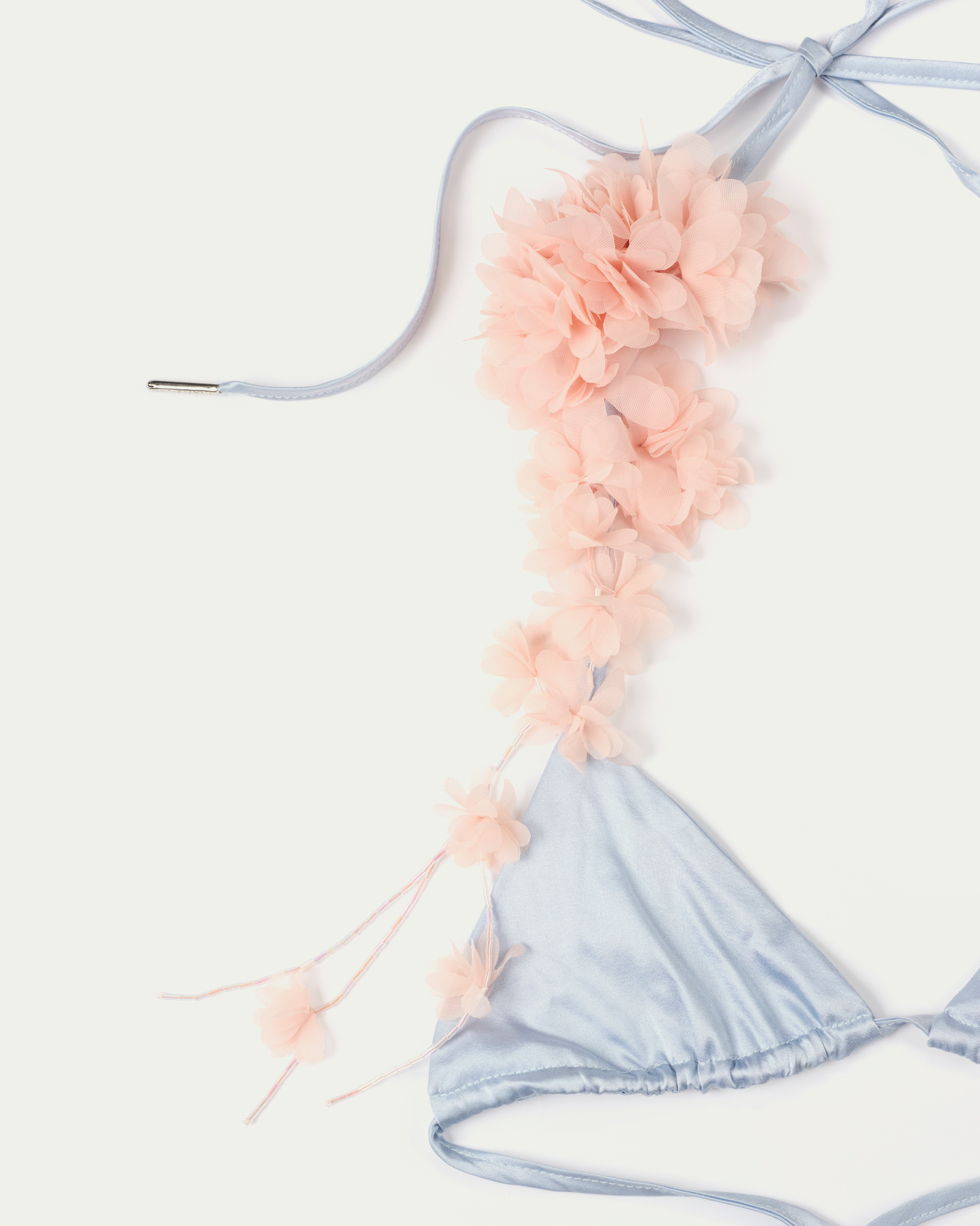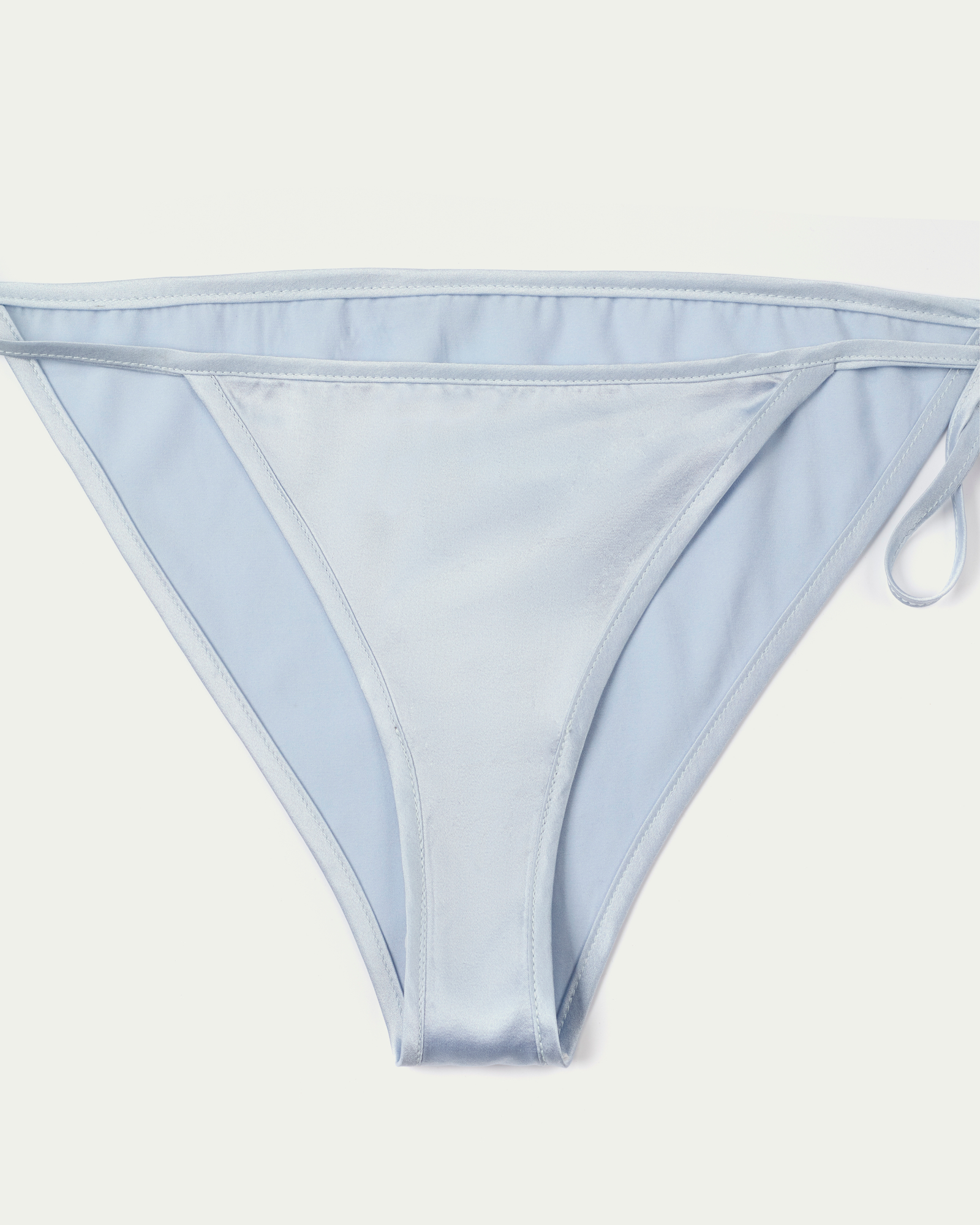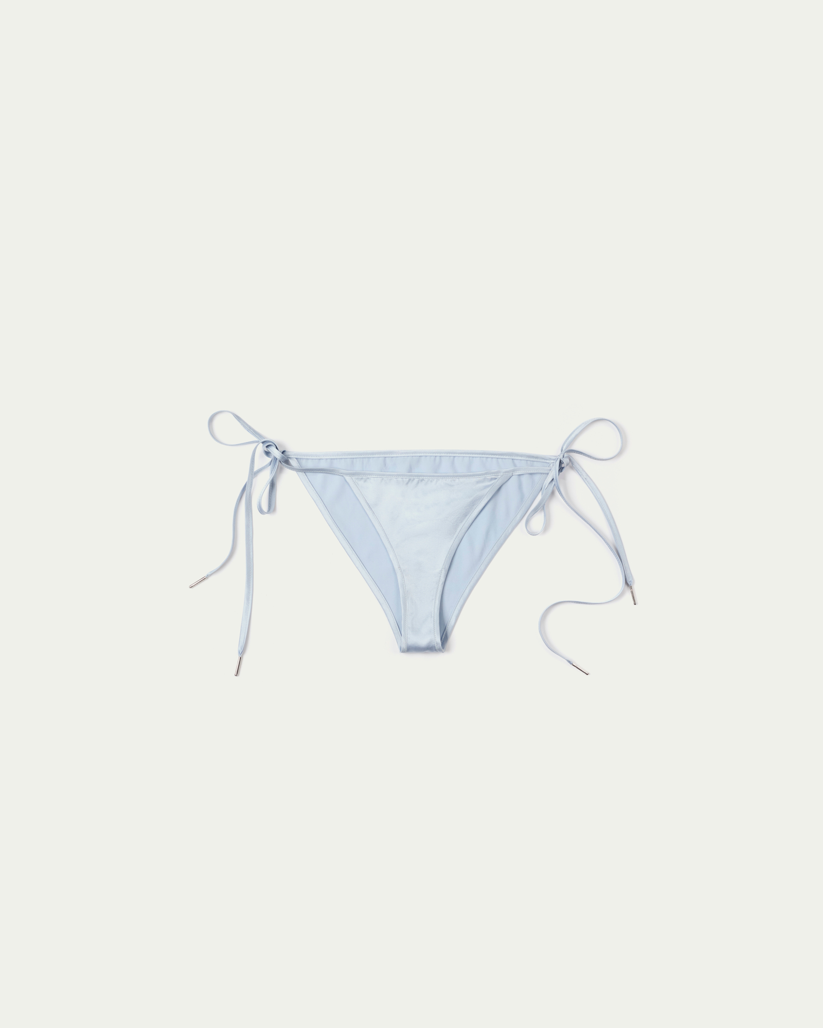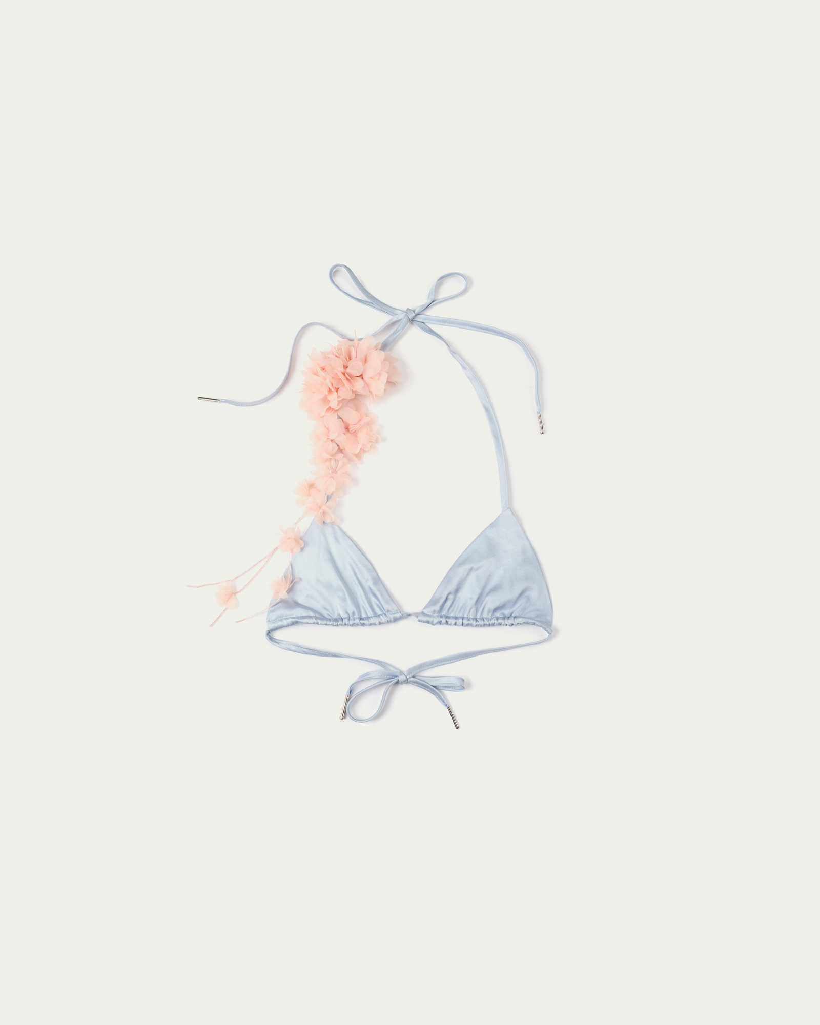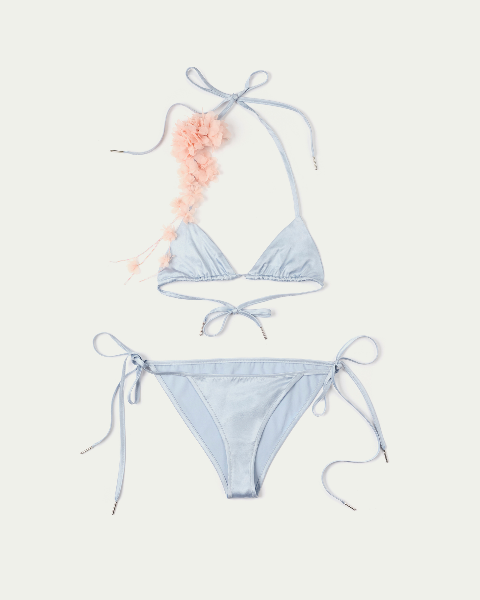 A silk bikini set cut in a classic triangle shape, finished with self-tie halter straps and matching bottoms. The smooth, fluid fabric enhances the body’s natural lines while offering a refined touch. Style it with a mini skirt, long gloves, and a handheld bag for a bold, playful twist.