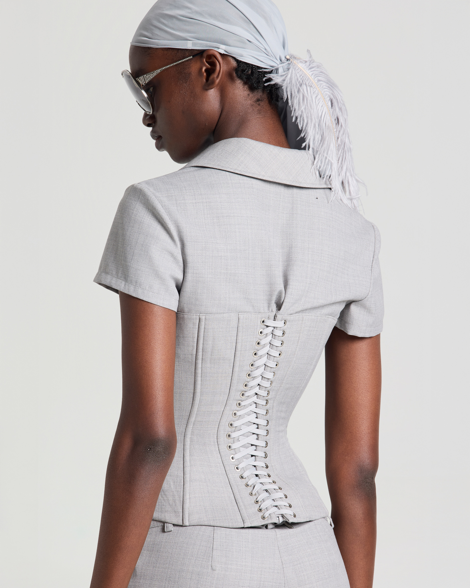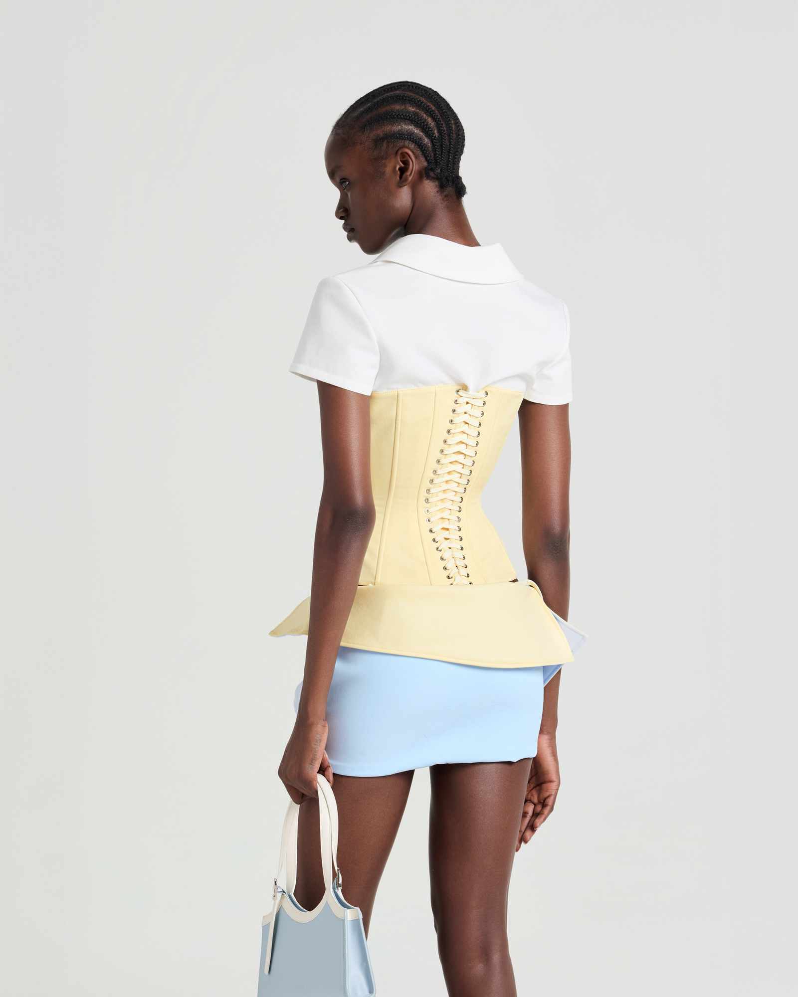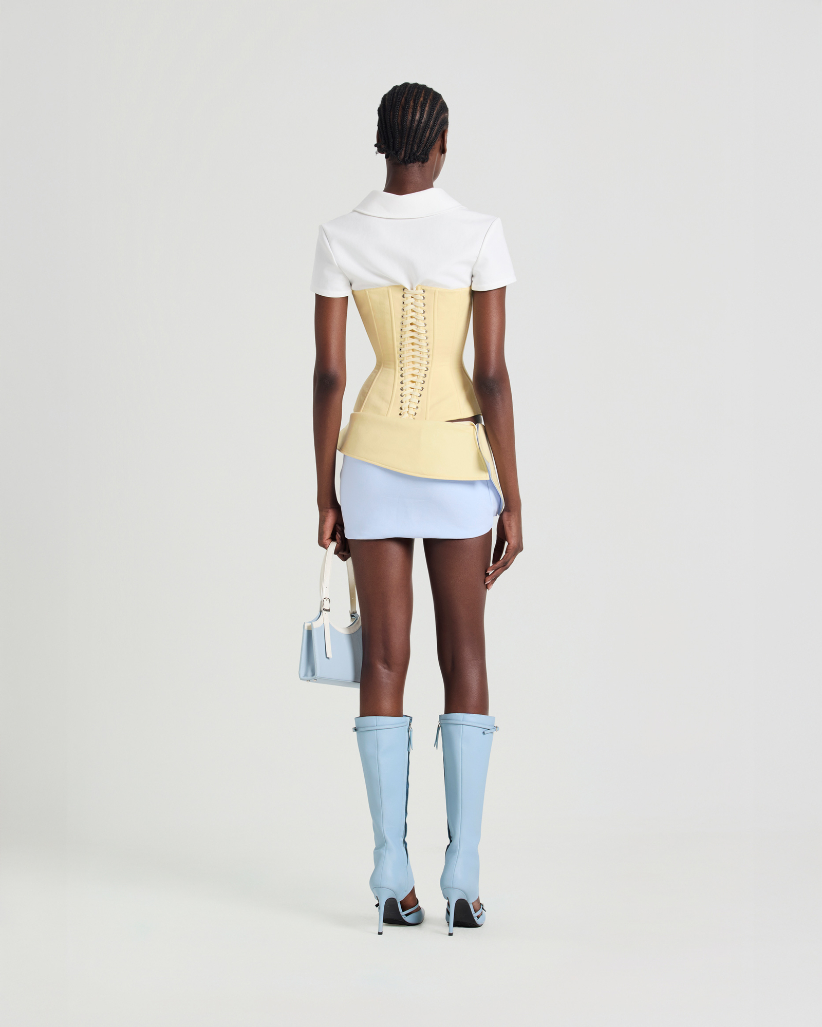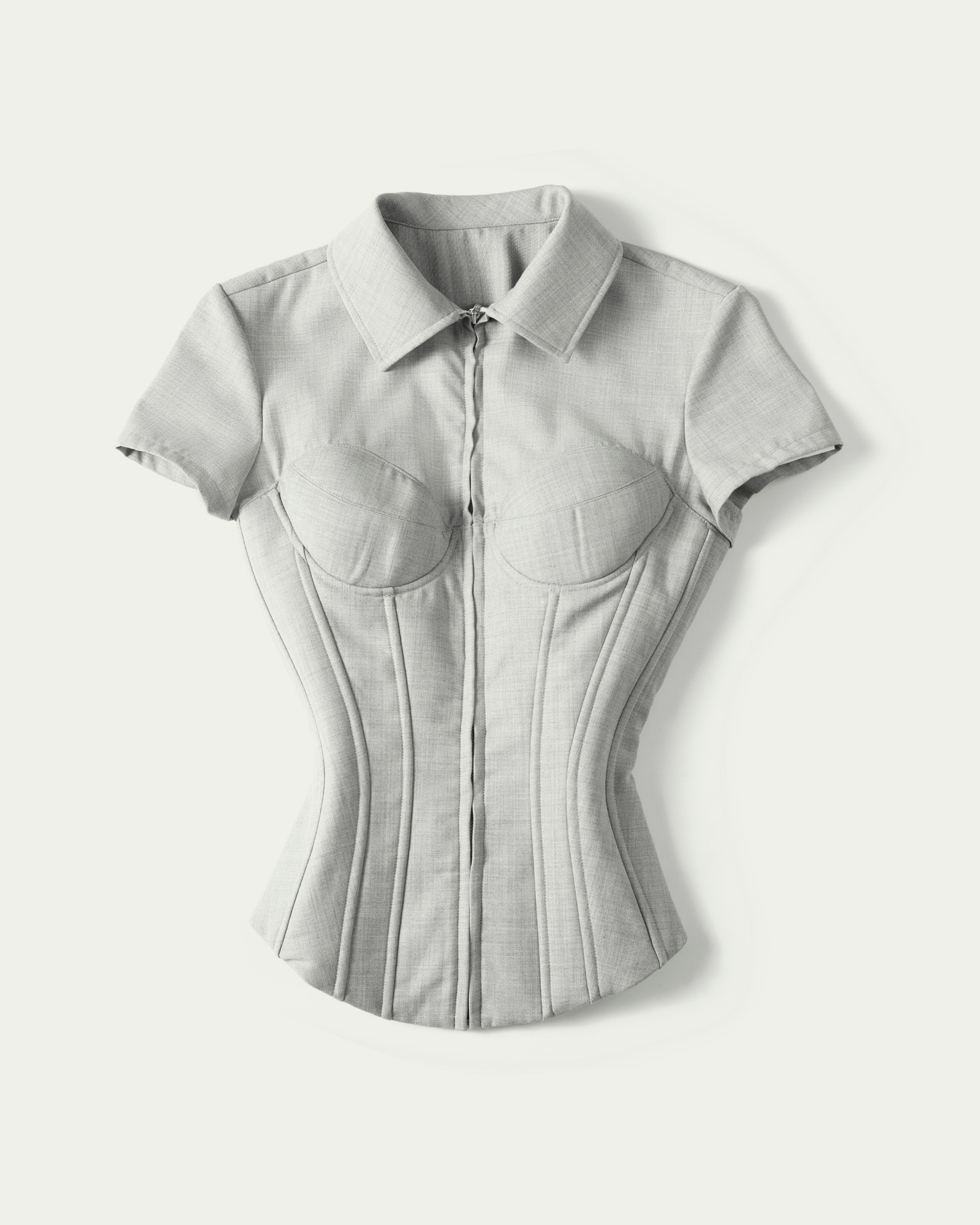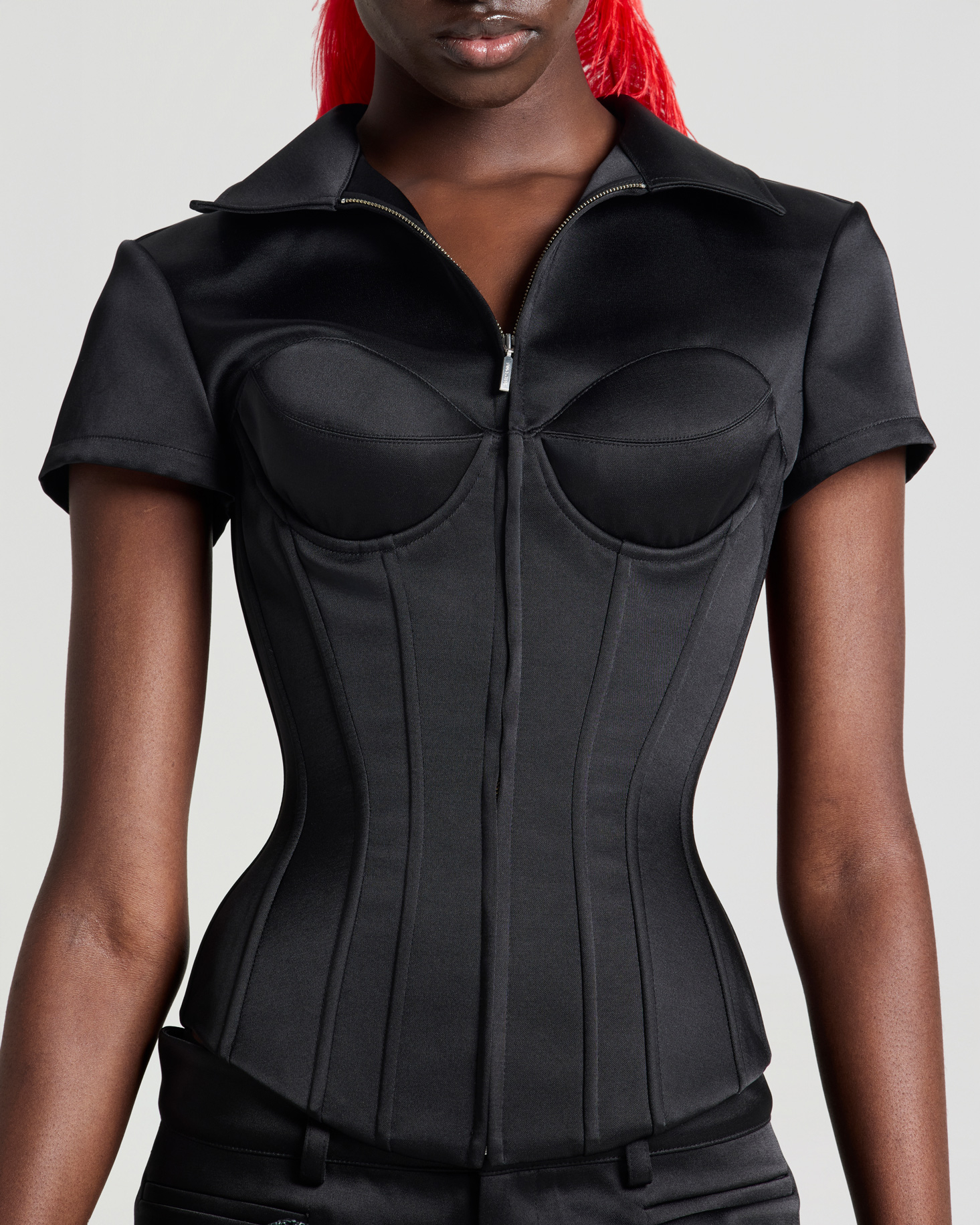 A sculpted corset-style t-shirt with a sharp, body-hugging silhouette. Designed to define the waist and frame the bust, the piece balances modern sensuality with a tailored edge. Style it with low-rise trousers, a structured mini skirt, or layered under a sharp blazer for a refined yet provocative look.
