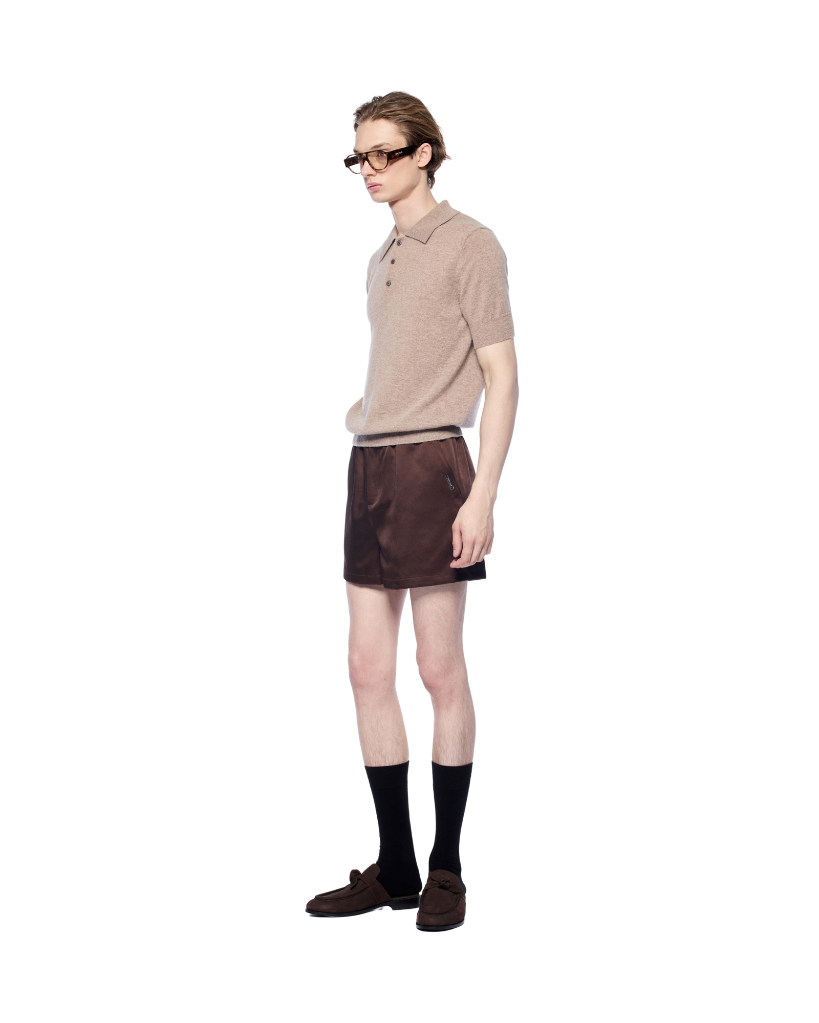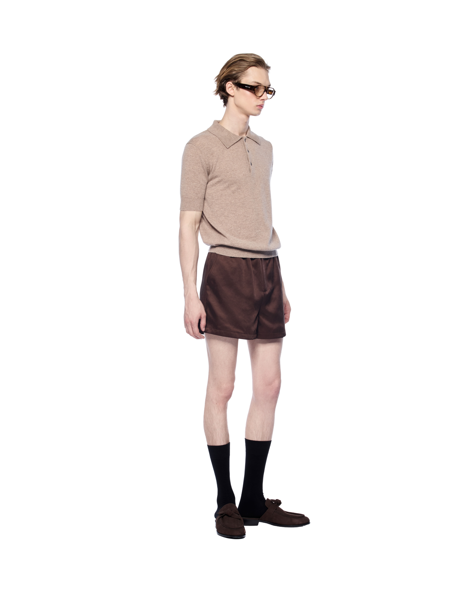 Silk micro shorts with double front pockets and an elastic waistband for a relaxed, straight fit. Pairs effortlessly with t-shirts or shirts for a minimalist, polished look