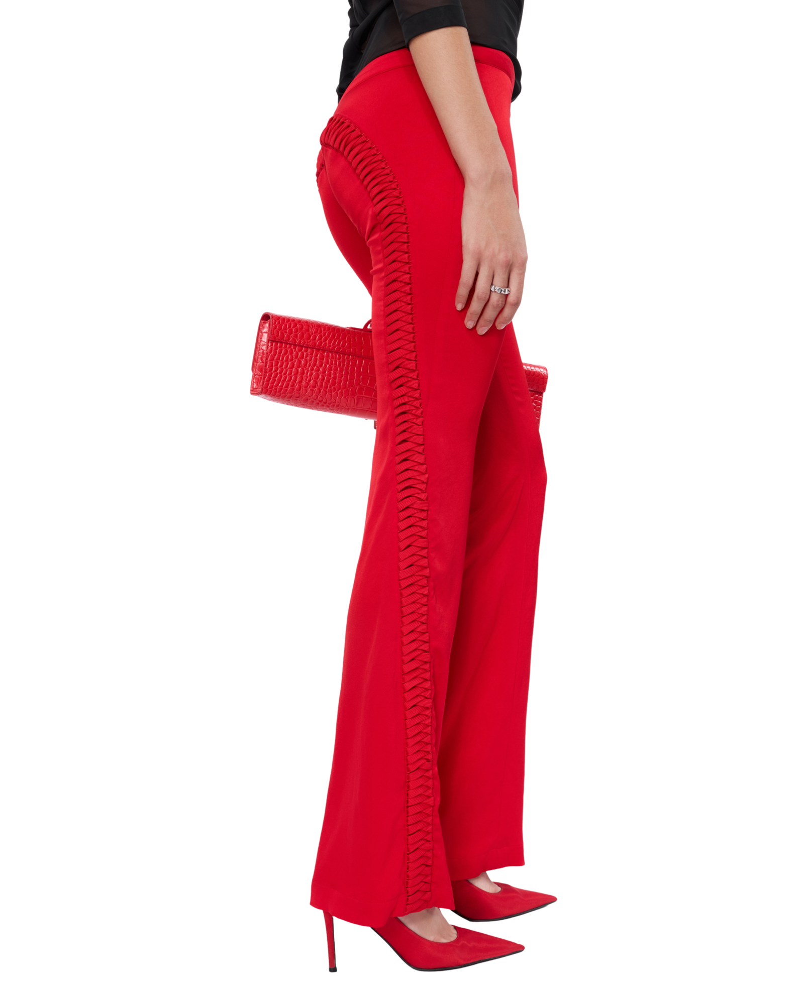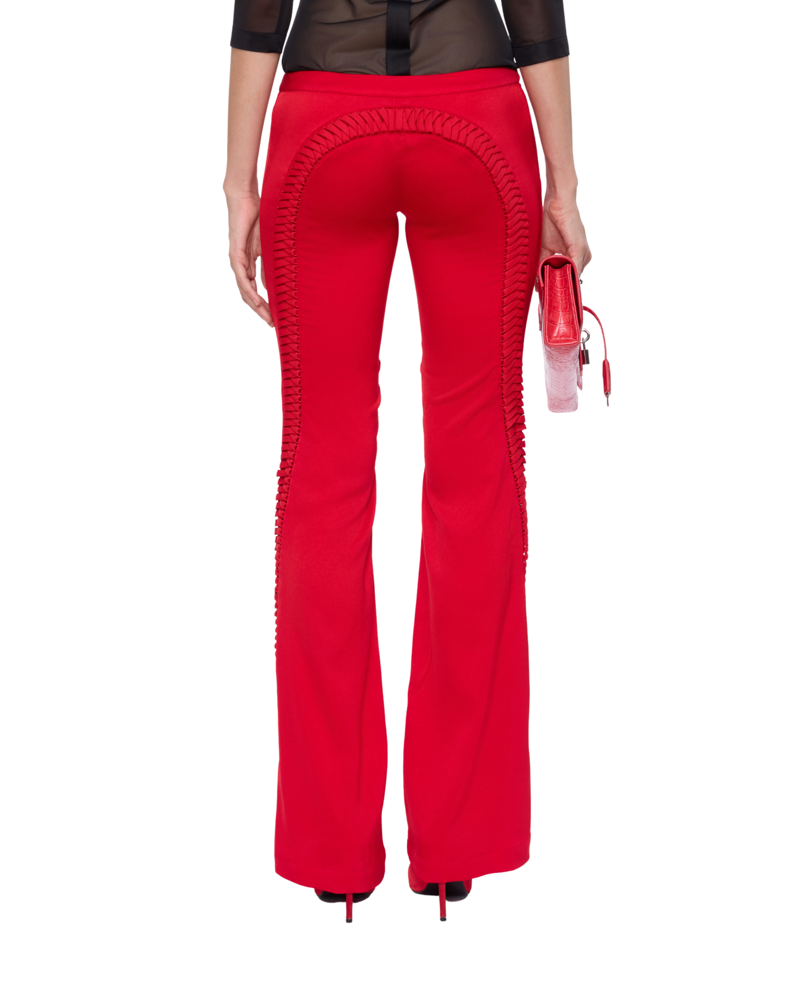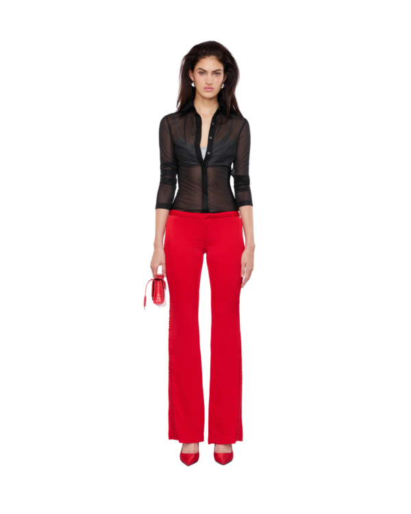 Satin pants detailed with bold lacing that runs from the curve of the hip to the back, adding a sleek, unexpected edge to the low-rise fit. Style them with a sharp shirt or a structured corset for a refined yet daring balance.