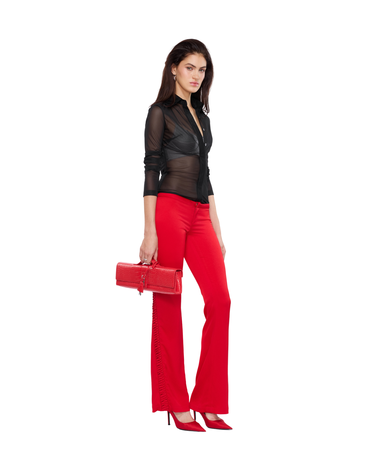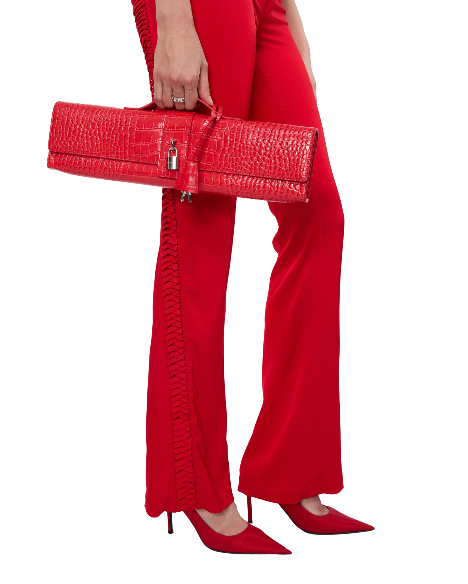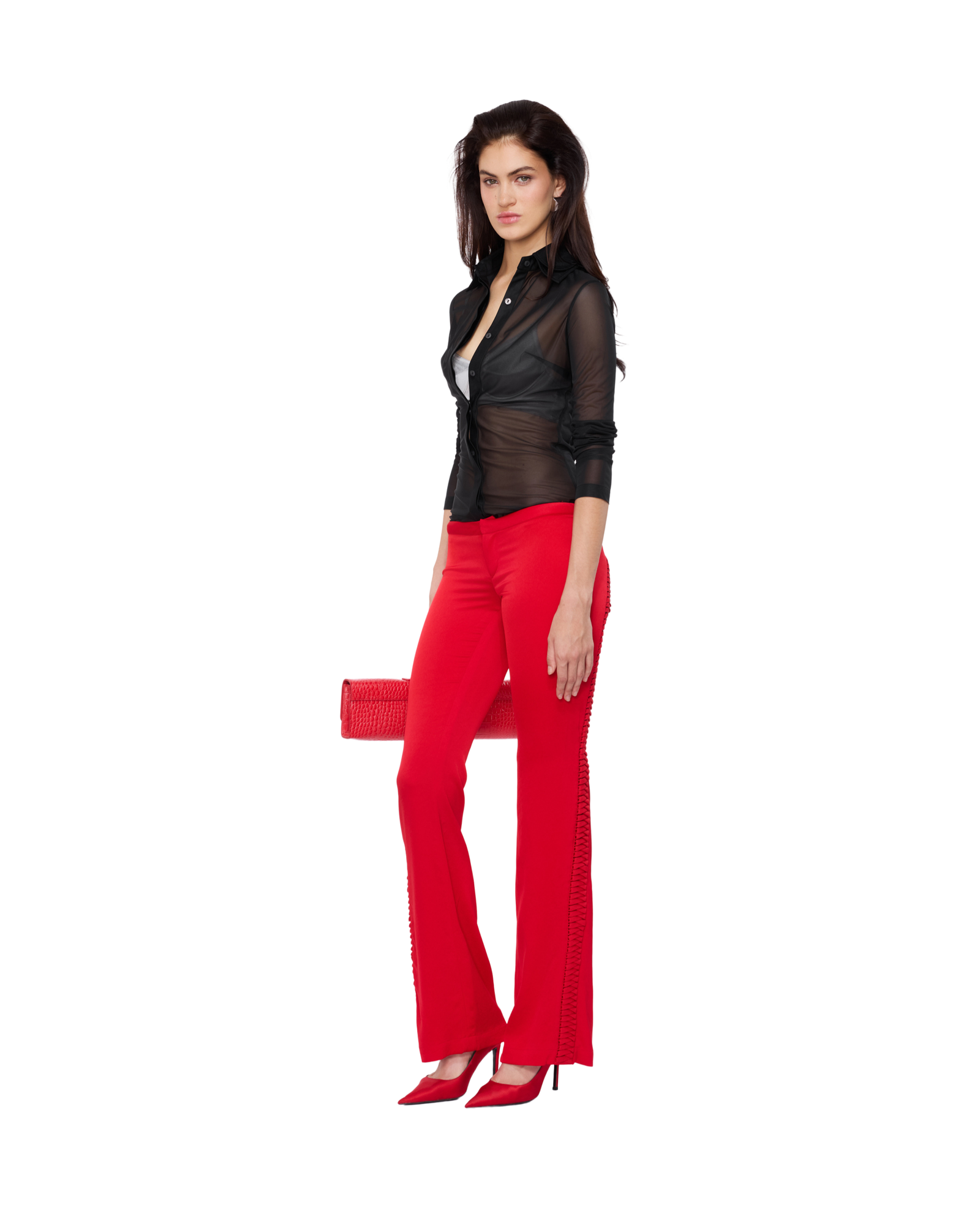 Satin pants detailed with bold lacing that runs from the curve of the hip to the back, adding a sleek, unexpected edge to the low-rise fit. Style them with a sharp shirt or a structured corset for a refined yet daring balance.