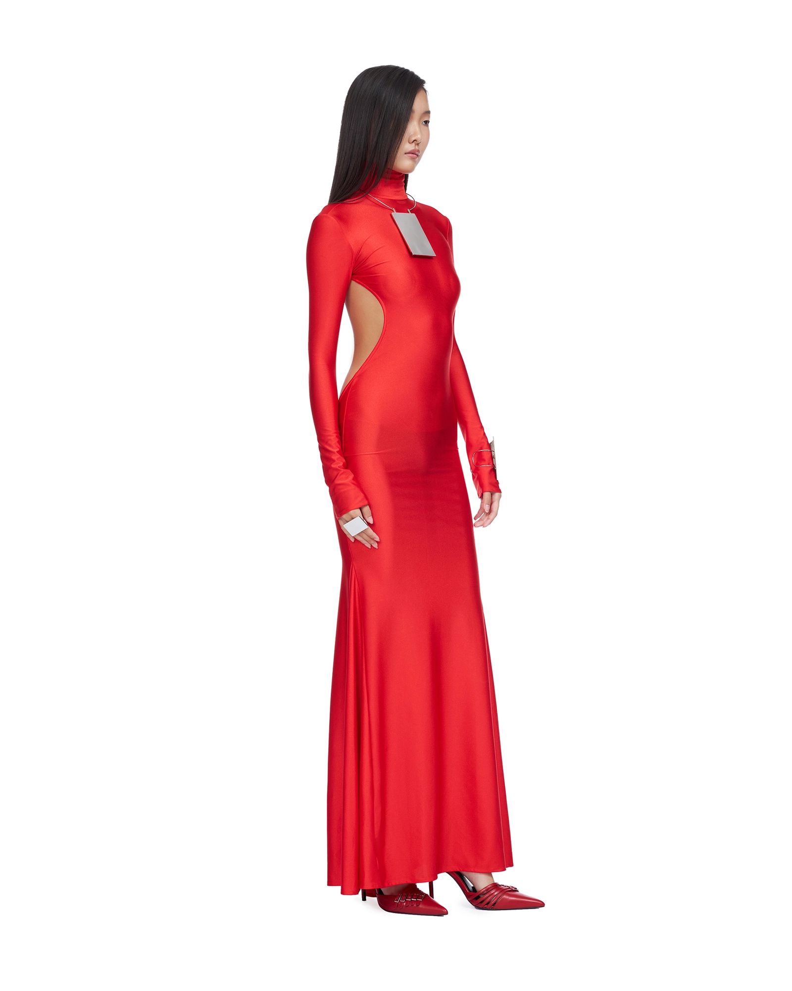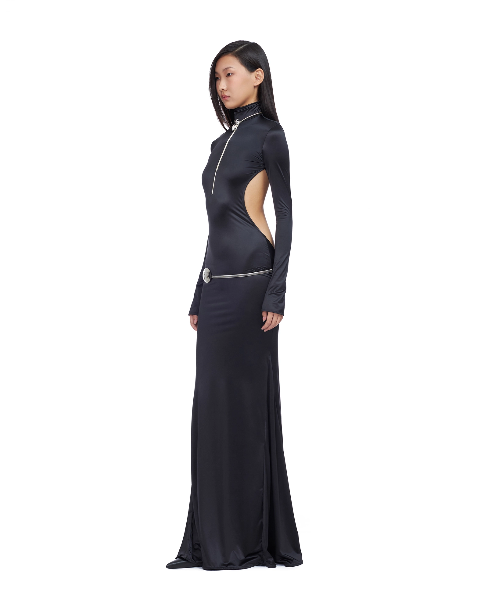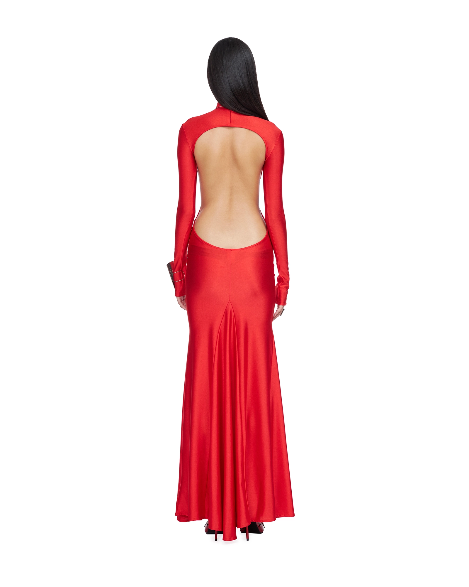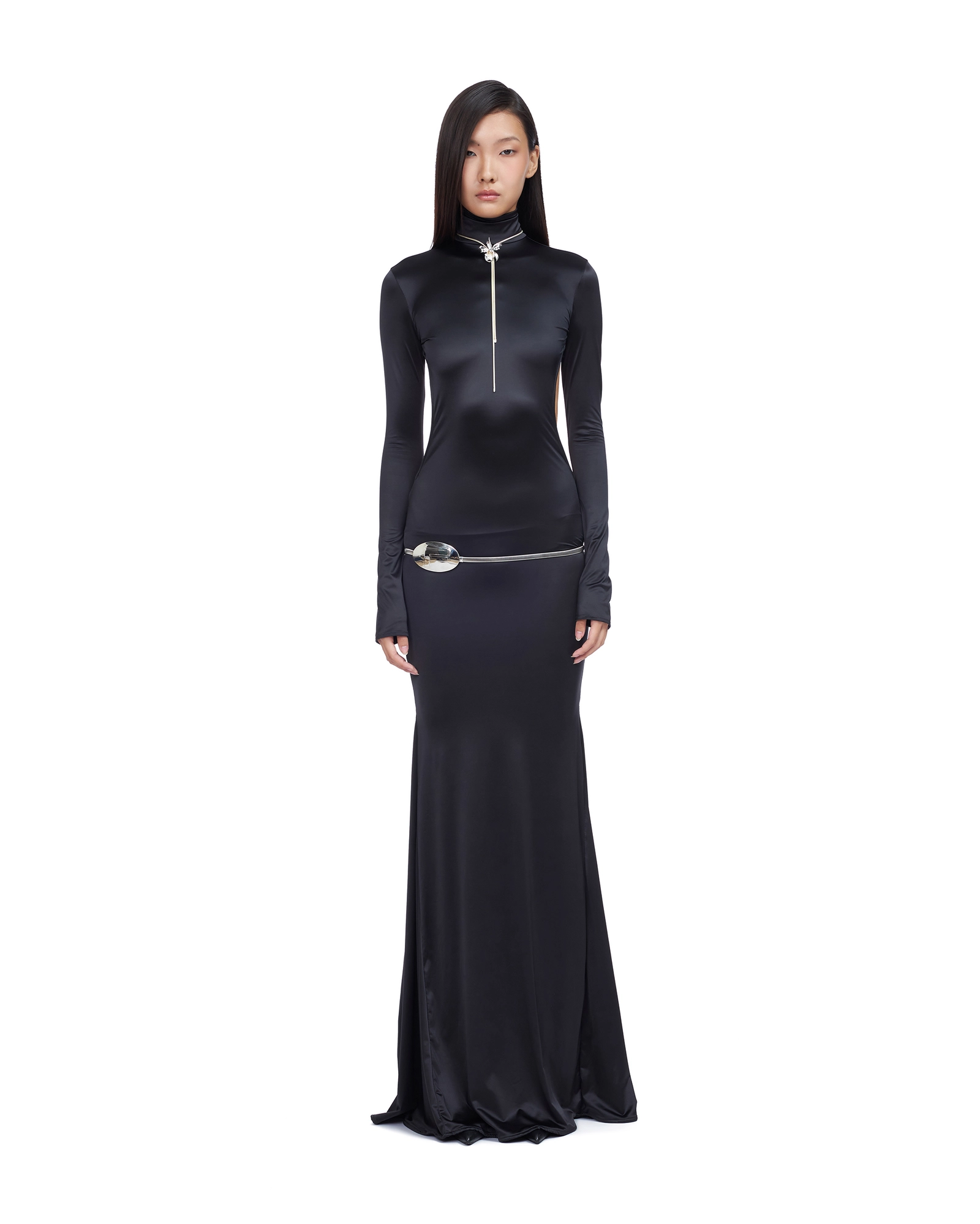 FLOOR-LENGTH BACKLESS GOWN, WITH LONG SLEEVES AND TURTLE NECK