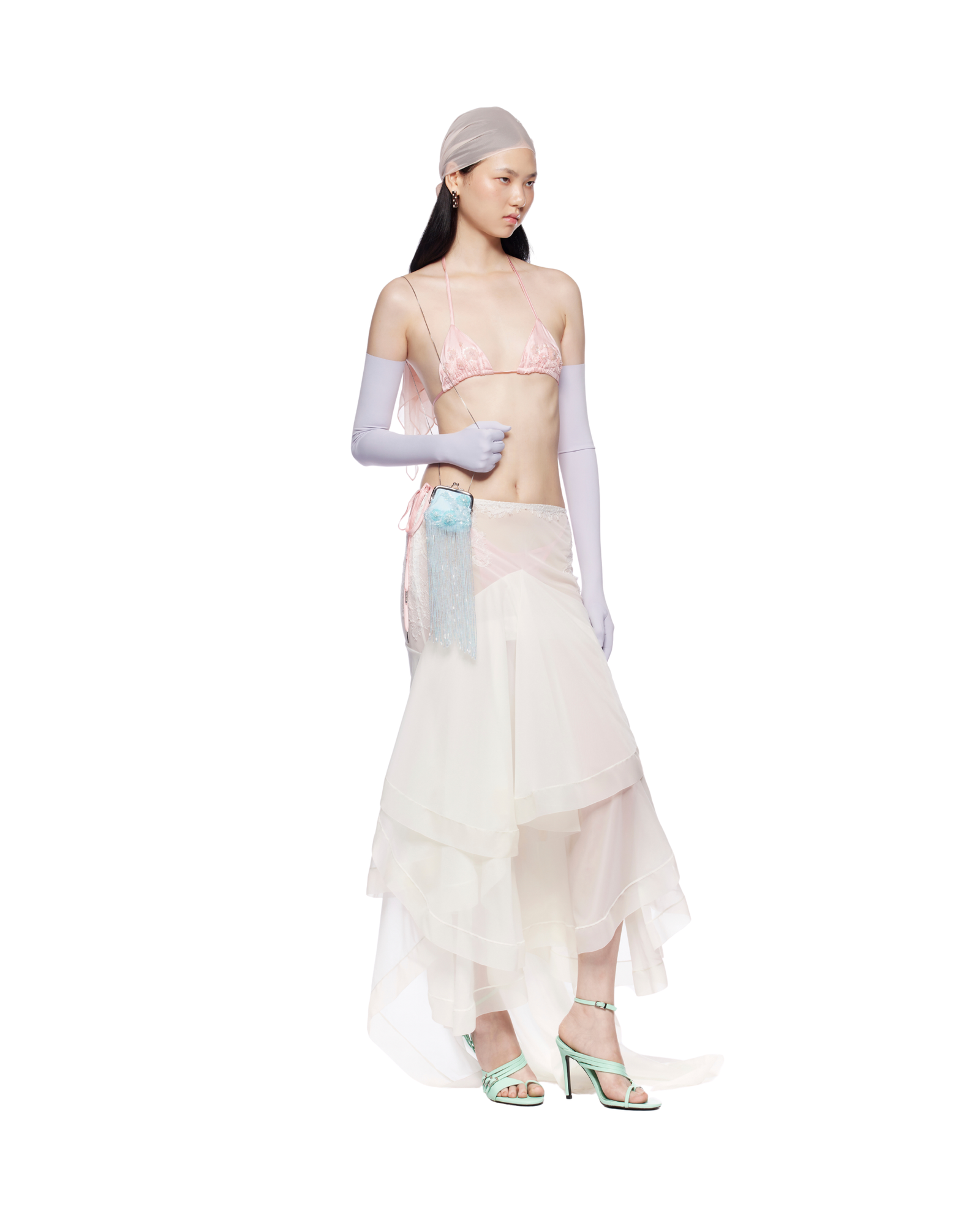 A sheer cascade maxi skirt with a low-rise fit and high-low layered ruffles. Lace appliqué with beaded details at the hip adds contrast, while it pairs beautifully with a bikini set, corset, and strapped heels for a bold, contemporary look