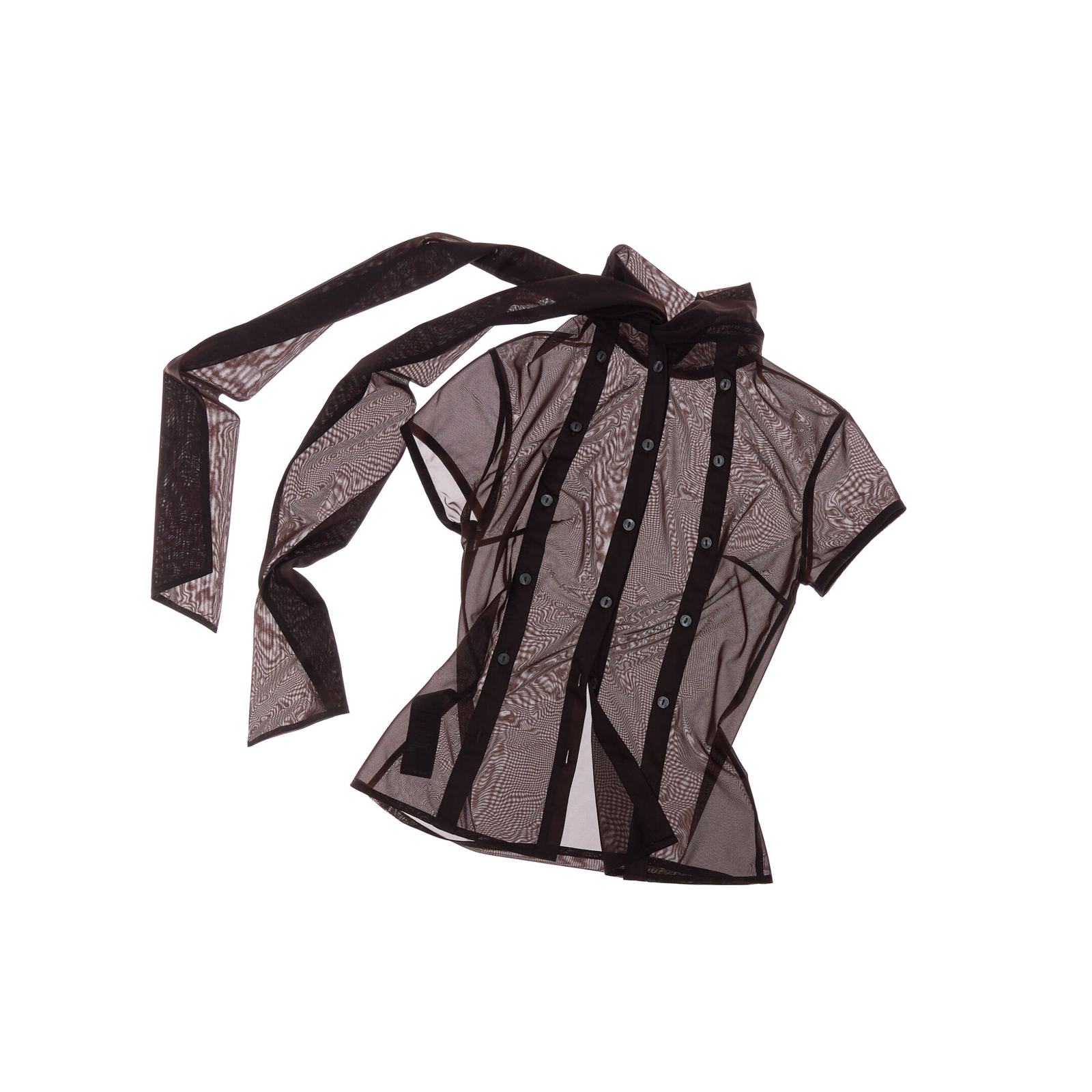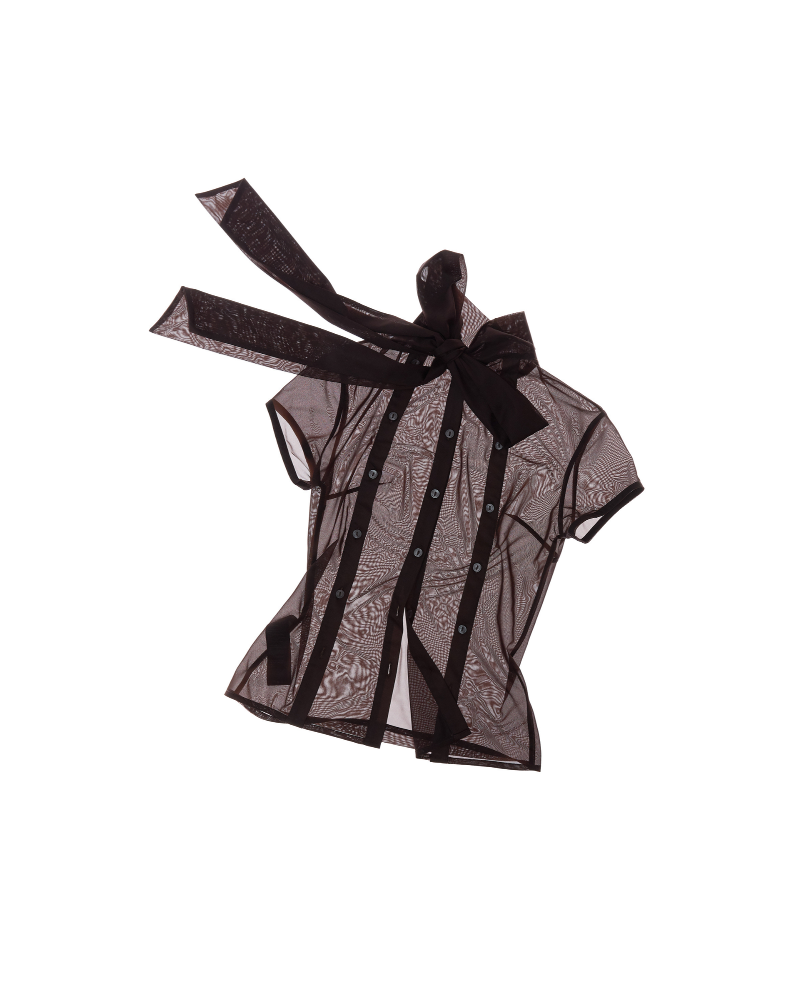 Fitted blouse with an unexpected twist: worn in reverse, detailed with 3 row of buttons trailing down the back. The high neck is finished with a self-tie scarf bow. Perfect with capri pants, midi skirts, mini shorts, or layered over a bralette.