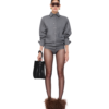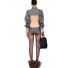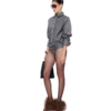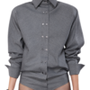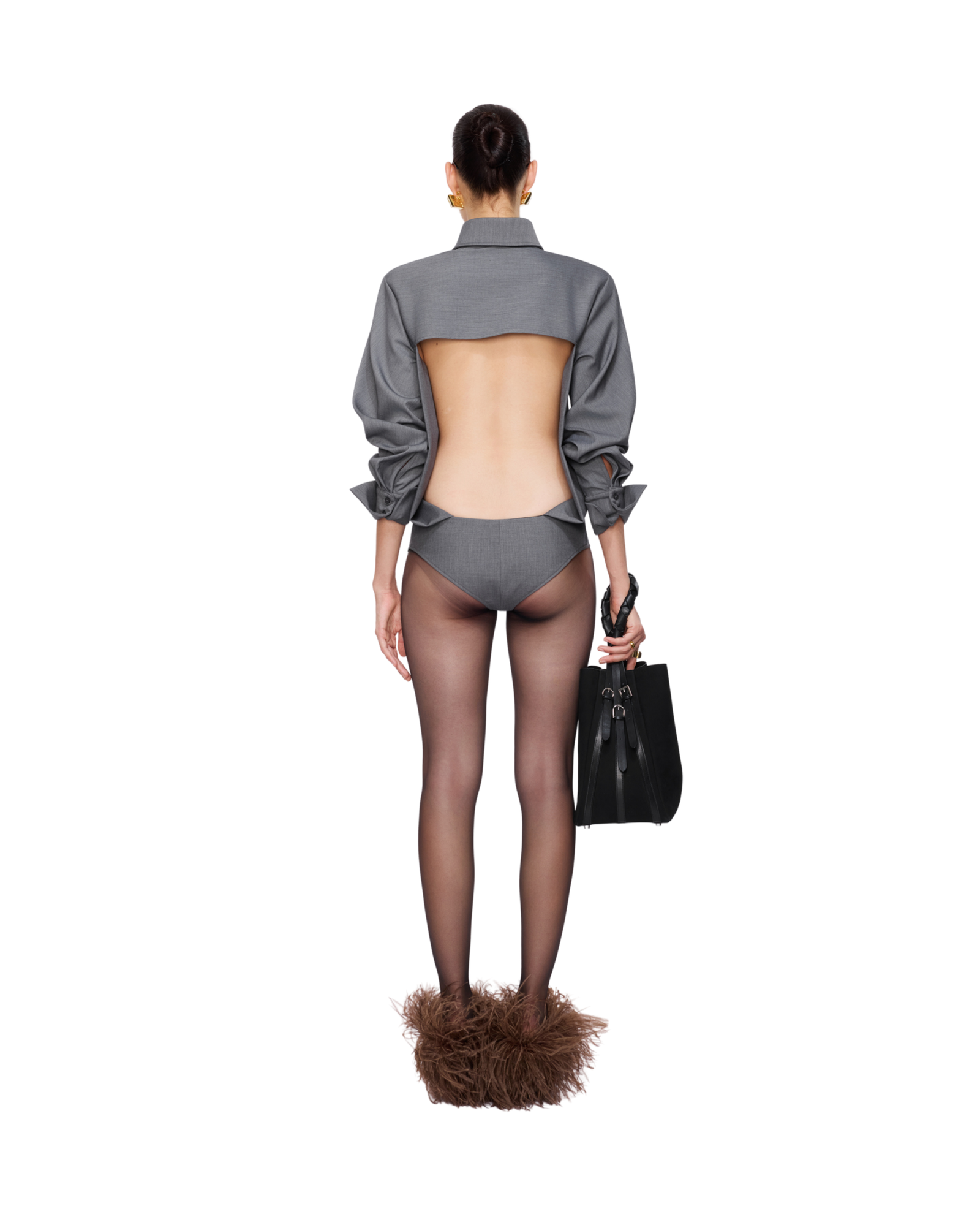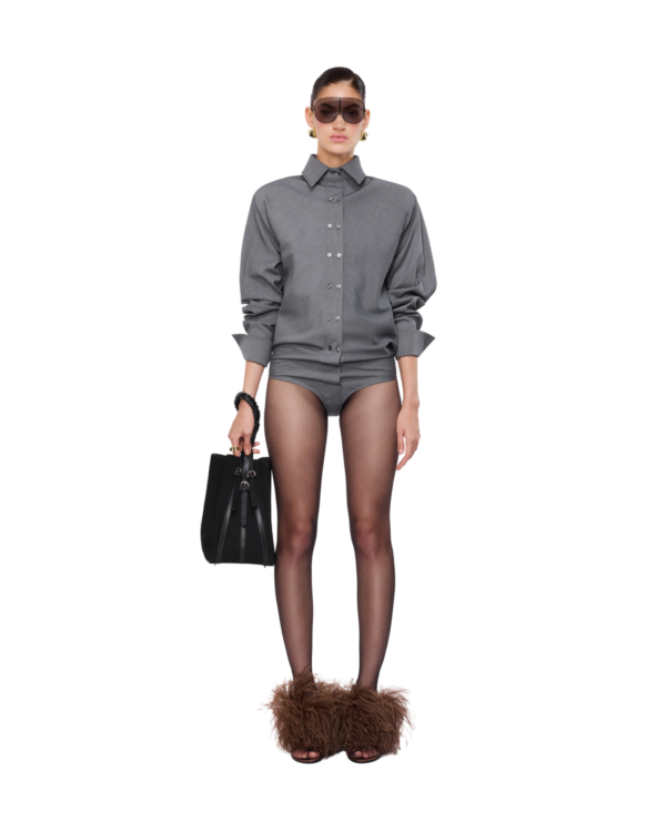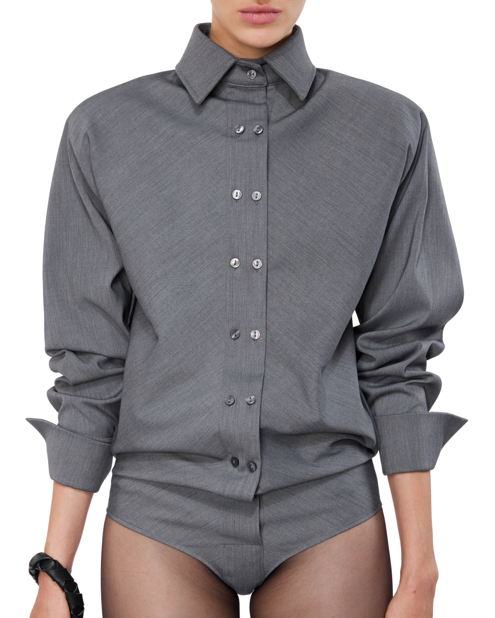 Shirt-style bodysuit Spread collar Double button front closure Open back design One-button barrel cuffs