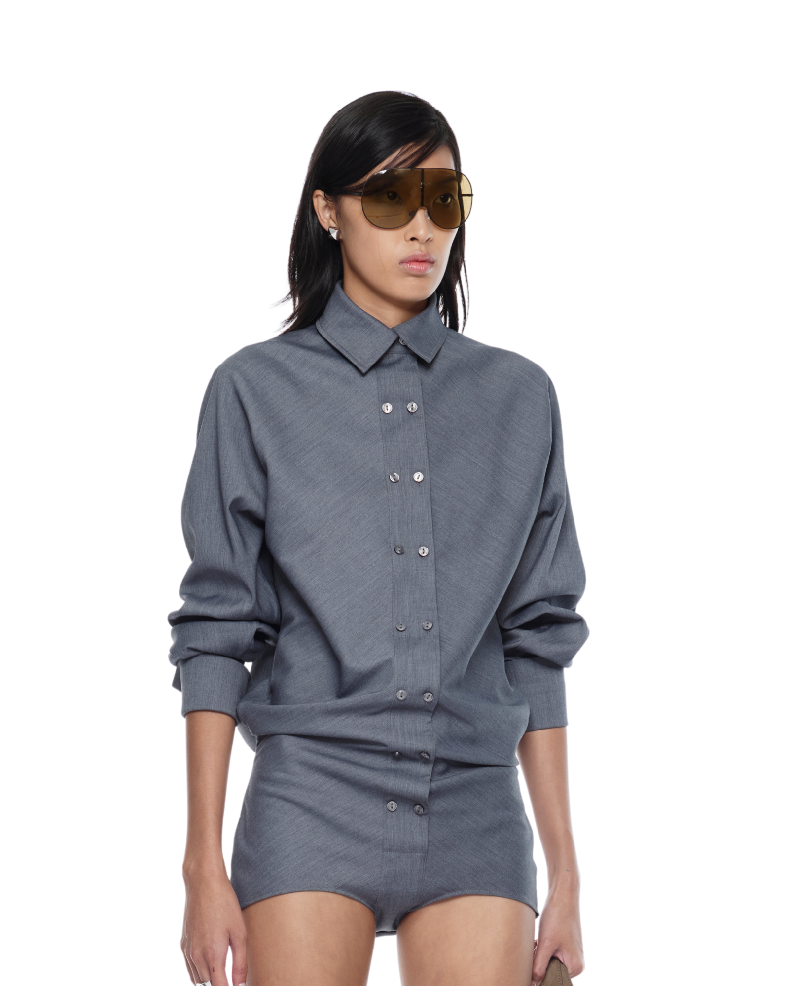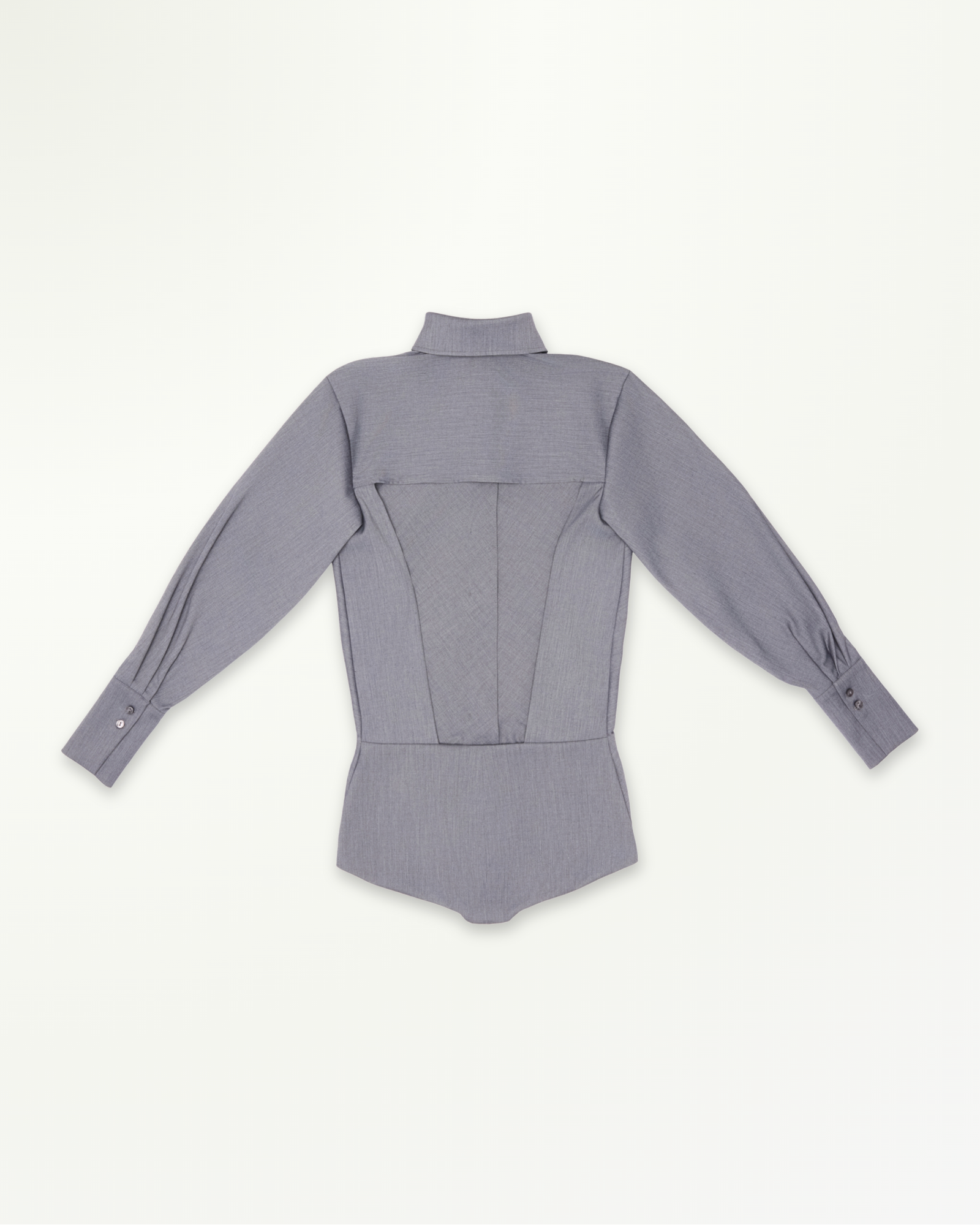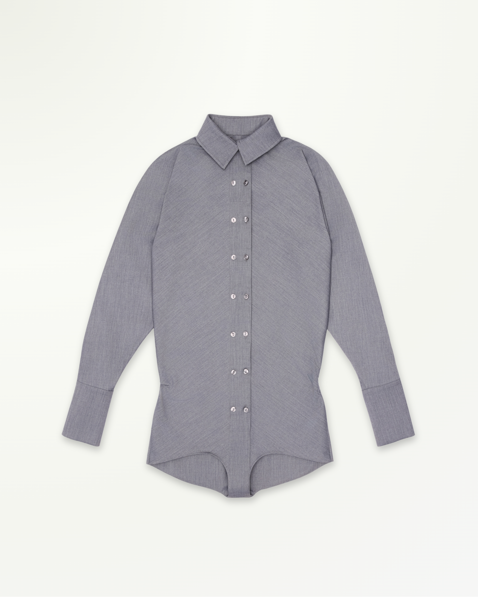 Shirt-style bodysuit with a high-cut, open-back design, long dolman sleeves, double button rows at front. A sleek silhouette, perfect paired with mini skirts or capri pants.