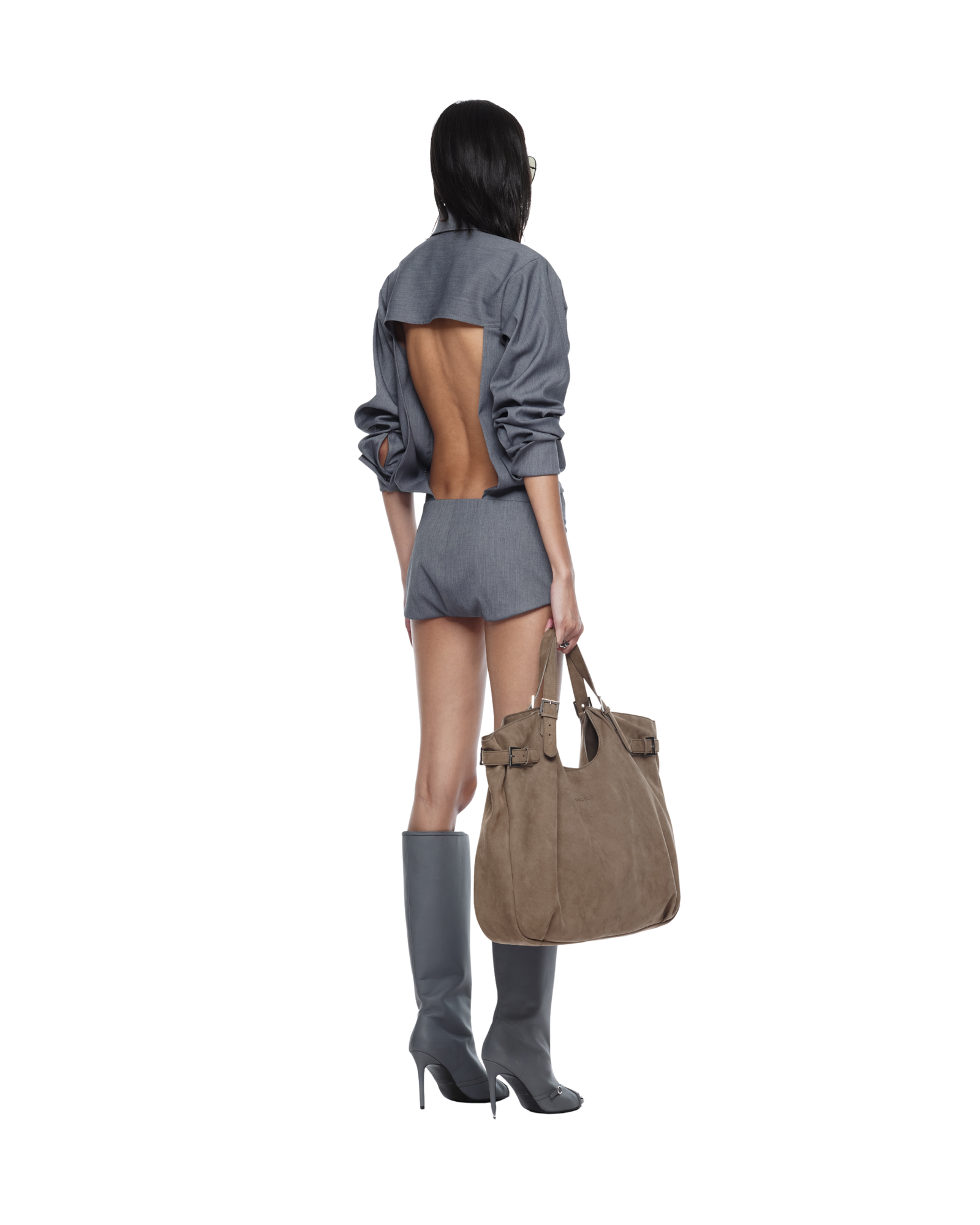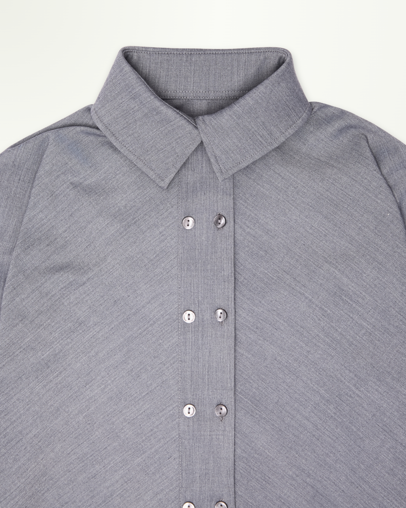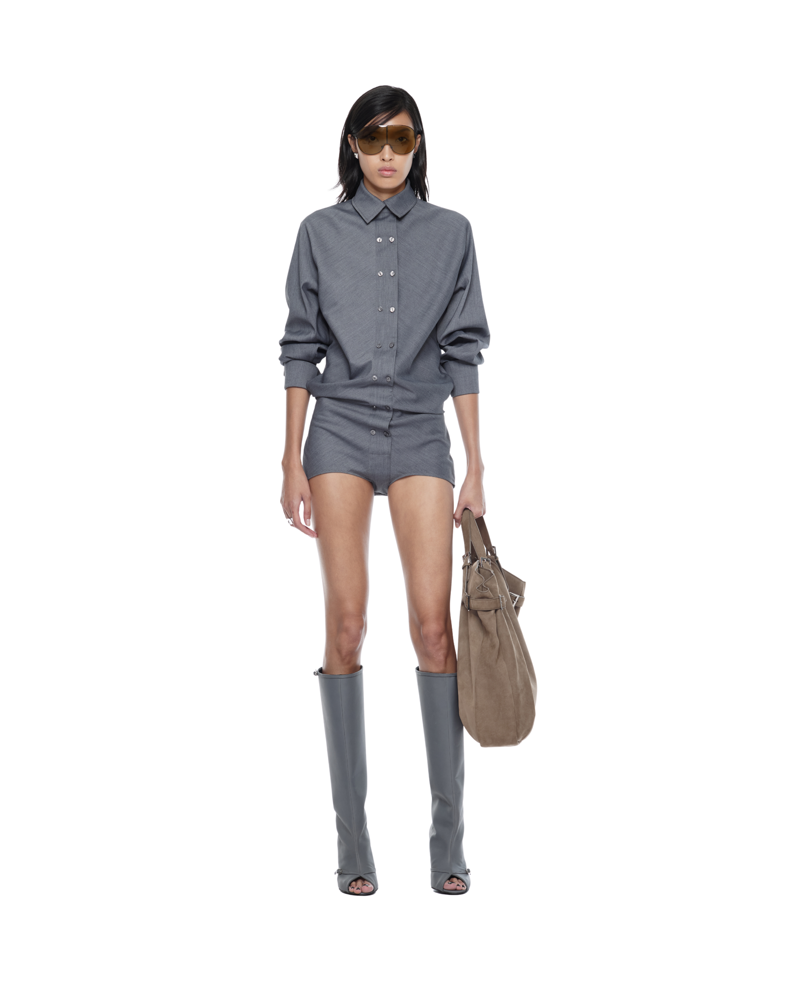 Shirt-style bodysuit with a high-cut, open-back design, long dolman sleeves, double button rows at front. A sleek silhouette, perfect paired with mini skirts or capri pants.