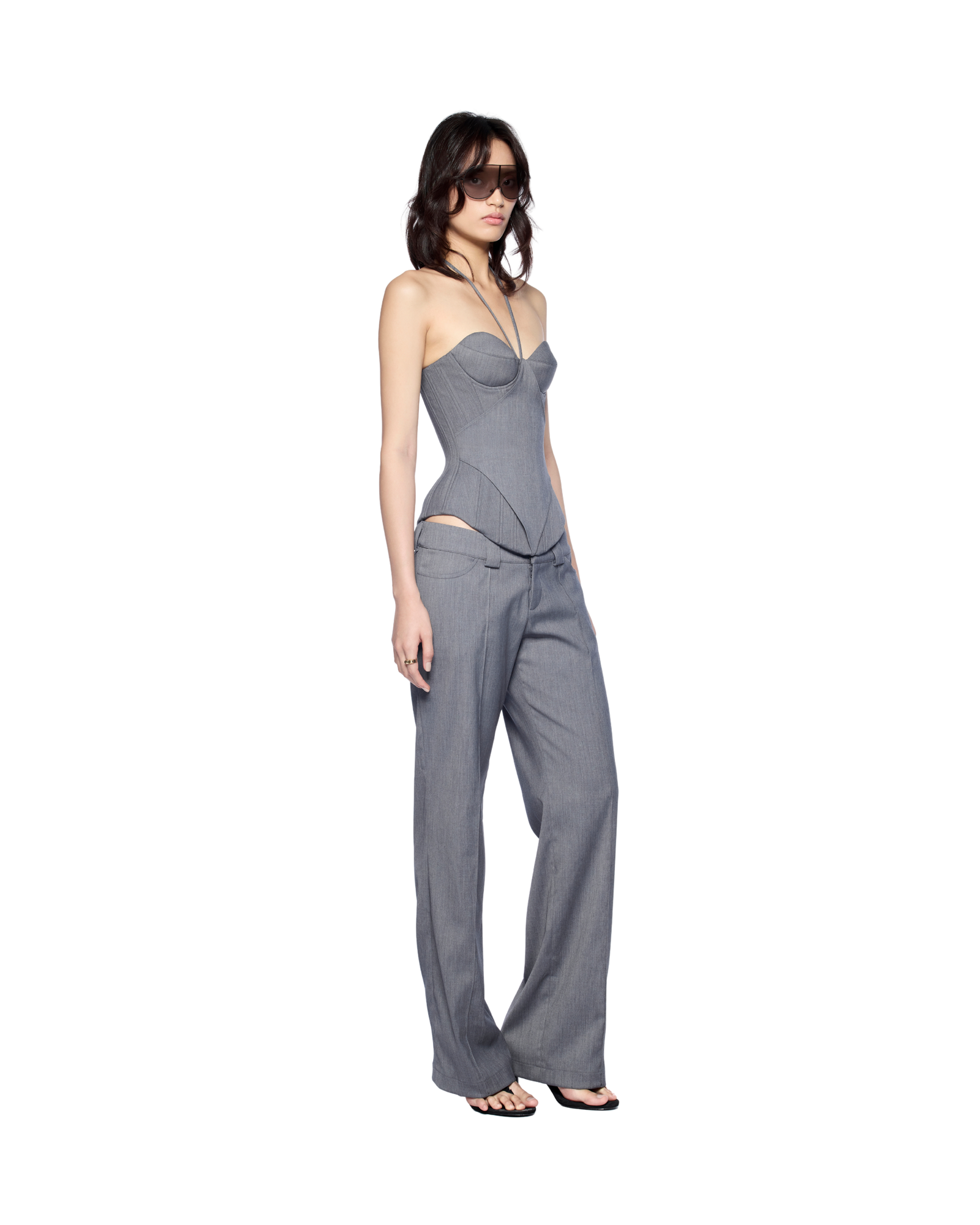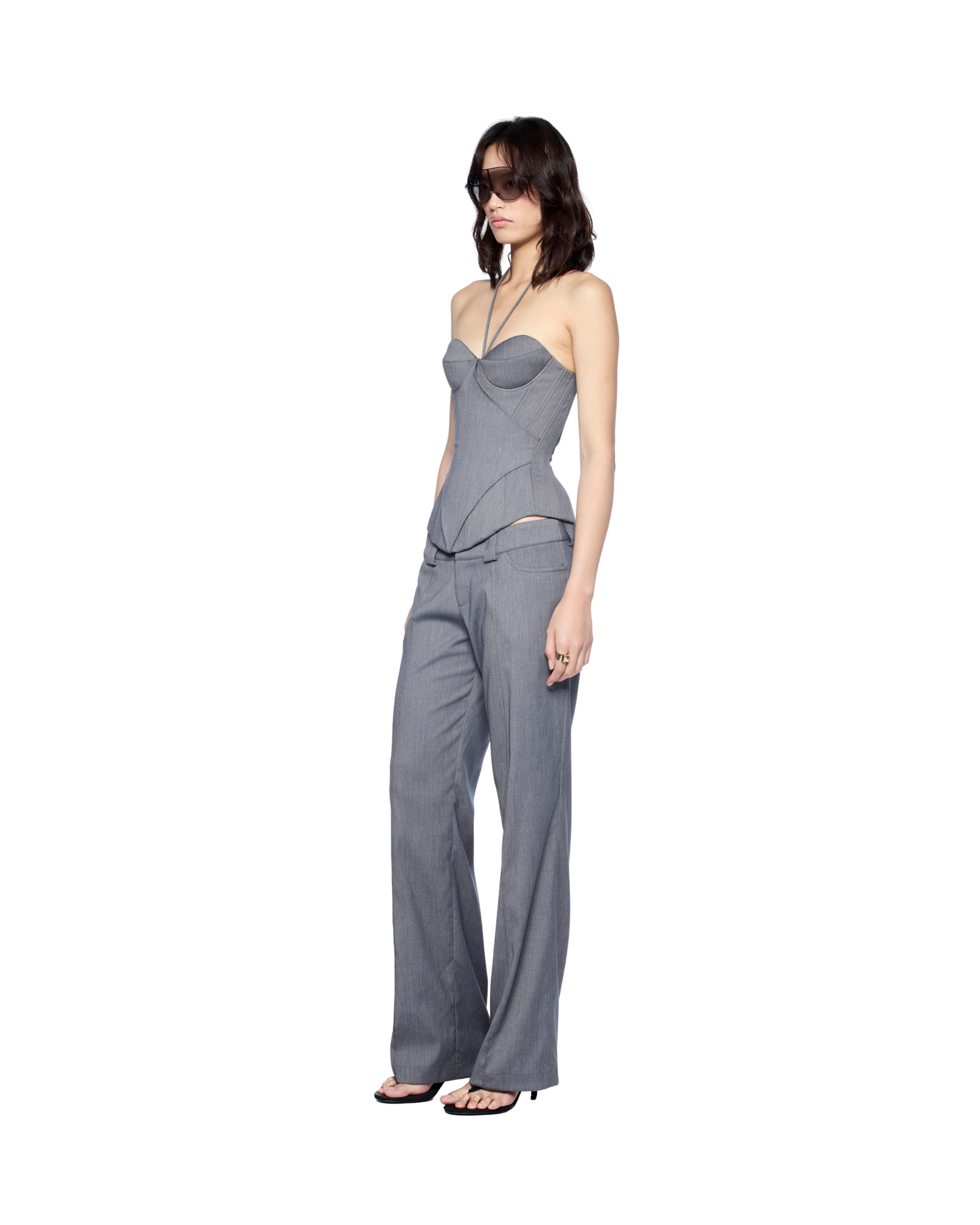 A tailored pants with clean pinched seams down the front and a relaxed straight-leg cut. The oversized belt loops and low-rise waist lend a subtle twist to the classic tailoring. Pair effortlessly with a corset, crisp shirt, or soft knit for contrast.
