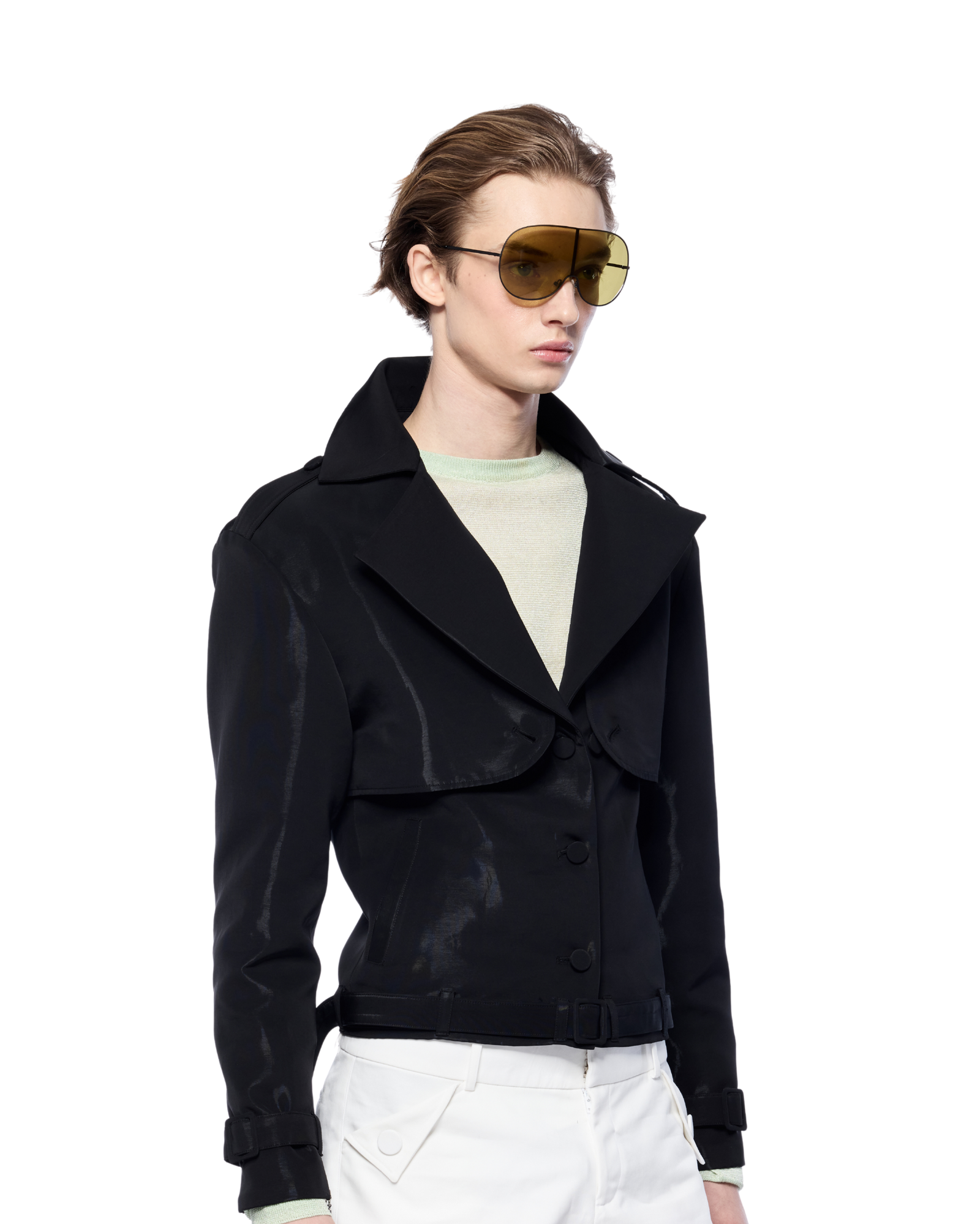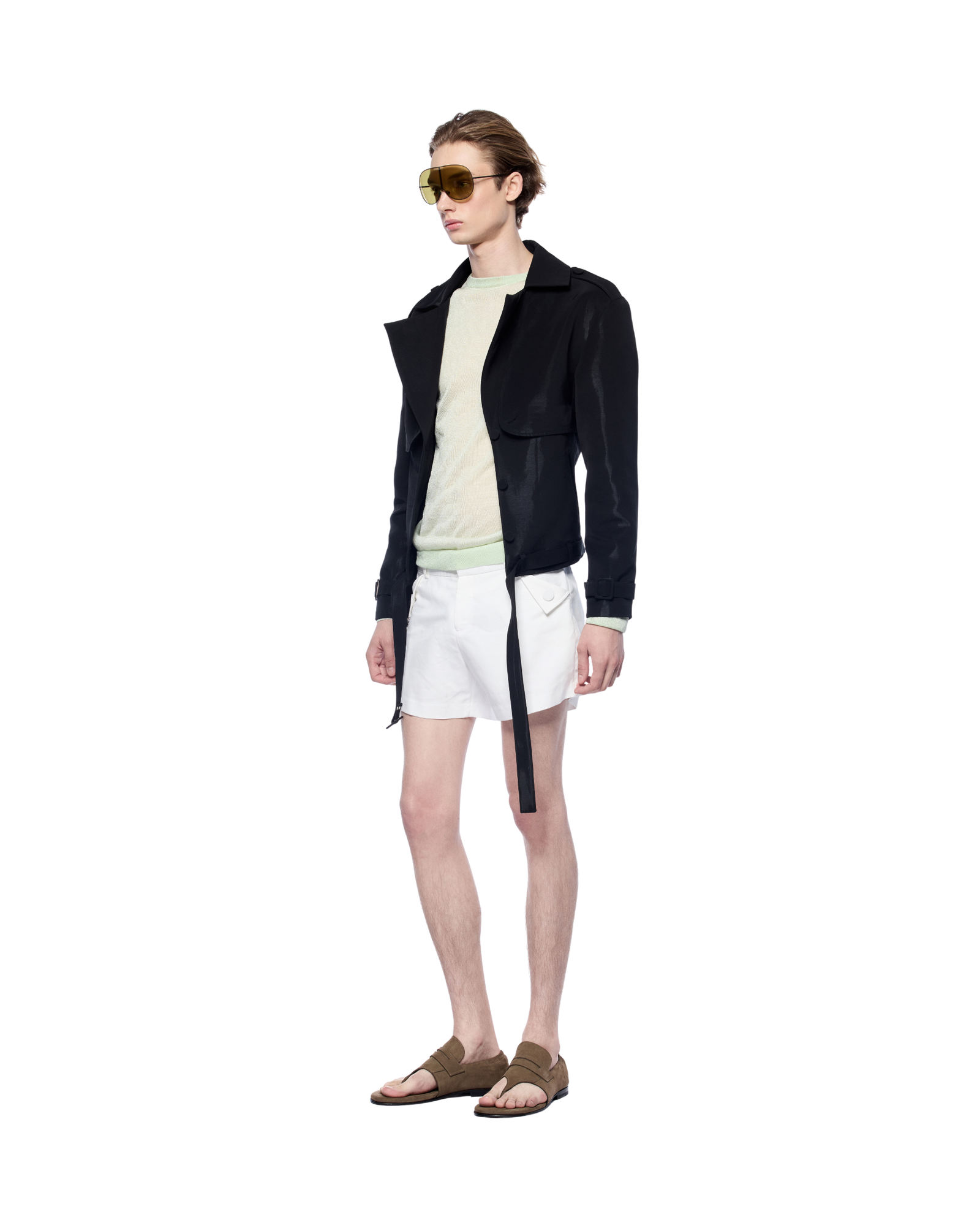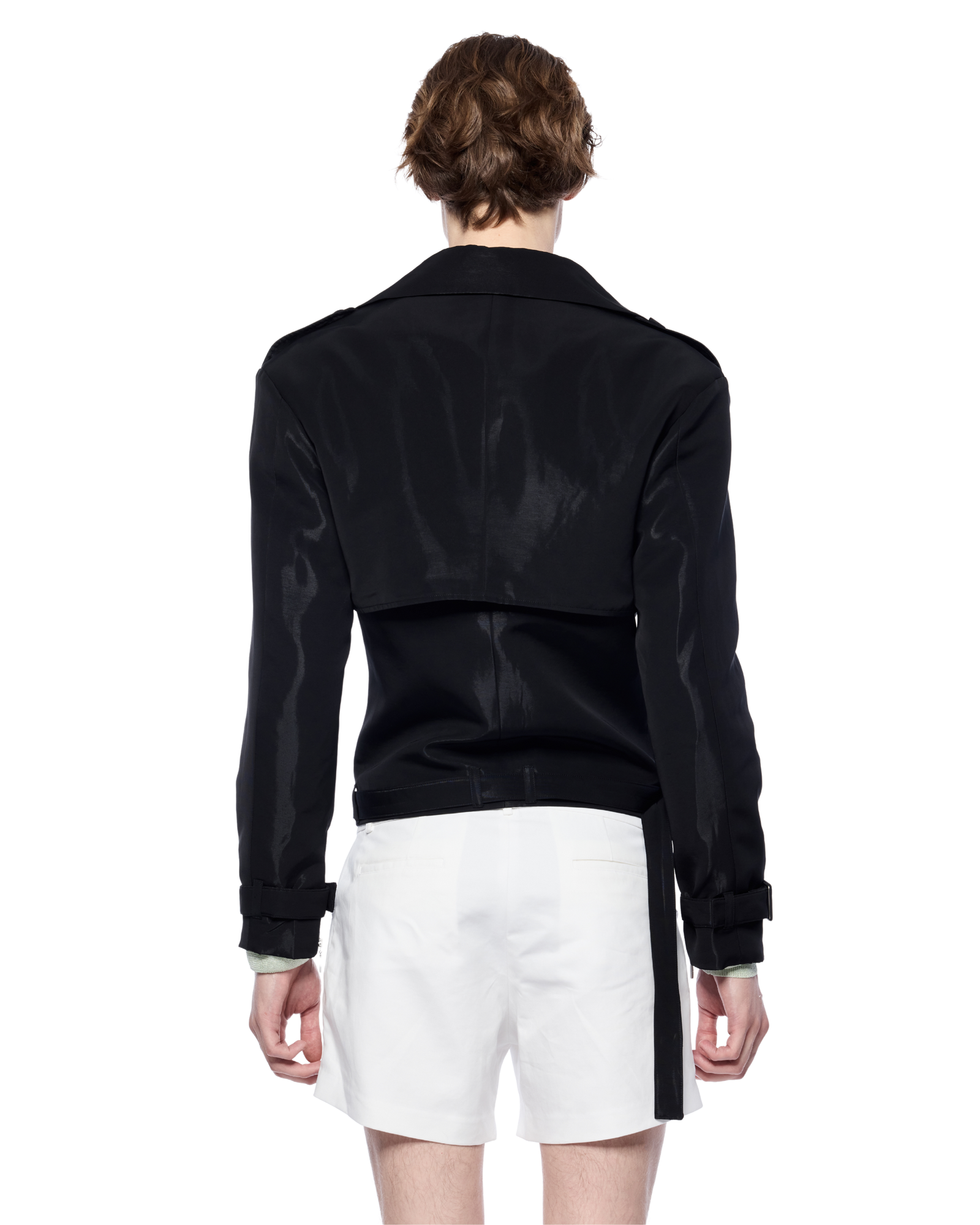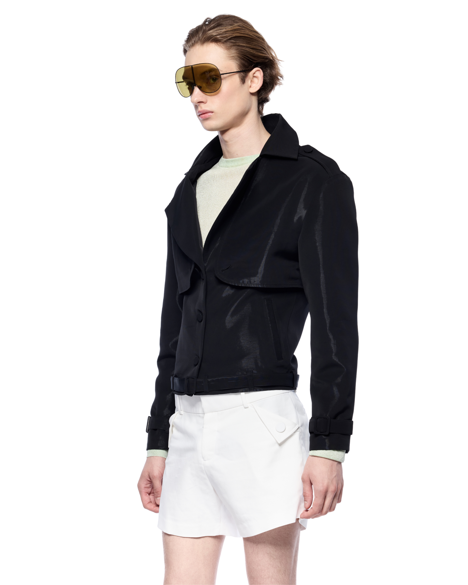 Sport blazer with a cropped silhouette thats make it easy to pair with shorts or straight-leg trousers. Fabric has a soft touch with a subtle sheen, structured enough to hold its shape