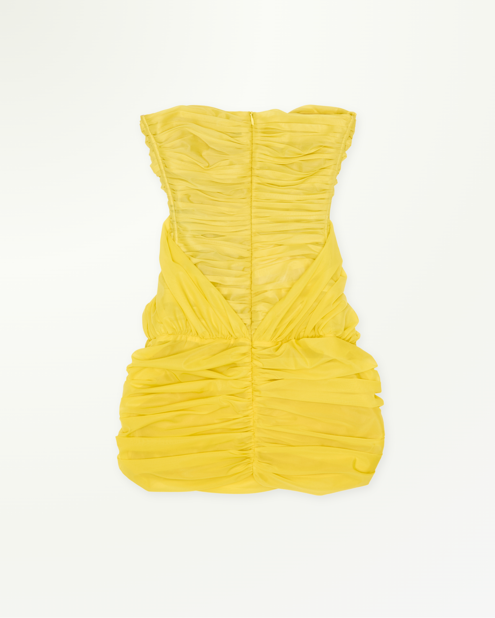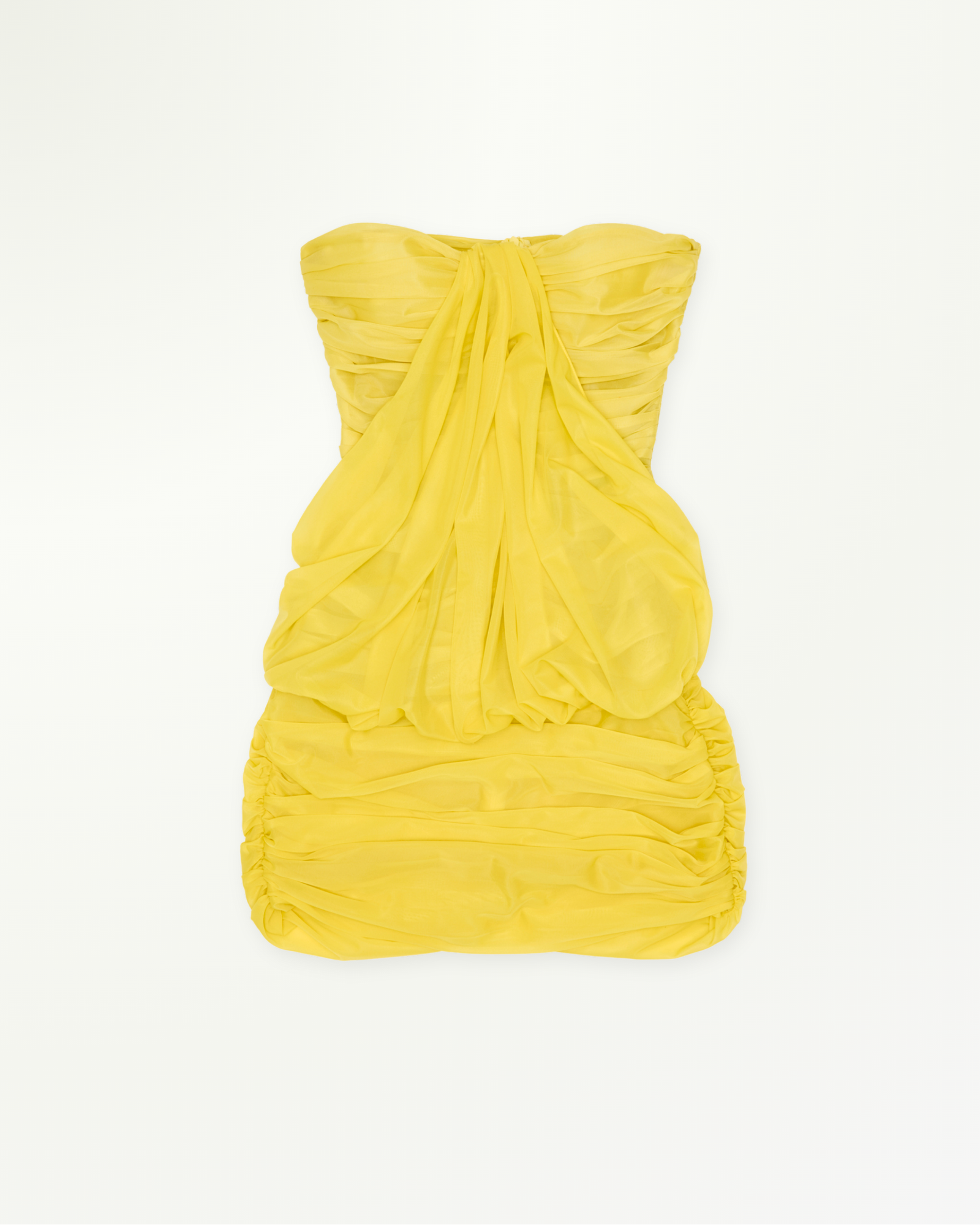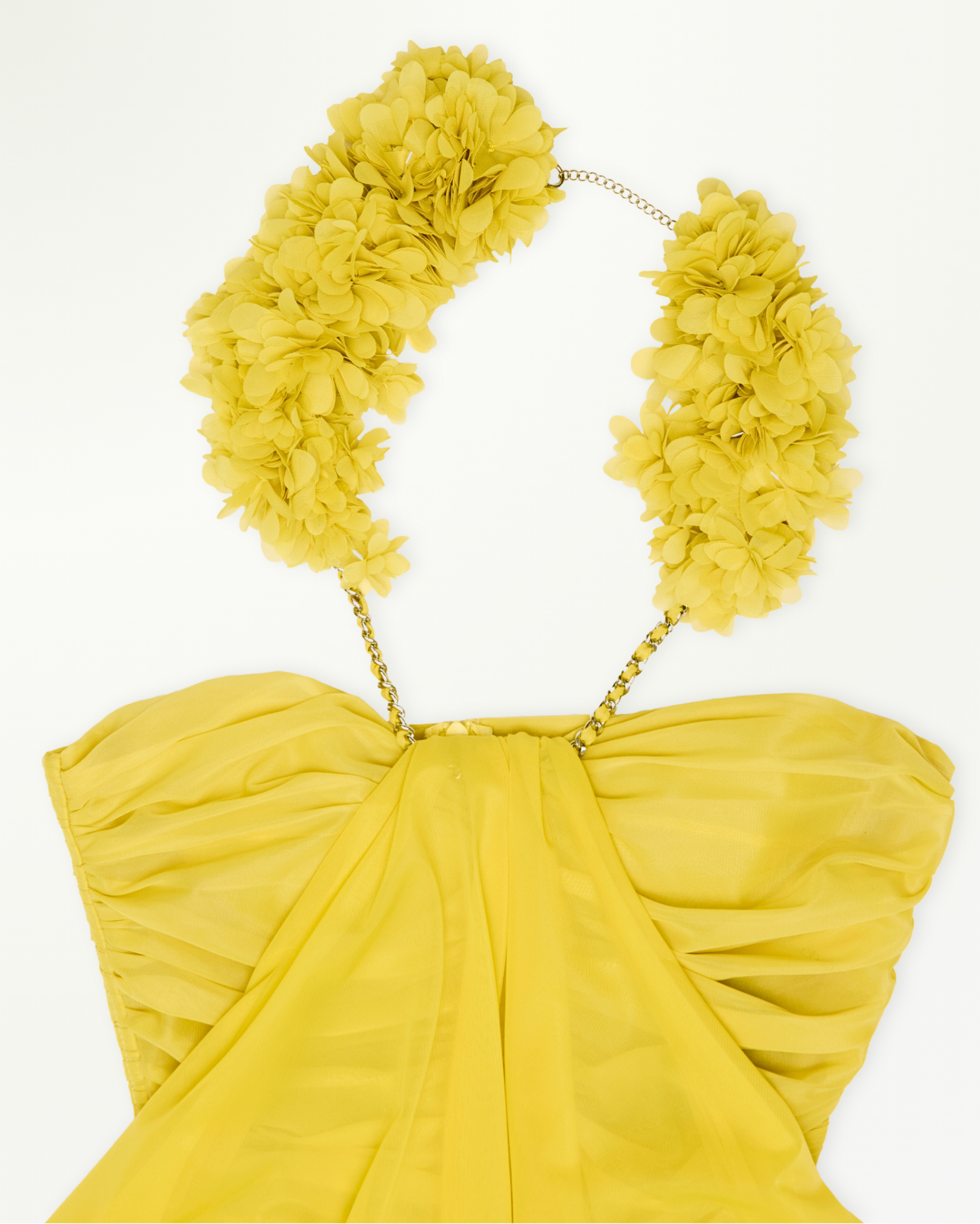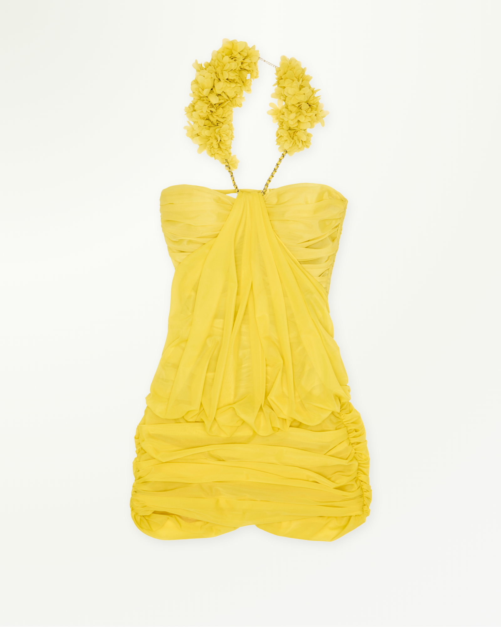 A draped chiffon mini dress designed with internal boning for a cinched waist and soft ruching that flatters the frame. Finished with a detachable floral halter chain its balances structured and fluidity. Go great with floral or feather headscarf, clutch and shoulder bag.