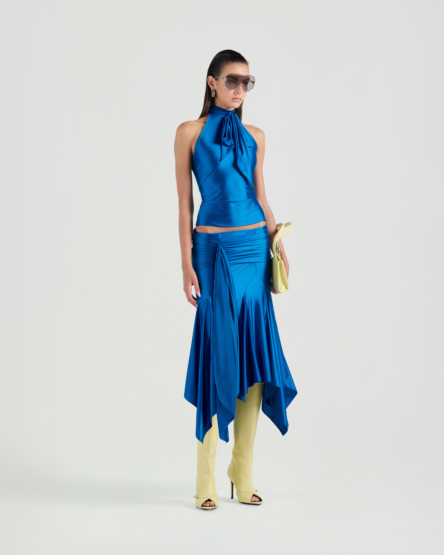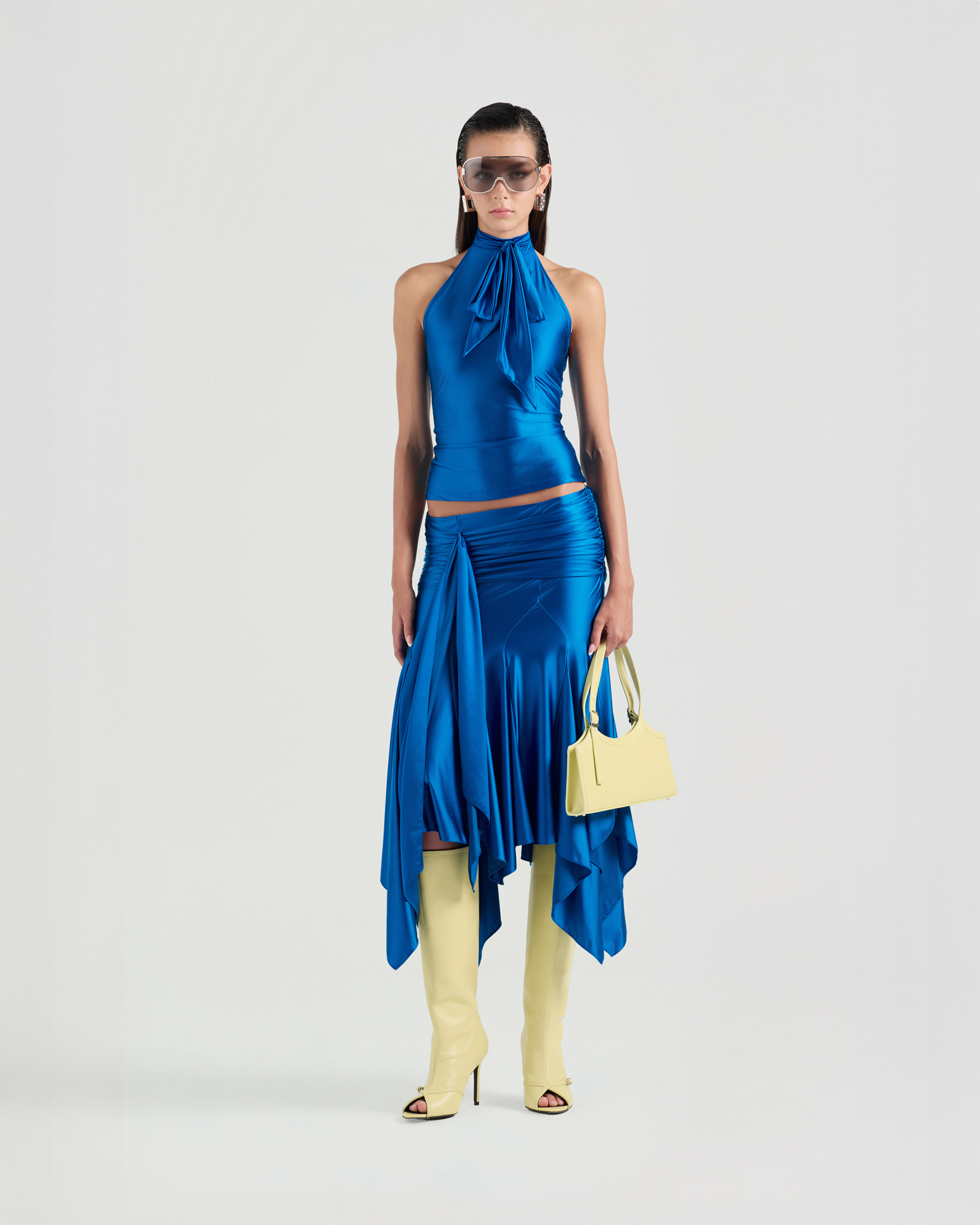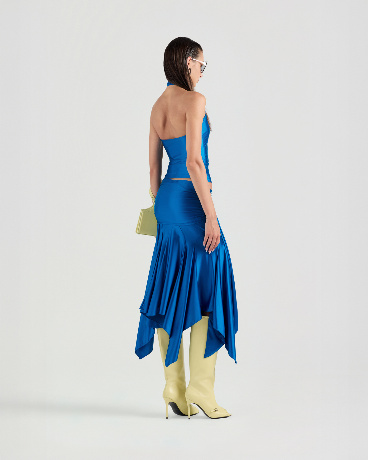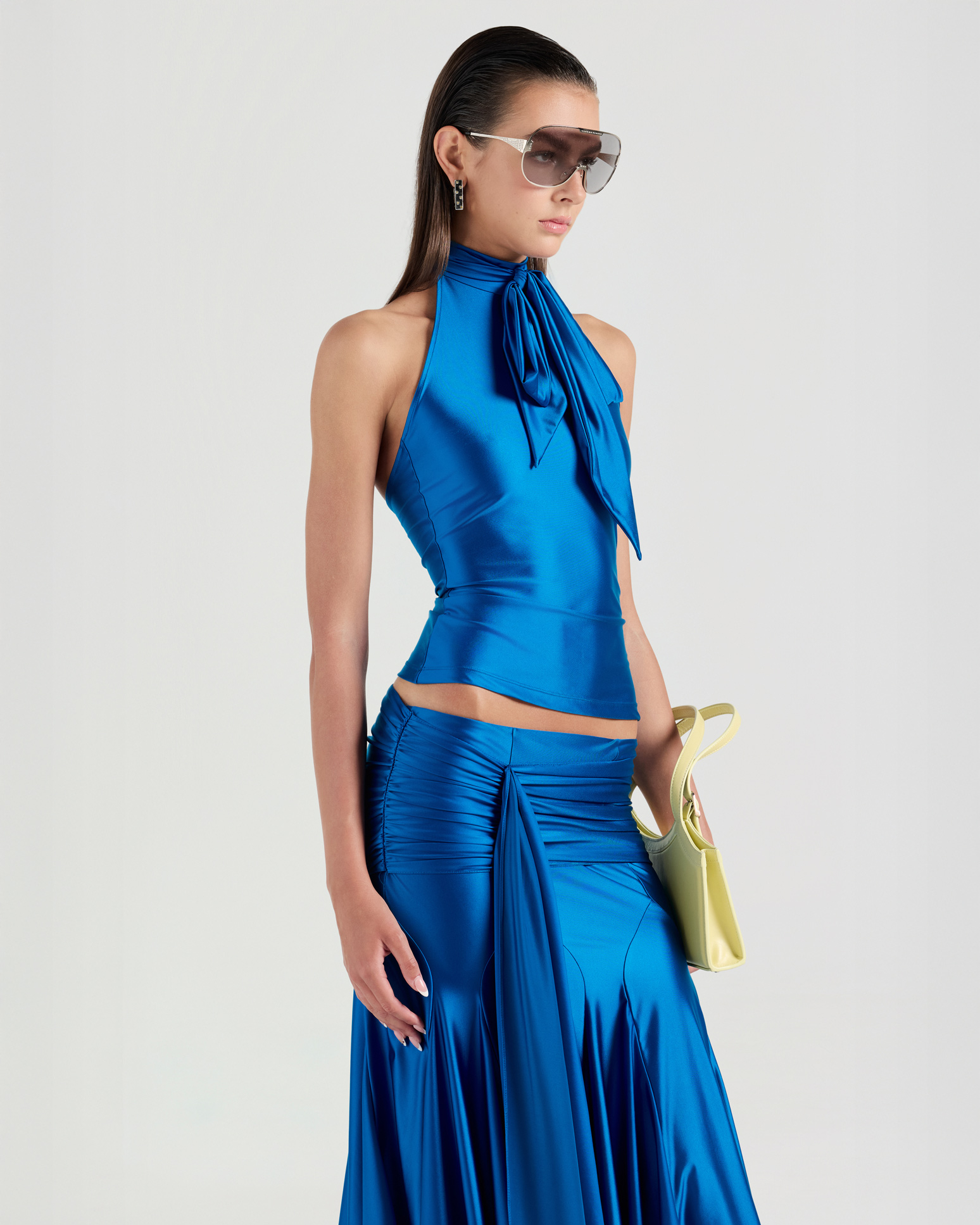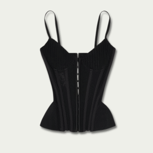 A self-tied bow top cut in a sleek, form-fitting silhouette that contours the body. The adjustable bow detail adds a soft, feminine accent, while the sleeveless cut and open-back design create a refined sense of allure.