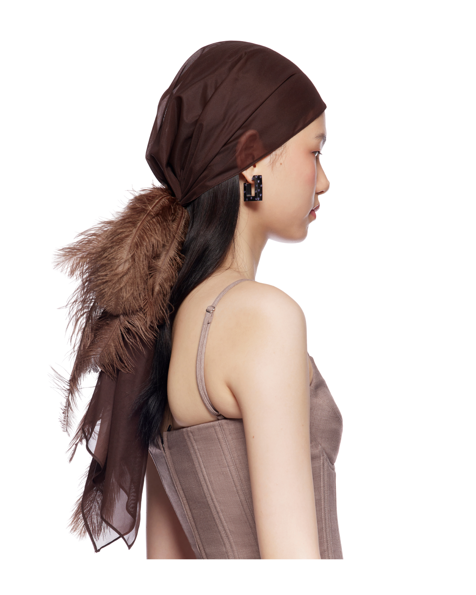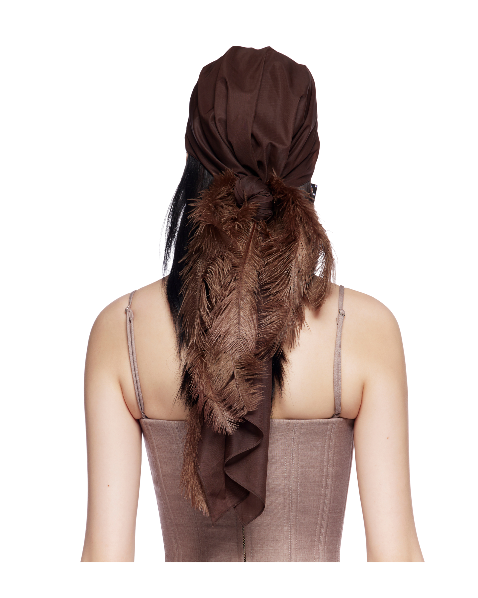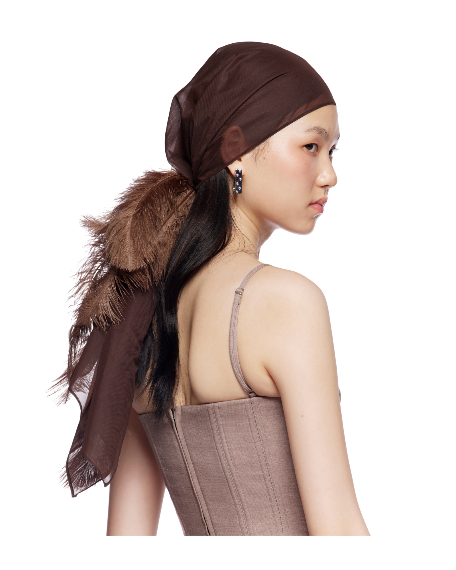 Tied headscarf with hand-embroidered feather appliqués layered at the knot for natural, dramatic movement. Sheer chiffon drapes softly with long flowing ties, perfect with corsets, sheer tops, demi bras, strapless dresses, or camisoles.