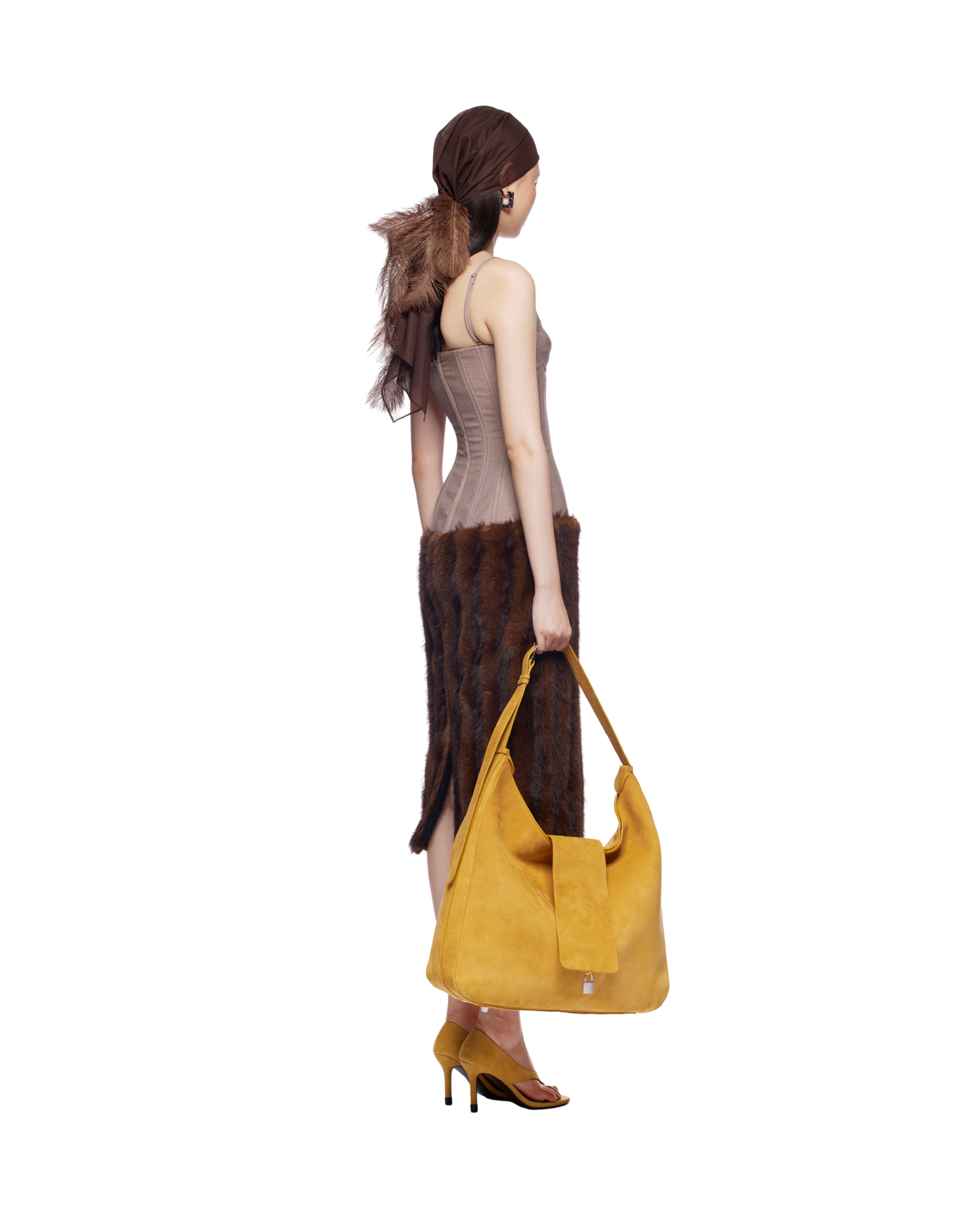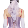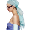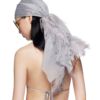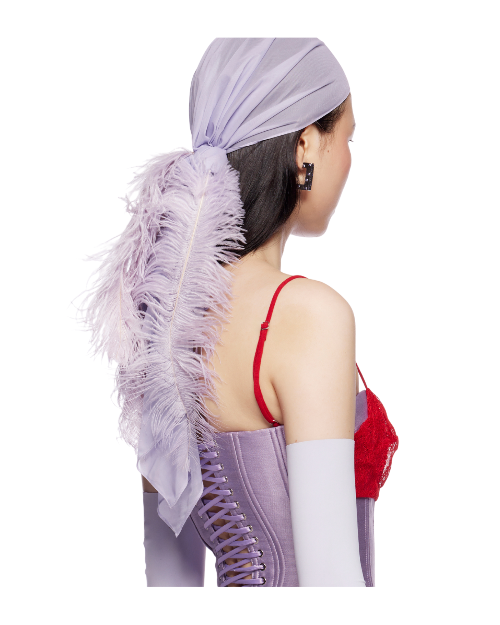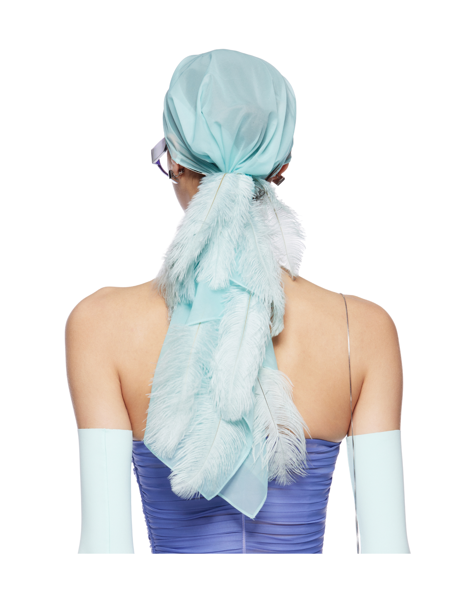 Tied headscarf with hand-embroidered feather appliqués layered at the knot for natural, dramatic movement. Sheer chiffon drapes softly with long flowing ties, perfect with corsets, sheer tops, demi bras, strapless dresses, or camisoles.