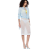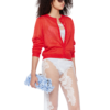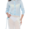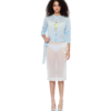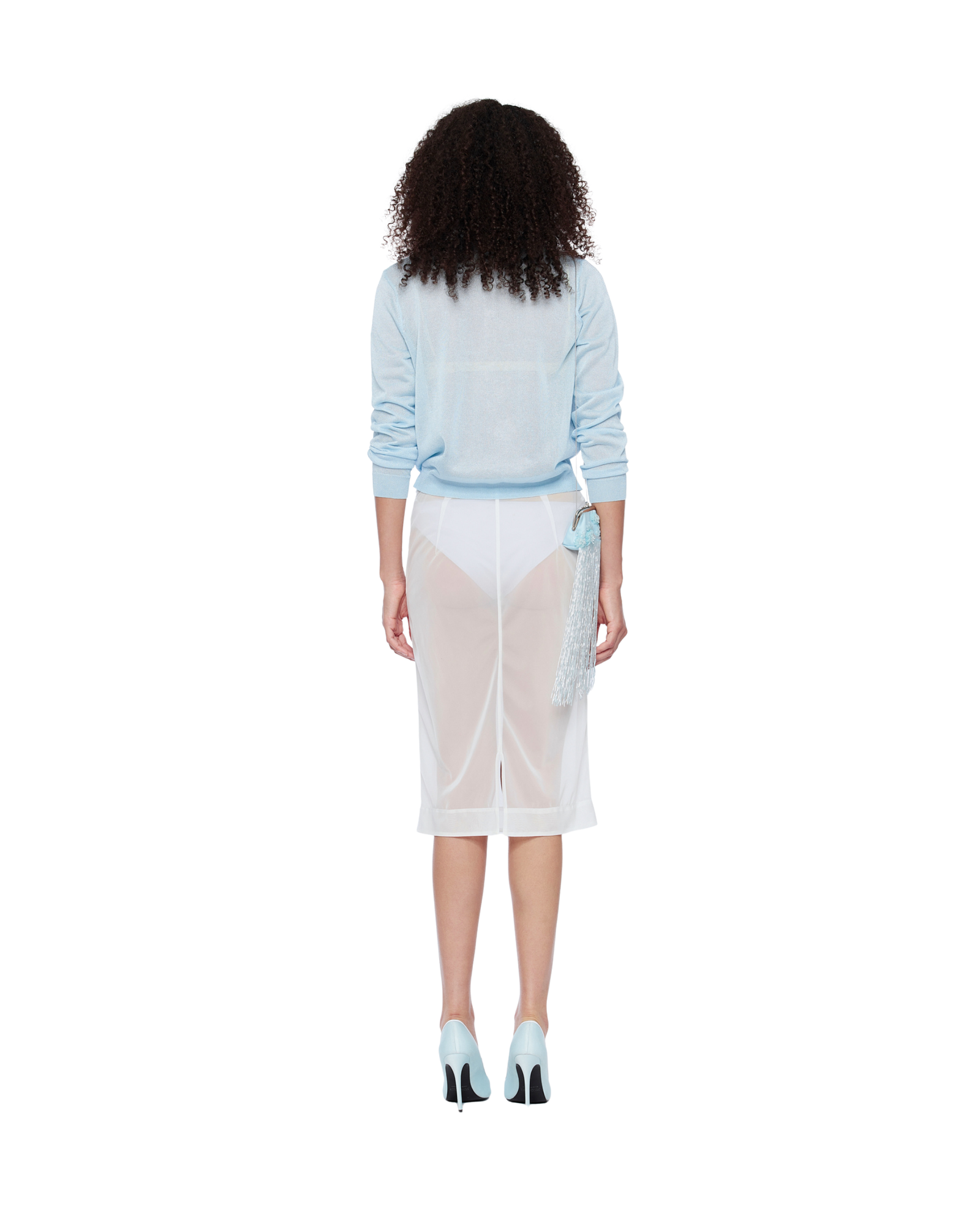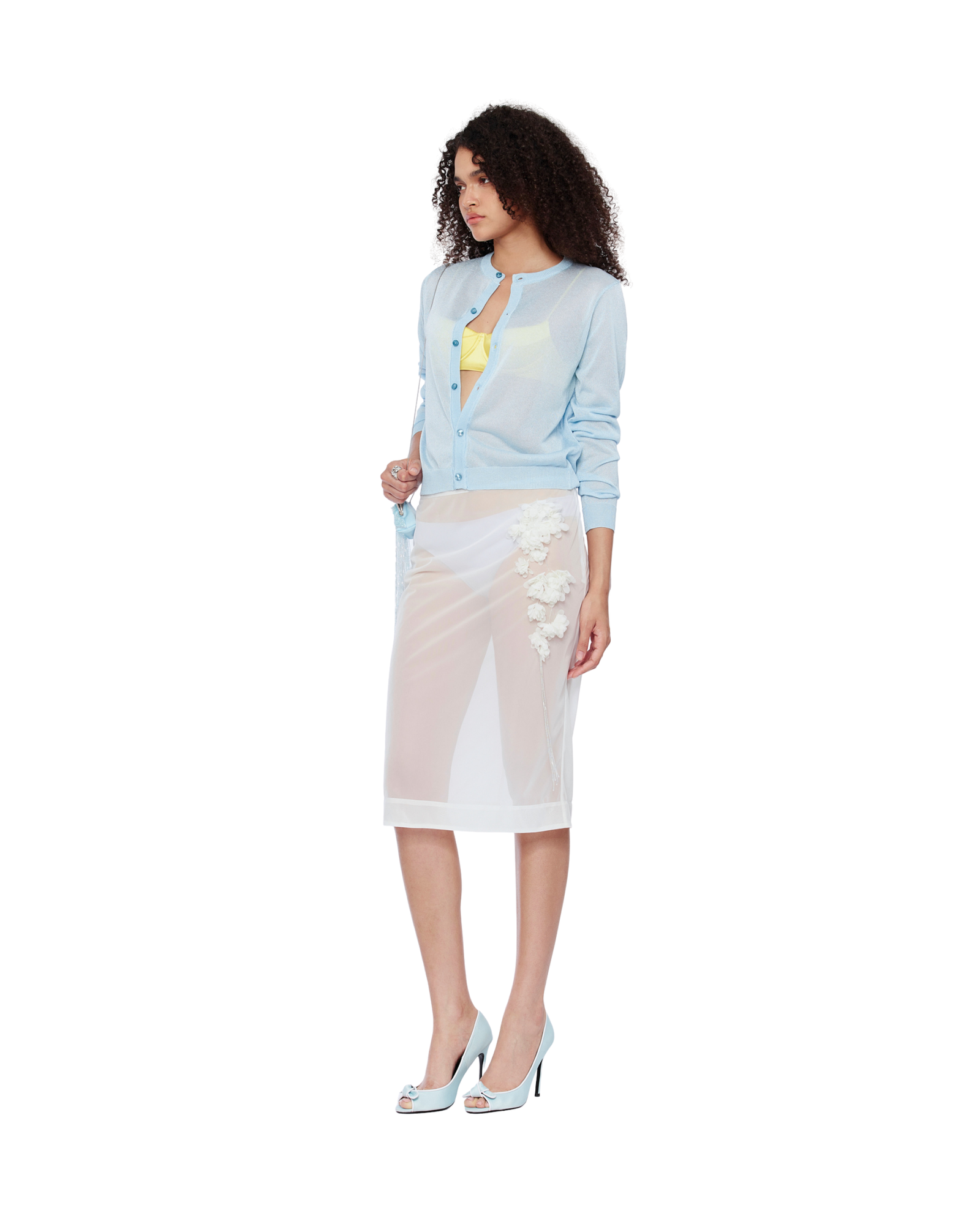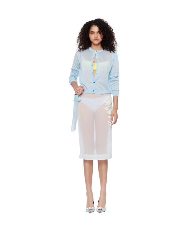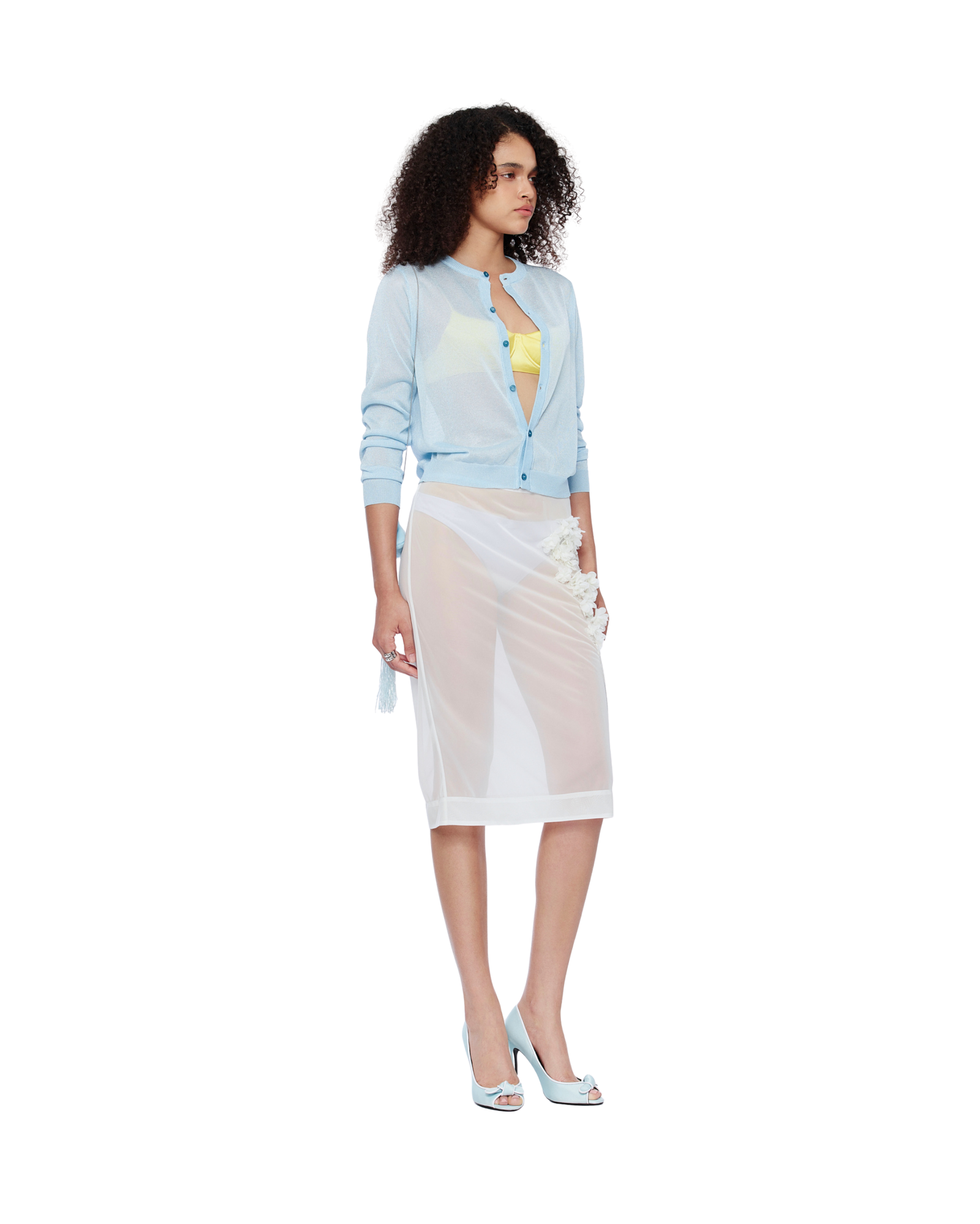 Semi-sheer knit cardigan in a soft pastel tone with a subtle glitter effect. Long sleeves and ribbed edges create a clean silhouette while layering over tops, skirts, or trousers for a polished look.