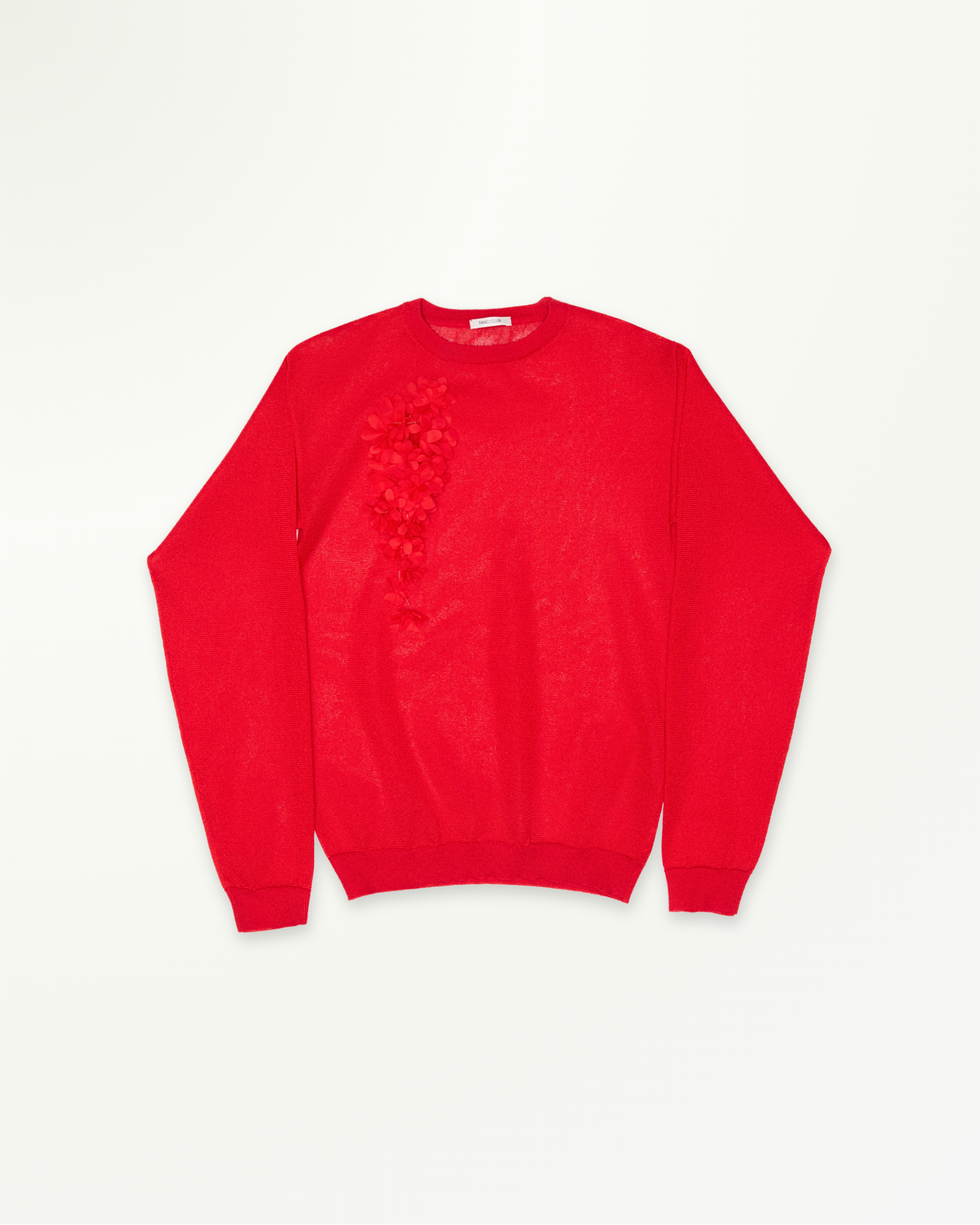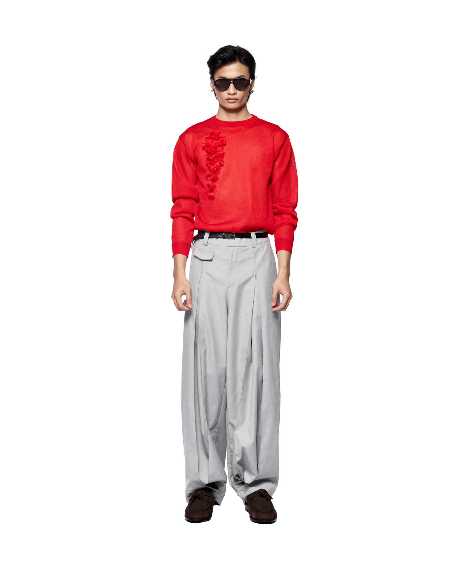 A classic wool sweater is updated with ribbed trims and an asymmetrical 3D floral embellishment for a subtle statement. Easy to layer under a shirt or blazer, it also pairs well with tailored shorts or straight-leg trousers.