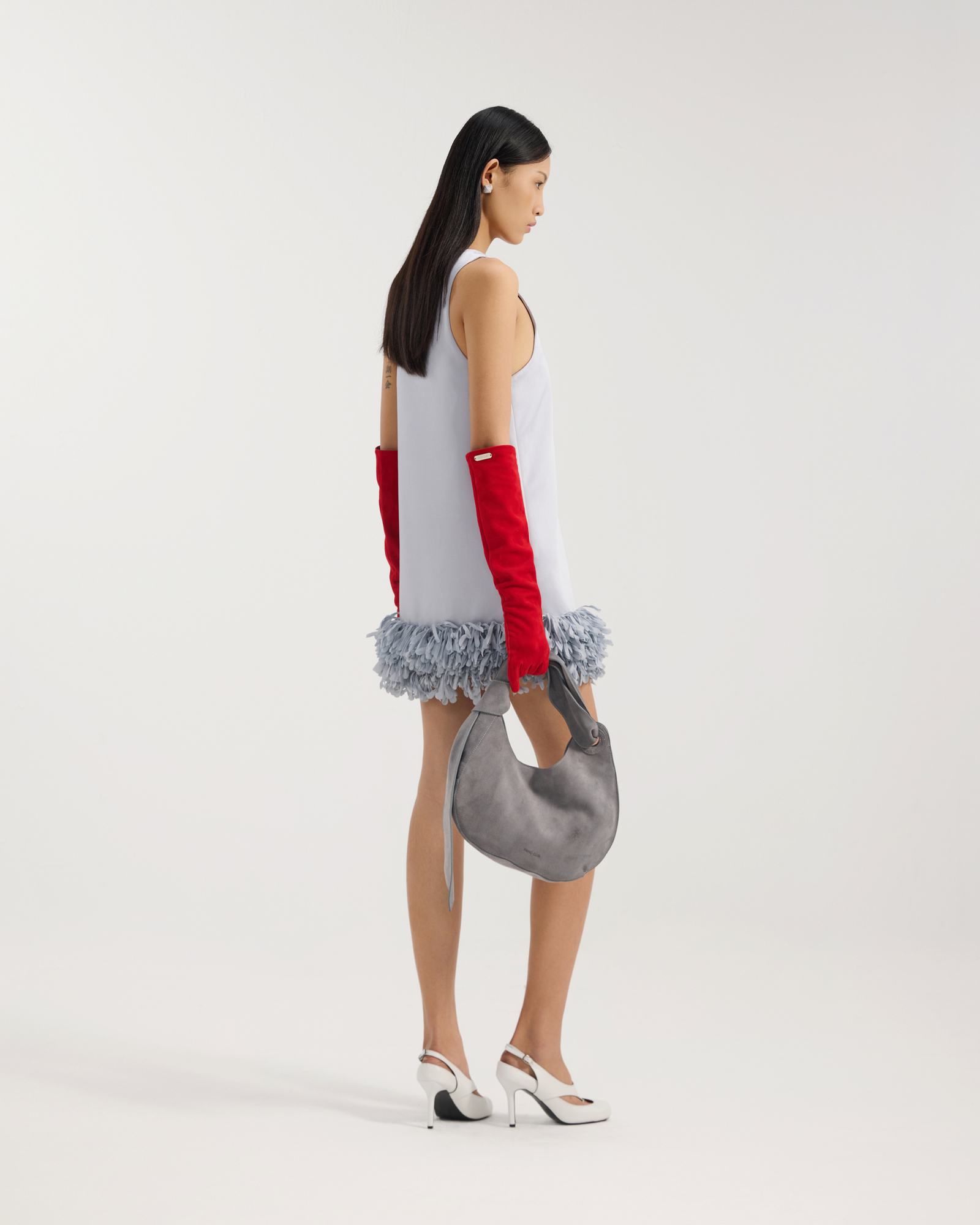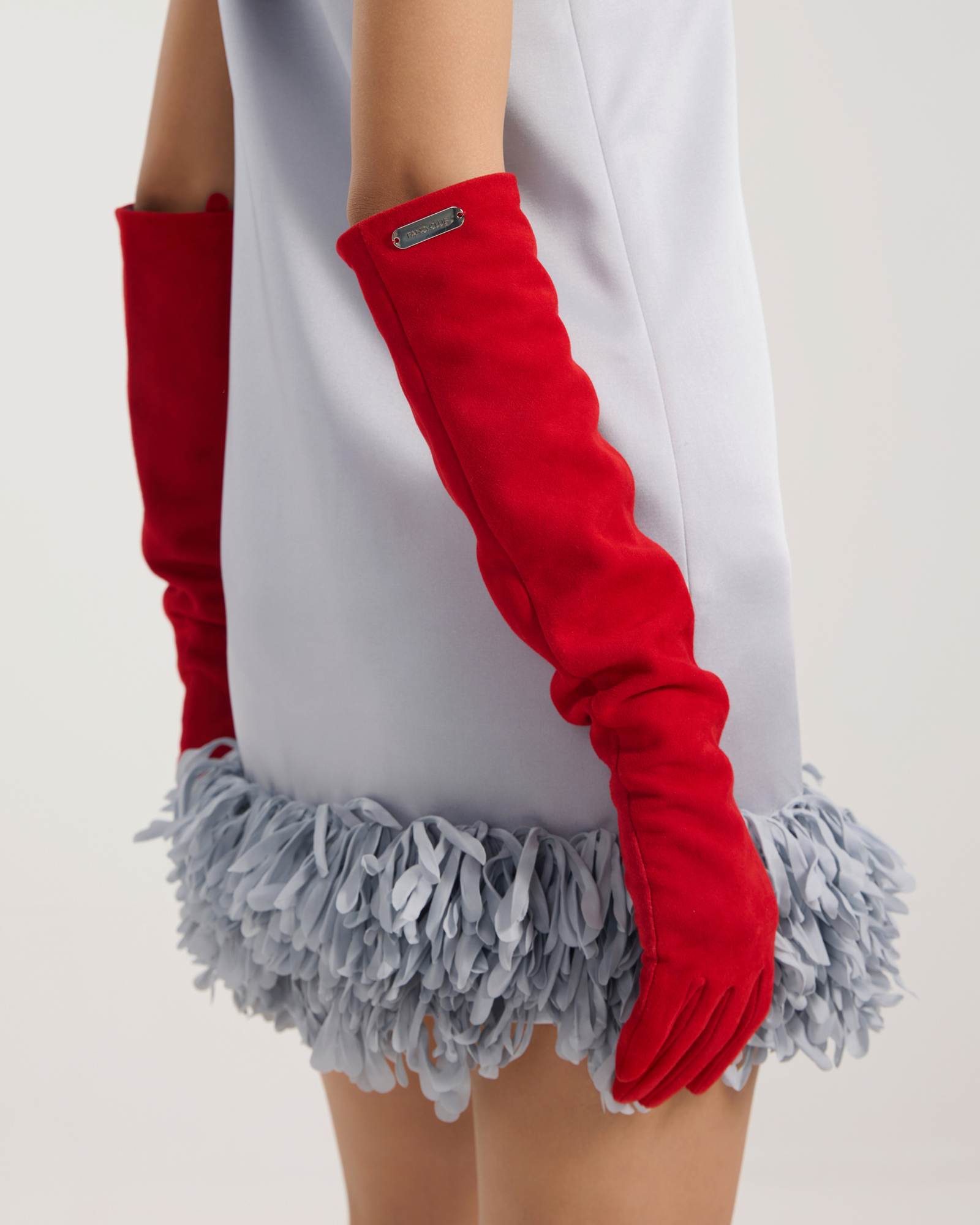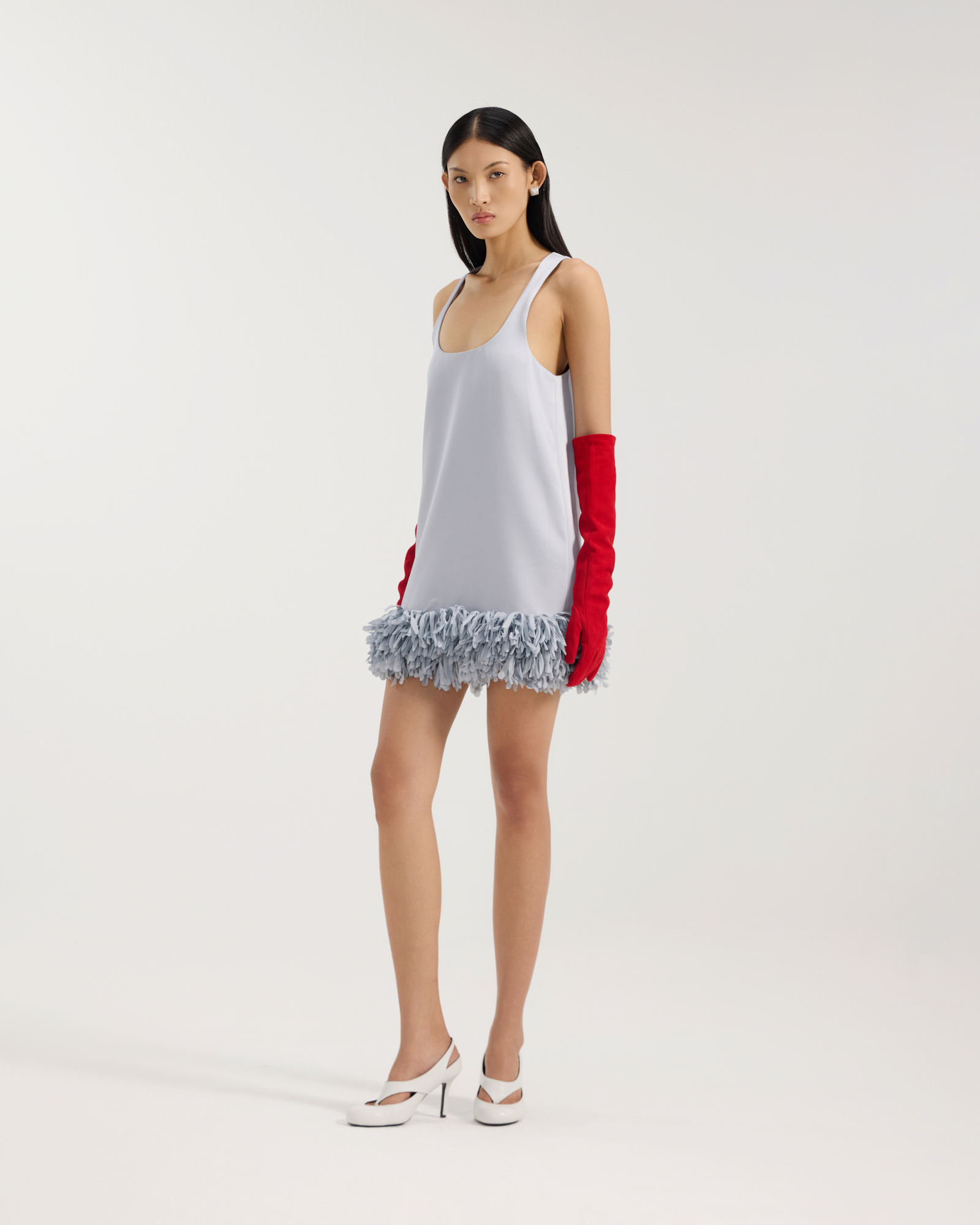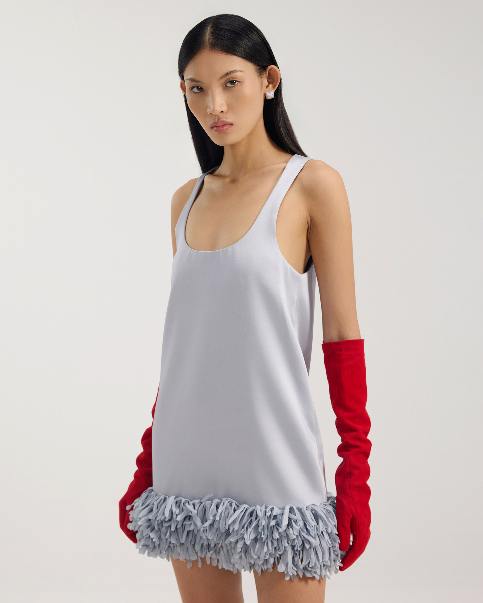 Featuring a shift mini dress crafted from smooth, lustrous satin, accented with floral trim at the hem for a feminine touch. The design is completed through 14 hours of meticulous hand-finishing. Finished with a side zip closure and fully lined for comfort and structure.